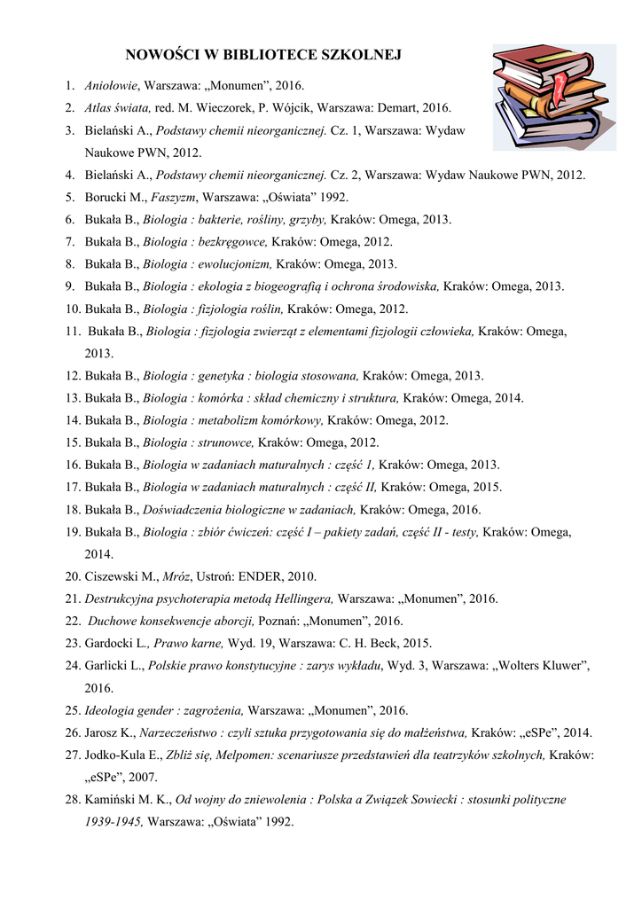 NOWOŚCI W BIBLIOTECE SZKOLNEJ 1. Aniołowie, Warszawa: „Monumen”, 2016. 2. Atlas świata, red. M. Wieczorek, P. Wójcik, Warszawa: Demart, 2016. 3. Bielański A., Podstawy chemii nieorganicznej. Cz. 1, Warszawa: Wydaw Naukowe PWN, 2012. 4. Bielański A., Podstawy chemii nieorganicznej. Cz. 2, Warszawa: Wydaw Naukowe PWN, 2012. 5. Borucki M., Faszyzm, Warszawa: „Oświata” 1992. 6. Bukała B., Biologia : bakterie, rośliny, grzyby, Kraków: Omega, 2013. 7. Bukała B., Biologia : bezkręgowce, Kraków: Omega, 2012. 8. Bukała B., Biologia : ewolucjonizm, Kraków: Omega, 2013. 9. Bukała B., Biologia : ekologia z biogeografią i ochrona środowiska, Kraków: Omega, 2013. 10. Bukała B., Biologia : fizjologia roślin, Kraków: Omega, 2012. 11. Bukała B., Biologia : fizjologia zwierząt z elementami fizjologii człowieka, Kraków: Omega, 2013. 12. Bukała B., Biologia : genetyka : biologia stosowana, Kraków: Omega, 2013. 13. Bukała B., Biologia : komórka : skład chemiczny i struktura, Kraków: Omega, 2014. 14. Bukała B., Biologia : metabolizm komórkowy, Kraków: Omega, 2012. 15. Bukała B., Biologia : strunowce, Kraków: Omega, 2012. 16. Bukała B., Biologia w zadaniach maturalnych : część 1, Kraków: Omega, 2013. 17. Bukała B., Biologia w zadaniach maturalnych : część II, Kraków: Omega, 2015. 18. Bukała B., Doświadczenia biologiczne w zadaniach, Kraków: Omega, 2016. 19. Bukała B., Biologia : zbiór ćwiczeń: część I – pakiety zadań, część II - testy, Kraków: Omega, 2014. 20. Ciszewski M., Mróz, Ustroń: ENDER, 2010. 21. Destrukcyjna psychoterapia metodą Hellingera, Warszawa: „Monumen”, 2016. 22. Duchowe konsekwencje aborcji, Poznań: „Monumen”, 2016. 23. Gardocki L., Prawo karne, Wyd. 19, Warszawa: C. H. Beck, 2015. 24. Garlicki L., Polskie prawo konstytucyjne : zarys wykładu, Wyd. 3, Warszawa: „Wolters Kluwer”, 2016. 25. Ideologia gender : zagrożenia, Warszawa: „Monumen”, 2016. 26. Jarosz K., Narzeczeństwo : czyli sztuka przygotowania się do małżeństwa, Kraków: „eSPe”, 2014. 27. Jodko-Kula E., Zbliż się, Melpomen: scenariusze przedstawień dla teatrzyków szkolnych, Kraków: „eSPe”, 2007. 28. Kamiński M. K., Od wojny do zniewolenia : Polska a Związek Sowiecki : stosunki polityczne 1939-1945, Warszawa: „Oświata” 1992. 29. Klusek J., Centralny Okręg Przemysłowy w gospodarce i obronności II Rzeczypospolitej, Warszawa: „Oświata” 1992. 30. Łaszewski W., Objawienia Maryi przeciw mocy Szatana, Warszawa: „Monumen”, 2015. 31. Łyczewska A., Poza czasem, Lublin: Związek Literatów Polskich, 2015. 32. Matematyka : poziom podstawowy : zbiór zadań maturalnych, oprac. I. Ołtuszyk, W. Stachnik, Kraków: Omega, 2016. 33. McMurry J., Chemia organiczna. Cz. 1, Warszawa: Wydaw. Naukowe PWN, 2016. 34. McMurry J., Chemia organiczna. Cz. 2, Warszawa: Wydaw. Naukowe PWN, 2016. 35. McMurry J., Chemia organiczna. Cz. 3, Warszawa: Wydaw. Naukowe PWN, 2016. 36. McMurry J., Chemia organiczna. Cz. 4, Warszawa: Wydaw. Naukowe PWN, 2016. 37. McMurry J., Chemia organiczna. Cz. 5, Warszawa: Wydaw. Naukowe PWN, 2016. 38. Mrożek S., Mrożek w odsłonach : 39 opowieści z różnych miejsc i czasów, Kraków: Wydaw. Literackie, 2014. 39. Niebezpieczna joga, Warszawa: „Monumen”, 2015. 40. Nowicka B., Nakarmić kamień, Wrocław: Biuro Literackie, 2016. 41. Nurowska M., Miłość rano, miłość wieczorem, Warszawa: „W.A.B.”, 2014. 42. Nurowska M., wariatka z Komańczy, Warszawa: Prószyński i S-ka, 2015. 43. Obciążenia pokoleniowe : uzdrowienie, Warszawa: „Monumen”, 2015. 44. Ołtuszyk I. i in., Matematyka : poziom podstawowy: zbiór zadań maturalnych, Kraków: Omega, 2016. 45. Ołtuszyk I. i in., Matematyka : poziom rozszerzony: zbiór zadań maturalnych, Kraków: Omega, 2016. 46. Ożóg K., 966 : Chrzest Polski, Warszawa: Biały Kruk, 2016 47. Pawłowski H., Zadania z olimpiad matematycznych z całego świata : teoria liczb, algebra i elementy analizy matematycznej : rozwiązania i odpowiedzi : vademecum olimpijczyka, Wyd. 3, Toruń: „Tutor”, 2012. 48. Pierścień Atlantów : zdradliwa moc amuletów, Warszawa: „Monumen”, 2016. 49. Plater-Zyberkówna C., O pobożności prawdziwej i fałszywej, Poznań: „Monumen”, 2016. 50. Platowska K., To nie twoja wina, Warszawa; Wydaw. W.A.B., 2016. 51. Poinsenet M. D., Stromą ścieżką : Święty Jan od Krzyża, Kraków: Wydaw. OO Karmelitów Bosych, 1991. 52. Post : uzdrowienie duszy i ciała, Warszawa: „Monumen”, 2016. 53. Pulikowski J., Mężczyzna od a do z, Kraków, „Fides”, 2014. 54. Pulikowski J., Kobieta od a do z, Kraków, „Fides”, 2014. 55. Pycha największy grzech, Warszawa: „Monumen”, 2016. 56. Reszka P., Diabeł i tabliczka czekolady, Warszawa: „Agora”, 2015. 57. Rozmowy z egzorcystami, red. M. Winiarczyk, Warszawa: „Monumen”, 2014. 58. Rozmowy z egzorcystami : część II, Warszawa: „Monumen”, 2016. 59. Schmitt E. E., Małżeństwo we troje, Kraków: „Znak litera nova”, 2013. 60. Schmitt E. E., Napój miłosny, Kraków: „Znak litera nova”, 2015. 61. Skutki klątw, przekleństw i złorzeczeń, Warszawa: „Monumen”, 2016. 62. Świetlicki M., Drobna zmiana, Kraków: „a5”, 2016. 63. Świetlicki M., Delta Dietla : wiersze 2013-2015, Kraków: EMG, 2015. 64. Unia poetów : 95 lat Gimnazjum i Liceum im. Unii Lubelskiej w Lublinie 1921-201 [almanach poetycki]…,Lublin: III Liceum Ogólnokształcące im. Unii Lubelskiej, 2016. 65. Sztuka relacji międzyludzkich : miłość, małżeństwo, rodzina, pod red. J. Augustyna SJ, Kraków: WAM, 2014. 66. Wolności i prawa człowieka w konstytucji Rzeczpospolitej polskiej, red. nauk. M. Chmaj, Wyd. 3, Warszawa: „Wolters Kluwer”, 2016. 67. Wschodnie sztuki walki – Mistrzowie ostrzegają, Warszawa: „Monumen”, 2016. 68. Wywoływanie duchów : niewinna zabawa?, Warszawa: „Monumen”, 2016. 69. Zadania na cztery pory roku : matematyka według Delty, pod red. W. Bartol