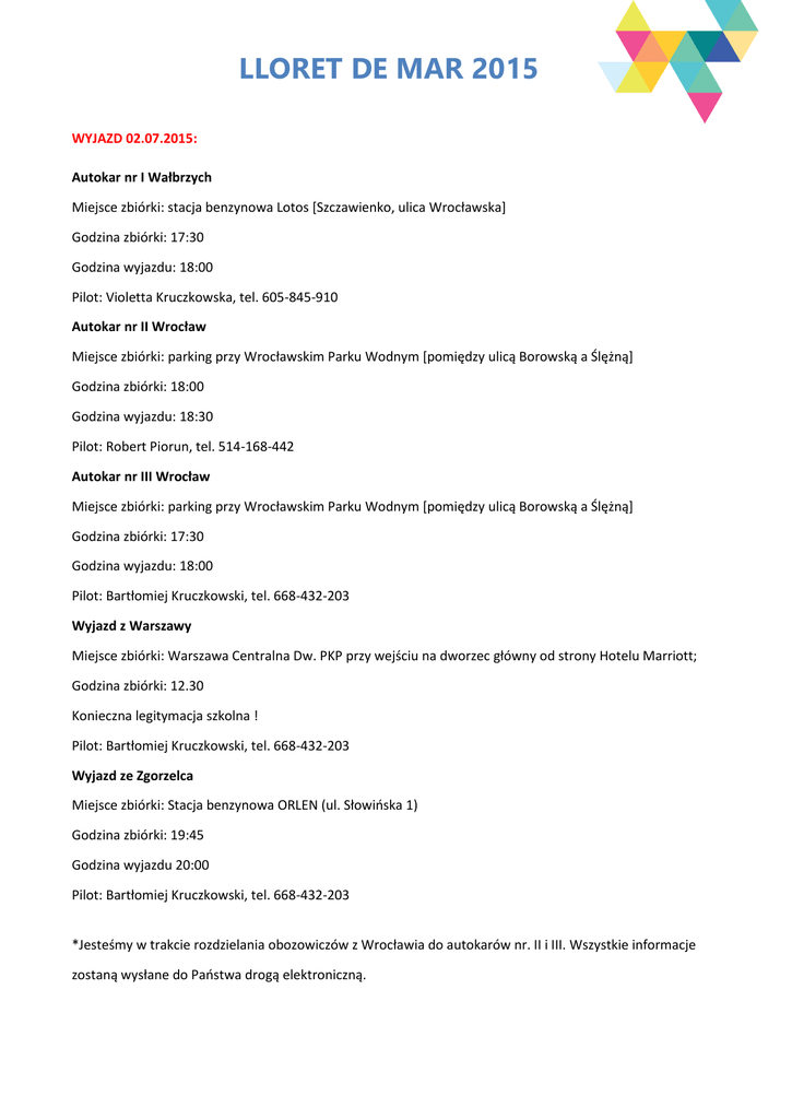 LLORET DE MAR 2015 WYJAZD 02.07.2015: Autokar nr I Wałbrzych Miejsce zbiórki: stacja benzynowa Lotos [Szczawienko, ulica Wrocławska] Godzina zbiórki: 17:30 Godzina wyjazdu: 18:00 Pilot: Violetta Kruczkowska, tel. 605-845-910 Autokar nr II Wrocław Miejsce zbiórki: parking przy Wrocławskim Parku Wodnym [pomiędzy ulicą Borowską a Ślężną] Godzina zbiórki: 18:00 Godzina wyjazdu: 18:30 Pilot: Robert Piorun, tel. 514-168-442 Autokar nr III Wrocław Miejsce zbiórki: parking przy Wrocławskim Parku Wodnym [pomiędzy ulicą Borowską a Ślężną] Godzina zbiórki: 17:30 Godzina wyjazdu: 18:00 Pilot: Bartłomiej Kruczkowski, tel. 668-432-203 Wyjazd z Warszawy Miejsce zbiórki: Warszawa Centralna Dw. PKP przy wejściu na dworzec główny od strony Hotelu Marriott; Godzina zbiórki: 12.30 Konieczna legitymacja szkolna ! Pilot: Bartłomiej Kruczkowski, tel. 668-432-203 Wyjazd ze Zgorzelca Miejsce zbiórki: Stacja benzynowa ORLEN (ul. Słowińska 1) Godzina zbiórki: 19:45 Godzina wyjazdu 20:00 Pilot: Bartłomiej Kruczkowski, tel. 668-432-203 *Jesteśmy w trakcie rozdzielania obozowiczów z Wrocławia do autokarów nr. II i III. Wszystkie informacje zostaną wysłane do Państwa drogą elektroniczną. PLAN PODRÓŻY: 02.07 – wyjazd z kraju 03.07 - 10:00-22:00 pobyt w Gardalandzie 04.07 – ok. 12:00 przyjazd do Lloret de Mar BAGAŻ: Na osobę przysługuje 1 sztuka bagażu do luku (25 kg). Torba podręczna - 1 sztuka na pokład autokaru. PO DRODZE: Osoby które nie opłaciły bilety wstępu do Gardalandu, prosimy o przygotowanie 30 euro. Pieniądze będą zbierane w autokarze. W Gardalandzie jest możliwość skorzystania z toalety, dlatego proponujemy zabranie ze sobą przyborów toaletowych (w bagażu podręcznym). Prosimy także o zabranie suchego prowiantu do Gardalandu (ewentualnie kupno na miejscu). Posiłki zaczynamy obiadem w Lloret de Mar. POKOJE: Przydział do pokoi będzie odbywał się na miejscu, pokoje nie są koedukacyjne. Uczestnicy będą mogli dobrać się według własnych preferencji, ewentualnie zostaną przydzieleni wiekowo. KIESZONKOWE: Sugerujemy o zabranie ze sobą ok. 150 euro (ok. 15 euro na jeden dzień). KARTA KWALFIKACYJNA (w załączniku): Dany dokument proszę wydrukować oraz podpisać. Karty kwalifikacyjne będą zbierane w autokarze. WYCIECZKI OBOWIĄZKOWE: Pieniądze na wycieczki obowiązkowe będą zbierane w autokarze: Barcelona: 40 Euro, Gardaland 30 Euro (osoby, które nie opłaciły wycieczek przy rezerwacji). W autokarze będą również zbierane pieniądze na taksę klimatyczną: 8Euro/os ŻYCZYMY UDANYCH WAKACJI Z NASZYM BIUREM ☺ Zespół Togoto