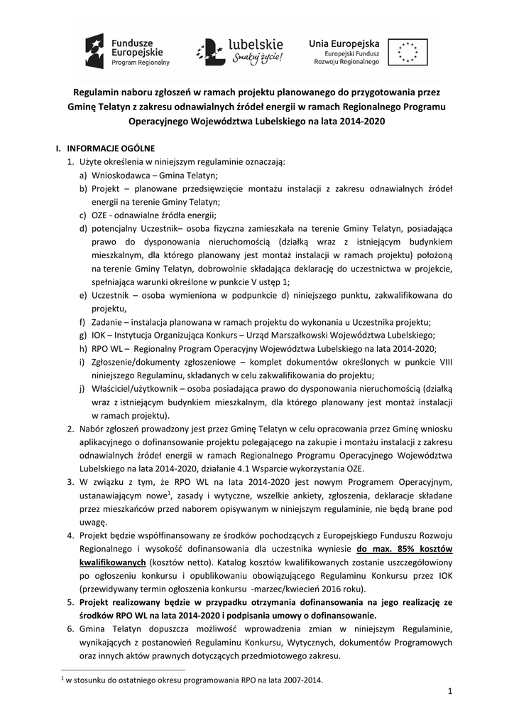 Regulamin naboru zgłoszeń w ramach projektu planowanego do przygotowania przez Gminę Telatyn z zakresu odnawialnych źródeł energii w ramach Regionalnego Programu Operacyjnego Województwa Lubelskiego na lata 2014-2020 I. INFORMACJE OGÓLNE 1. Użyte określenia w niniejszym regulaminie oznaczają: a) Wnioskodawca – Gmina Telatyn; b) Projekt – planowane przedsięwzięcie montażu instalacji z zakresu odnawialnych źródeł energii na terenie Gminy Telatyn; c) OZE - odnawialne źródła energii; d) potencjalny Uczestnik– osoba fizyczna zamieszkała na terenie Gminy Telatyn, posiadająca prawo do dysponowania nieruchomością (działką wraz z istniejącym budynkiem mieszkalnym, dla którego planowany jest montaż instalacji w ramach projektu) położoną na terenie Gminy Telatyn, dobrowolnie składająca deklarację do uczestnictwa w projekcie, spełniająca warunki określone w punkcie V ustęp 1; e) Uczestnik – osoba wymieniona w podpunkcie d) niniejszego punktu, zakwalifikowana do projektu, f) Zadanie – instalacja planowana w ramach projektu do wykonania u Uczestnika projektu; g) IOK – Instytucja Organizująca Konkurs – Urząd Marszałkowski Województwa Lubelskiego; h) RPO WL – Regionalny Program Operacyjny Województwa Lubelskiego na lata 2014-2020; i) Zgłoszenie/dokumenty zgłoszeniowe – komplet dokumentów określonych w punkcie VIII niniejszego Regulaminu, składanych w celu zakwalifikowania do projektu; j) Właściciel/użytkownik – osoba posiadająca prawo do dysponowania nieruchomością (działką wraz z istniejącym budynkiem mieszkalnym, dla którego planowany jest montaż instalacji w ramach projektu). 2. Nabór zgłoszeń prowadzony jest przez Gminę Telatyn w celu opracowania przez Gminę wniosku aplikacyjnego o dofinansowanie projektu polegającego na zakupie i montażu instalacji z zakresu odnawialnych źródeł energii w ramach Regionalnego Programu Operacyjnego Województwa Lubelskiego na lata 2014-2020, działanie 4.1 Wsparcie wykorzystania OZE. 3. W związku z tym, że RPO WL na lata 2014-2020 jest nowym Programem Operacyjnym, ustanawiającym nowe1, zasady i wytyczne, wszelkie ankiety, zgłoszenia, deklaracje składane przez mieszkańców przed naborem opisywanym w niniejszym regulaminie, nie będą brane pod uwagę. 4. Projekt będzie współfinansowany ze środków pochodzących z Europejskiego Funduszu Rozwoju Regionalnego i wysokość dofinansowania dla uczestnika wyniesie do max. 85% kosztów kwalifikowanych (kosztów netto). Katalog kosztów kwalifikowanych zostanie uszczegółowiony po ogłoszeniu konkursu i opublikowaniu obowiązującego Regulaminu Konkursu przez IOK (przewidywany termin ogłoszenia konkursu -marzec/kwiecień 2016 roku). 5. Projekt realizowany będzie w przypadku otrzymania dofinansowania na jego realizację ze środków RPO WL na lata 2014-2020 i podpisania umowy o dofinansowanie. 6. Gmina Telatyn dopuszcza możliwość wprowadzenia zmian w niniejszym Regulaminie, wynikających z postanowień Regulaminu Konkursu, Wytycznych, dokumentów Programowych oraz innych aktów prawnych dotyczących przedmiotowego zakresu. 1 w stosunku do ostatniego okresu programowania RPO na lata 2007-2014. 1 7. Dodatkowe informacje dotyczące Regulaminu naboru można uzyskać: osobiście w Urzędzie Gminy Telatyn, ul. Fryderyka Chopina 10, 22-652 Telatyn, pokój 10, telefonicznie pod numerem telefonu (084) 66-13-110. II. OPIS PLANOWANEGO PROJEKTU 1. Gmina Telatyn, jako wnioskodawca, wystąpi do IOK z wnioskiem o dofinansowanie projektu polegającego na zakupie i montażu dla zgłoszonych do uczestnictwa w projekcie, istniejących budynków mieszkalnych położonych na terenie Gminy Telatyn, instalacji z zakresu odnawialnych źródeł energii w ramach RPO WL na lata 2014-2020, działanie 4.1 Wsparcie wykorzystania OZE. 2. Zaplanowany rodzaj instalacji w projekcie: a) kolektory słoneczne Służą do podgrzewania wody do celów użytkowych w gospodarstwie domowym za pomocą energii słonecznej; Zapotrzebowanie na ciepłą wodę użytkową zależy od liczby osób zamieszkujących w danym gospodarstwie domowym. Planując liczbę, a w konsekwencji powierzchnię paneli na budynku, bierze się pod uwagę liczbę osób zamieszkujących budynek; Szacunkowy koszt netto instalacji oraz wartość udziału uczestnika projektu będzie zależała od wielkości zamontowanej instalacji solarnej oraz miejsca lokalizacji i będzie określony w umowie Uczestnictwa w projekcie, która będzie podpisywana po pozytywnym przejściu procedury aplikacyjnej przez Gminę Telatyn. Nie ma możliwości montażu instalacji na dachach pokrytych eternitem. Planowany jest montaż instalacji przede wszystkim na połaciach dachowych. Ze względu na wydajność instalacji, wariantem najbardziej korzystnym jest strona południowa dachu, południowo-wschodnia lub południowo-zachodnia. Przy instalacjach kolektorów i określaniu „wolnej” powierzchni dachu, należy zwrócić uwagę na takie elementy jak okna dachowe, kominy i/lub inne urządzenia usytuowane na dachu. Ponadto należy przeanalizować, czy w bezpośrednim sąsiedztwie budynku nie znajdują się np. wysokie drzewa, lub inne obiekty mogące powodować zacienienie paneli, co może wpływać na znaczne obniżenie sprawności instalacji. W przypadku pokrycia dachu eternitem lub braku możliwości wykonania instalacji na dachu z innego względu (za mała powierzchnia dachu, zacienienie, niekorzystny kąt pochylenia, niekorzystne położenie wolnej połaci dachu względem strony południowej, itp.), istnieje możliwość wykonania instalacji przy fasadzie budynku. 3. Osoby posiadające prawo do dysponowania nieruchomością (działką wraz z istniejącym budynkiem mieszkalnym, dla którego planowany jest montaż instalacji w ramach projektu) położoną na terenie Gminy Telatyn, spełniające warunki określone w punkcie V, mogą aplikować o zakup i montaż instalacji: - kolektorów słonecznych; Przy wyborze w/w opc