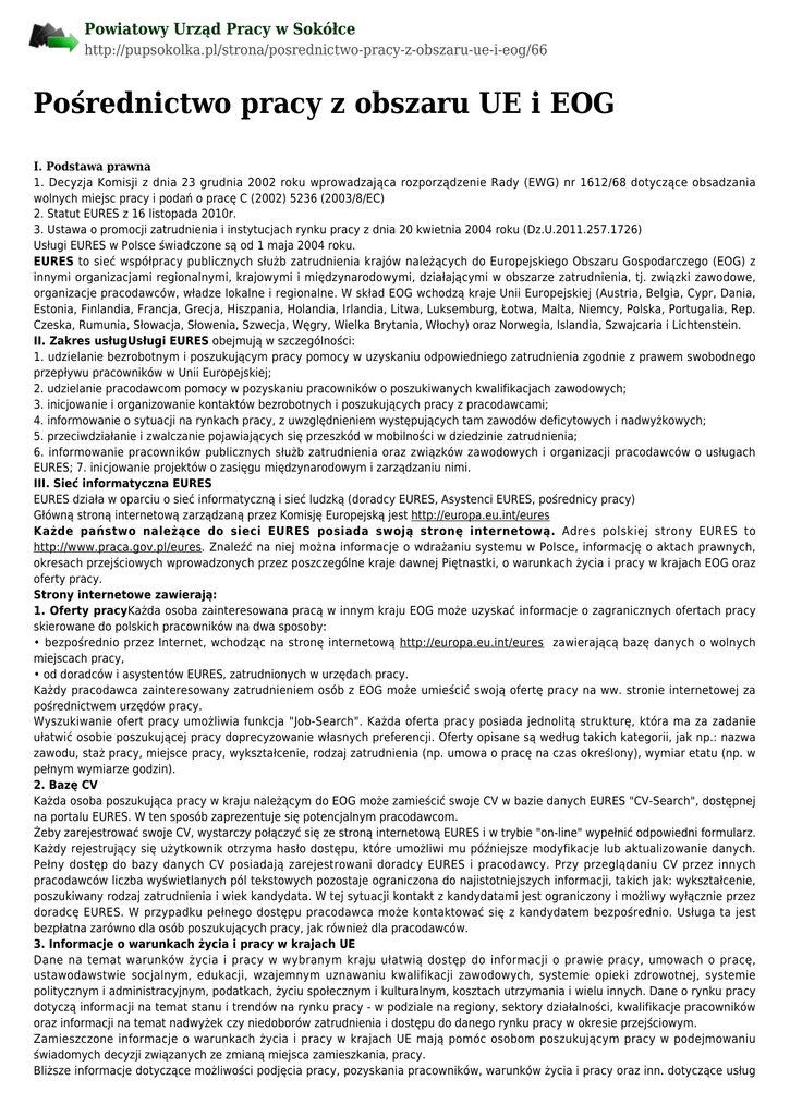 Powiatowy Urząd Pracy w Sokółce http://pupsokolka.pl/strona/posrednictwo-pracy-z-obszaru-ue-i-eog/66 Pośrednictwo pracy z obszaru UE i EOG I. Podstawa prawna 1. Decyzja Komisji z dnia 23 grudnia 2002 roku wprowadzająca rozporządzenie Rady (EWG) nr 1612/68 dotyczące obsadzania wolnych miejsc pracy i podań o pracę C (2002) 5236 (2003/8/EC) 2. Statut EURES z 16 listopada 2010r. 3. Ustawa o promocji zatrudnienia i instytucjach rynku pracy z dnia 20 kwietnia 2004 roku (Dz.U.2011.257.1726) Usługi EURES w Polsce świadczone są od 1 maja 2004 roku. EURES to sieć współpracy publicznych służb zatrudnienia krajów należących do Europejskiego Obszaru Gospodarczego (EOG) z innymi organizacjami regionalnymi, krajowymi i międzynarodowymi, działającymi w obszarze zatrudnienia, tj. związki zawodowe, organizacje pracodawców, władze lokalne i regionalne. W skład EOG wchodzą kraje Unii Europejskiej (Austria, Belgia, Cypr, Dania, Estonia, Finlandia, Francja, Grecja, Hiszpania, Holandia, Irlandia, Litwa, Luksemburg, Łotwa, Malta, Niemcy, Polska, Portugalia, Rep. Czeska, Rumunia, Słowacja, Słowenia, Szwecja, Węgry, Wielka Brytania, Włochy) oraz Norwegia, Islandia, Szwajcaria i Lichtenstein. II. Zakres usługUsługi EURES obejmują w szczególności: 1. udzielanie bezrobotnym i poszukującym pracy pomocy w uzyskaniu odpowiedniego zatrudnienia zgodnie z prawem swobodnego przepływu pracowników w Unii Europejskiej; 2. udzielanie pracodawcom pomocy w pozyskaniu pracowników o poszukiwanych kwalifikacjach zawodowych; 3. inicjowanie i organizowanie kontaktów bezrobotnych i poszukujących pracy z pracodawcami; 4. informowanie o sytuacji na rynkach pracy, z uwzględnieniem występujących tam zawodów deficytowych i nadwyżkowych; 5. przeciwdziałanie i zwalczanie pojawiających się przeszkód w mobilności w dziedzinie zatrudnienia; 6. informowanie pracowników publicznych służb zatrudnienia oraz związków zawodowych i organizacji pracodawców o usługach EURES; 7. inicjowanie projektów o zasięgu międzynarodowym i zarządzaniu nimi. III. Sieć informatyczna EURES EURES działa w oparciu o sieć informatyczną i sieć ludzką (doradcy EURES, Asystenci EURES, pośrednicy pracy) Główną stroną internetową zarządzaną przez Komisję Europejską jest http://europa.eu.int/eures Każde państwo należące do sieci EURES posiada swoją stronę internetową. Adres polskiej strony EURES to http://www.praca.gov.pl/eures. Znaleźć na niej można informacje o wdrażaniu systemu w Polsce, informację o aktach prawnych, okresach przejściowych wprowadzonych przez poszczególne kraje dawnej Piętnastki, o warunkach życia i pracy w krajach EOG oraz oferty pracy. Strony internetowe zawierają: 1. Oferty pracyKażda osoba zainteresowana pracą w innym kraju EOG może uzyskać informacje o zagranicznych ofertach pracy skierowane do polskich pracowników na dwa sposoby: • bezpośrednio przez Internet, wchodząc na stronę internetową http://europa.eu.int/eures zawierającą bazę danych o wolnych miejscach pracy, • od doradców i asystentów EURES, zatrudnionych w urzędach pracy. Każdy pracodawca zainteresowany zatrudnieniem osób z EOG może umieścić swoją ofertę pracy na ww. stronie internetowej za pośrednictwem urzędów pracy. Wyszukiwanie ofert pracy umożliwia funkcja "Job-Search". Każda oferta pracy posiada jednolitą strukturę, która ma za zadanie ułatwić osobie poszukującej pracy doprecyzowanie własnych preferencji. Oferty opisane są według takich kategorii, jak np.: nazwa zawodu, staż pracy, miejsce pracy, wykształcenie, rodzaj zatrudnienia (np. umowa o pracę na czas określony), wymiar etatu (np. w pełnym wymiarze godzin). 2. Bazę CV Każda osoba poszukująca pracy w kraju należącym do EOG może zamieścić swoje CV w bazie danych EURES "CV-Search", dostępnej na portalu EURES. W ten sposób zaprezentuje się potencjalnym pracodawcom. Żeby zarejestrować swoje CV, wystarczy połączyć się ze stroną internetową EURES i w trybie "on-line" wypełnić odpowiedni formularz. Każdy rejestrujący się użytkownik otrzyma hasło dostępu, które umożliwi mu późniejsze modyfikacje lub aktualizowanie danych. Pełny dostęp do bazy danych CV posiadają zarejestrowani doradcy EURES i pracodawcy. Przy przeglądaniu CV przez innych pracodawców liczba wyświetlanych pól tekstowych pozostaje ograniczona do najistotniejszych informacji, takich jak: wykształcenie, poszukiwany rodzaj zatrudnienia i wiek kandydata. W tej sytuacji kontakt z kandydatami jest ograniczony i możliwy wyłącznie przez doradcę EURES. W przypadku pełnego dostępu pracodawca może kontaktować się z kandydatem bezpośrednio. Usługa ta jest bezpłatna zarówno dla osób poszukujących pracy, jak również dla pracodawców. 3. Informacje o warunkach życia i pracy w krajach UE Dane na temat warunków życia i pracy w wybranym kraju ułatwią dostęp do informacji o prawie pracy, umowach o pracę, ustawodawstwie socjalnym, edukacji, wzajemnym uznawaniu kwalifikacji zawodowych, systemie opieki zdrowotnej, systemie politycznym i administracyjnym, podatkach, życiu społecznym i kulturalnym, kosztach utrzymania i wielu innych. Dane o rynku pracy dotyczą informacji na temat stanu i trendów na rynku pracy - w podziale na regiony, sektory działalności, kwalifikacje pracowników oraz informacji na temat nadwyżek czy niedoborów zatrudnienia i dostępu do danego rynku pracy w okresie przejściowym. Zamieszczone informacje o warunkach życia i pracy w krajach UE mają pomóc osobom poszukującym pracy w podejmowaniu świadomych decyzji związanych ze zmianą miejsca zamieszkania, pracy. Bliższe informacje dotyczące możliwości podjęcia pracy, pozyskania pracowników, warunków życia i pracy oraz inn. dotyczące usług EURES w województwie podlaskim można uzyskać u: Doradcy EURES Wojewódzkiego asystenta EURES - WUP w Białymstoku pokój 12, tel. 85-74-97-235 Pośrednik pracy - PUP 