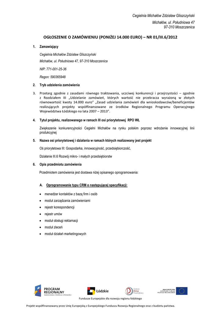 Cegielnia Michałów Zdzisław Gliszczyński Michałów, ul. Południowa 47 97-310 Moszczenica OGŁOSZENIE O ZAMÓWIENIU (PONIŻEJ 14.000 EURO) – NR 01/III.6/2012 1. Zamawiający Cegielnia Michałów Zdzisław Gliszczyński Michałów, ul. Południowa 47, 97-310 Moszczenica NIP: 771-001-25-36 Regon: 590365948 2. Tryb udzielenia zamówienia 3. Przetarg zgodnie z zasadami równego traktowania, uczciwej konkurencji i przejrzystości – zgodnie z Rozdziałem III „Udzielanie zamówień, których wartość nie przekracza wyrażoną w złotych równowartość kwoty 14.000 euro” „Zasad udzielania zamówień dla wnioskodawców/beneficjentów realizujących projekty współfinansowane ze środków Regionalnego Programu Operacyjnego Województwa Łódzkiego na lata 2007 – 2013”. 4. Tytuł projektu, realizowanego w ramach III osi priorytetowej RPO WŁ Zwiększenie konkurencyjności Cegielni Michałów na rynku polskim poprzez wdrożenie innowacyjnej linii produkcyjnej 5. Nazwa osi priorytetowej i działania w ramach których realizowany jest projekt Oś priorytetowa III: Gospodarka, innowacyjność, przedsiębiorczość, Działanie III.6 Rozwój mikro- i małych przedsiębiorstw 6. Opis przedmiotu zamówienia Przedmiotem zamówienia jest dostawa niżej opisanego oprogramowania: A. Oprogramowanie typu CRM o następującej specyfikacji: menedżer kontaktów z bazą firm i osób moduł zarządzania zamówieniami rejestr korespondencji rejestr umów moduł obsługi reklamacji moduł zleceń moduł działań marketingowych Fundusze Europejskie dla rozwoju regionu łódzkiego Projekt współfinansowany przez Unię Europejską z Europejskiego Funduszu Rozwoju Regionalnego oraz z budżetu państwa. Cegielnia Michałów Zdzisław Gliszczyński Michałów, ul. Południowa 47 97-310 Moszczenica 7. pis sposobu obliczania ceny Ocena wg kryterium ceny - ranga kryterium - 100% Kryterium cena – obliczana jest wg wzoru: Najniższa cena spośród cen ofert ocenianych Ilość punktów dla ocenianej oferty = ----------------------------------------------------------------- x 100 pkt x 100% Cena oferty ocenianej a) Zamawiający przyjmie do oceny podaną przez Wykonawców cenę brutto w złotych. b) Zamawiający zastosuje zaokrąglenie wyników do dwóch miejsc po przecinku. c) 1% odpowiada 1 punktowi przyjętemu do oceny. 8. Opis kryteriów, którymi Beneficjent będzie kierował się przy wyborze najkorzystniejszej oferty wraz z podaniem znaczenia kryteriów i sposobu ofert; Jedynym kryterium oceny ofert jest cena – 100%. Ponadto Oferent musi spełnić kryteria określone w punkcie 10 Zapytania. 9. Termin wykonania zamówienia Do 31.03.2012r. 10. Opis sposobu przygotowania ofert, miejsce oraz termin składania i otwarcia ofert a) Oferty należy składać w formie elektronicznej na adres [email protected] lub w formie pisemnej w siedzibie zamawiającego: Michałów, ul. Południowa 47, 97-310 Moszczenica. W przypadku składania oferty za pośrednictwem poczty elektronicznej w formie plików załączonych do korespondencji, pliki powinny być zapisane w formacie umożliwiającym odczytanie ich treści np. PDF. b) Oferty należy przesyłać zgodnie z wzorem oferty (załącznik nr 1) c) Termin składania ofert upływa w dniu 15.03.2012r. d) Oferta złożona po terminie składania ofert nie będzie rozpatrywana. 11. Opis warunków udziału w postępowaniu oraz sposobu dokonywania oceny spełnienia tych warunków O udzielenie zamówienia mogą ubiegać się Wykonawcy, którzy: 1) 2) posiadają uprawnienia do wykonywania określonej działalności lub czynności, jeżeli ustawy nakładają obowiązek posiadania takich uprawnień, udokumentowane odpisem z Krajowego Rejestru Sądowego lub ewidencji działalności gospodarczej, posiadają niezbędną wiedzę i doświadczenie do wykonywania zamówienia, Fundusze Europejskie dla rozwoju regionu łódzkiego Projekt współfinansowany przez Unię Europejską z Europejskiego Funduszu Rozwoju Regionalnego oraz z budżetu państwa. Cegielnia Michałów Zdzisław Gliszczyński Michałów, ul. Południowa 47 97-310 Moszczenica 3) dysponują niezbędnym potencjałem technicznym do wykonywania zamówienia lub przedstawią pisemne zobowiązanie innych podmiotów do udostępnienia potencjału technicznego i osób zdolnych do wykonania zamówienia, 4) dysponują osobami zdolnymi do wykonywania zamówienia, 5) znajdują się w sytuacji ekonomicznej i finansowej zapewniającej wykonanie zamówienia, przy założeniu, że zapłata za wykonanie zamówienia dokonana będzie do 21 dni od dostarczenia zamówienia i faktury do siedziby Zamawiającego, 6) nie podlegają wykluczeniu z postępowania o udzielenie zamówienia (przykładowe warunki wykluczenia – art. 24 ust. 1 i 2 ustawy pzp). Przesłanie oferty w odpowiedzi na niniejsze zapytanie ofertowe (w formacie zgodnym z Załącznikiem nr 1) jest jednoznaczne ze złożeniem oświadczenia, że oferent spełnia powyższe kryteria. 12. Projekt współfinansowany ze środków Europejskiego Funduszu Rozwoju Regionalnego oraz Budżetu Państwa. Fundusze Europejskie dla rozwoju regionu łódzkiego Projekt współfinansowany przez Unię Europejską z Europejskiego Funduszu Rozwoju Regionalnego oraz z budżetu państwa.