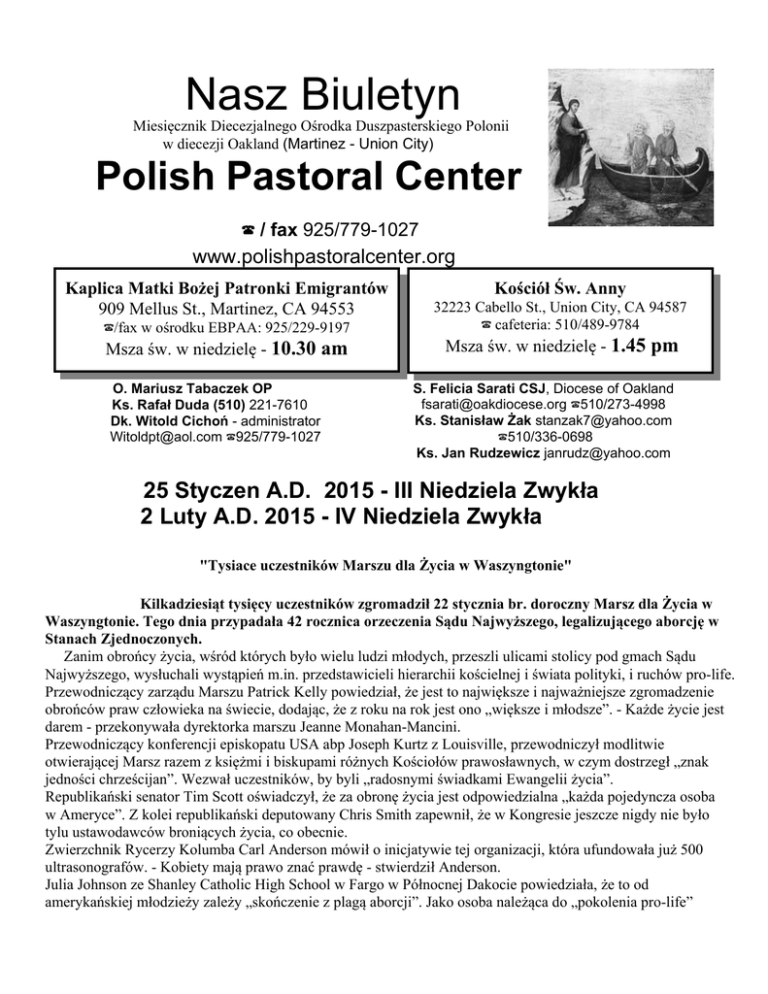 Nasz Biuletyn Miesięcznik Diecezjalnego Ośrodka Duszpasterskiego Polonii w diecezji Oakland (Martinez - Union City) Polish Pastoral Center ? / fax 925/779-1027 www.polishpastoralcenter.org Kaplica Matki Bożej Patronki Emigrantów 909 Mellus St., Martinez, CA 94553 ?/fax w ośrodku EBPAA: 925/229-9197 Msza św. w niedzielę - 10.30 am O. Mariusz Tabaczek OP Ks. Rafał Duda (510) 221-7610 Dk. Witold Cichoń - administrator [email protected] ?925/779-1027 Kościół Św. Anny 32223 Cabello St., Union City, CA 94587 ? cafeteria: 510/489-9784 Msza św. w niedzielę - 1.45 pm S. Felicia Sarati CSJ, Diocese of Oakland [email protected] ?510/273-4998 Ks. Stanisław Żak [email protected] ?510/336-0698 Ks. Jan Rudzewicz [email protected] 25 Styczen A.D. 2015 - III Niedziela Zwykła 2 Luty A.D. 2015 - IV Niedziela Zwykła "Tysiace uczestników Marszu dla Życia w Waszyngtonie" Kilkadziesiąt tysięcy uczestników zgromadził 22 stycznia br. doroczny Marsz dla Życia w Waszyngtonie. Tego dnia przypadała 42 rocznica orzeczenia Sądu Najwyższego, legalizującego aborcję w Stanach Zjednoczonych. Zanim obrońcy życia, wśród których było wielu ludzi młodych, przeszli ulicami stolicy pod gmach Sądu Najwyższego, wysłuchali wystąpień m.in. przedstawicieli hierarchii kościelnej i świata polityki, i ruchów pro-life. Przewodniczący zarządu Marszu Patrick Kelly powiedział, że jest to największe i najważniejsze zgromadzenie obrońców praw człowieka na świecie, dodając, że z roku na rok jest ono „większe i młodsze”. - Każde życie jest darem - przekonywała dyrektorka marszu Jeanne Monahan-Mancini. Przewodniczący konferencji episkopatu USA abp Joseph Kurtz z Louisville, przewodniczył modlitwie otwierającej Marsz razem z księżmi i biskupami różnych Kościołów prawosławnych, w czym dostrzegł „znak jedności chrześcijan”. Wezwał uczestników, by byli „radosnymi świadkami Ewangelii życia”. Republikański senator Tim Scott oświadczył, że za obronę życia jest odpowiedzialna „każda pojedyncza osoba w Ameryce”. Z kolei republikański deputowany Chris Smith zapewnił, że w Kongresie jeszcze nigdy nie było tylu ustawodawców broniących życia, co obecnie. Zwierzchnik Rycerzy Kolumba Carl Anderson mówił o inicjatywie tej organizacji, która ufundowała już 500 ultrasonografów. - Kobiety mają prawo znać prawdę - stwierdził Anderson. Julia Johnson ze Shanley Catholic High School w Fargo w Północnej Dakocie powiedziała, że to od amerykańskiej młodzieży zależy „skończenie z plagą aborcji”. Jako osoba należąca do „pokolenia pro-life” wyraziła dumę z tego, że na Marszu towarzyszy jej „400 wojowników pro-life” - wszyscy uczniowie szkoły. Dzień wcześniej podczas Narodowego Czuwania w intencji Życia Mszę św. w sanktuarium Niepokalanego Poczęcia NMP w Waszyngtonie odprawił kard. Sean O’Malley z Bostonu. Stwierdził, że tak jak Amerykanie złączyli siły i pokonali rasizm, tak też zwyciężą w sprawie obrony życia. Słowa te 11 tys. zgromadzonych w świątyni nagrodziło aplauzem. Tymczasem w niższej izbie Kongresu - Izbie Reprezentantów republikanie przeforsowali ustawę zabraniającą przeznaczania funduszy federalnych na pokrycie kosztów aborcji. Choć została ona przyjęta stosunkiem głosów 242 do 179, to prawdopodobnie nigdy nie wejdzie w życie, gdyż zawetuje ją prezydent Barack Obama. Demokraci nazwali ją już kolejnym zamachem na wolność kobiet. XV Dzień Islamu w Kościele katolickim w Polsce Pod hasłem „Ku prawdziwemu braterstwu między muzułmanami i chrześcijanami” 26 stycznia w Kościele katolickim w Polsce obchodzony będzie XV Dzień Islamu. Przesłanie Papieskiej Rady ds. Dialogu Międzyreligijnego do muzułmanów na koniec miesiąca Ramadan w 2014 r. nosi tytuł „Ku prawdziwemu braterstwu między muzułmanami i chrześcijanami” i jest hasłem tegorocznego Dnia Islamu w Kościele katolickim w Polsce. Przewodniczący PRDM kard. Jean-Louis Tauran zachęca w nim do podjęcia wspólnego wysiłku budowania pokoju i pojednania zwłaszcza tam, gdzie chrześcijanie i muzułmanie wspólnie cierpią z powodu okrucieństw wojny. „Oby nasza przyjaźń zawsze inspirowała nas do współpracy w mądrym i roztropnym stawianiu czoła tym licznym wyzwaniom. W ten sposób przyczynimy się do zmniejszenia napięć i konfliktów oraz do rozwijania dobra wspólnego. Pokażmy również, że religie mogą być źródłem zgody z pożytkiem dla całego społeczeństwa” – pisze kard. Tauran. Zachęca, by modlitwa, pojednanie, sprawiedliwość, pokój i rozwój pozostały naszymi priorytetami dla pomyślności i dobra całej rodziny ludzkiej. Ogólnopolskie obchody Dnia Islamu, będą miały miejsce, jak co roku, w Warszawie. 26 stycznia na Uniwersytecie Kardynała Stefana Wyszyńskiego odbędzie się sesja naukowa i jubileuszowa. Spotkanie rozpocznie o godzinie 11.00 bp Romuald Kamiński, przewodniczący Komitetu KEP ds. dialogu z religiami niechrześcijańskimi. Następnie przedstawiciele obydwu religii czytać będą Pismo Święte i Koran, modlić się i dyskutować. W trakcie sesji naukowej dr Artur Konopacki (Uniwersytet w Białymstoku, RWKM) wygłosi referat pt. „Muzułmanie w Polsce – ostatnie wydarzenia. Status prawny a zdarzenia ksenofobiczne”. Bogusław Zagórski (Collegium Civitas, RWKM) zabierze zaś głos na temat „Kalifat – ISIS – państwo muzułmańskie?”, a dr Agata S. Nalborczyk (Uniwersytet Warszawski, RWKM) opowie o „Muzułmańskich reakcjach na tzw. Islamskie Państwo”. W ramach sesji jubileuszowej ks. dr Adam Wąs SVD (KUL, RWKM) podsumuje 15 lat Dnia Islamu w Kościele katolickim w Polsce w nawiązaniu do nauczania Soboru Watykańskiego II. Następnie J.E. Mufti Tomasz Miśkiewicz omówi recepcję Dnia Islamu w Kościele katolickim w Polsce wśród muzułmanów. Dr Mariola Kozubek (Uniwersytet Śląski, RWKM) oraz przedstawiciel muzułmanów ze Śląska 