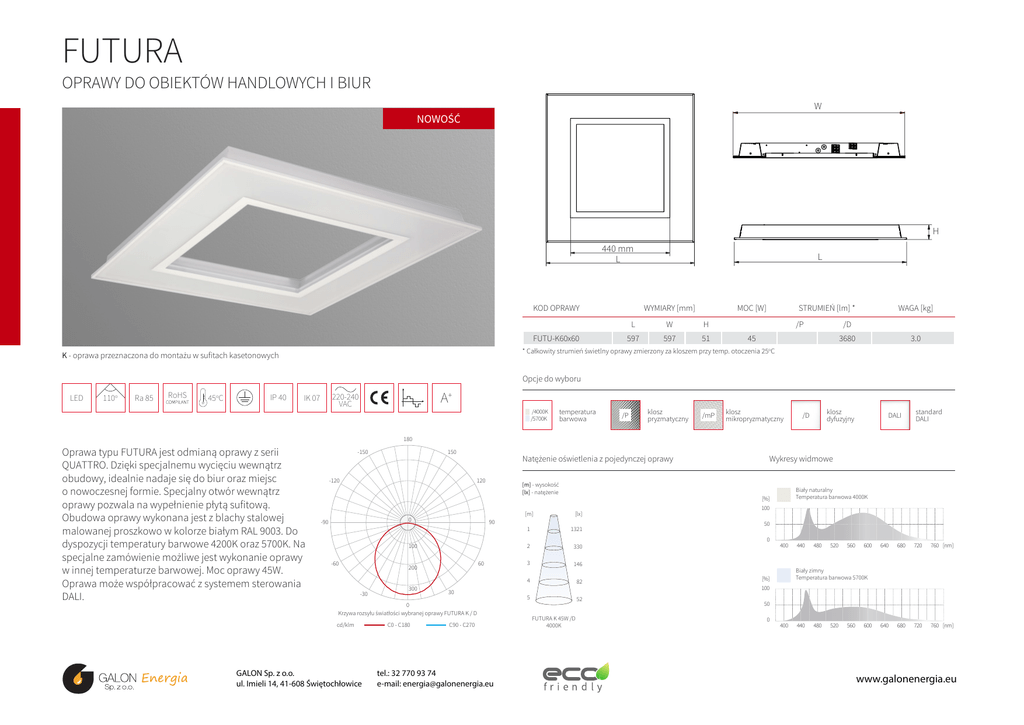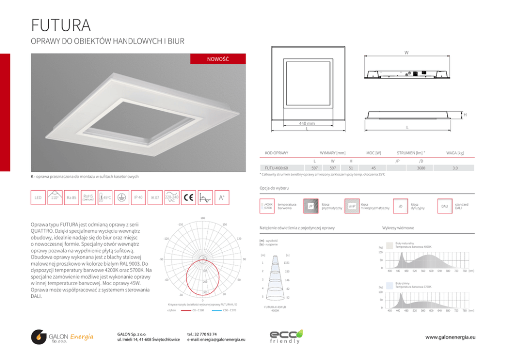 FUTURA OPRAWY DO OBIEKTÓW HANDLOWYCH I BIUR W NOWOŚĆ H 440 mm L KOD OPRAWY FUTU-K60x60 L WYMIARY [mm] MOC [W] L W H 597 597 51 STRUMIEŃ [lm] * /P WAGA [kg] /D 45 3680 3.0 * Całkowity strumień świetlny oprawy zmierzony za kloszem przy temp. otoczenia 25oC K - oprawa przeznaczona do montażu w sufitach kasetonowych Opcje do wyboru LED 110 o Ra 85 RoHS 45 C o IP 40 A 220-240 VAC IK 07 + /4000K /5700K temperatura barwowa /P klosz pryzmatyczny /mP klosz mikropryzmatyczny klosz dyfuzyjny /D DALI standard DALI 180 Oprawa typu FUTURA jest odmianą oprawy z serii QUATTRO. Dzięki specjalnemu wycięciu wewnątrz obudowy, idealnie nadaje się do biur oraz miejsc o nowoczesnej formie. Specjalny otwór wewnątrz oprawy pozwala na wypełnienie płytą sufitową. Obudowa oprawy wykonana jest z blachy stalowej malowanej proszkowo w kolorze białym RAL 9003. Do dyspozycji temperatury barwowe 4200K oraz 5700K. Na specjalne zamówienie możliwe jest wykonanie oprawy w innej temperaturze barwowej. Moc oprawy 45W. Oprawa może współpracować z systemem sterowania DALI. -150 150 -120 Natężenie oświetlenia z pojedynczej oprawy 120 [m] 0 -90 [m] - wysokość [lx] - natężenie 90 100 -60 60 200 -30 300 30 0 Krzywa rozsyłu światłości wybranej oprawy FUTURA K / D cd/klm GALON Sp. z o.o. ul. Imieli 14, 41-608 Świętochłowice C0 - C180 C90 - C270 tel.: 32 770 93 74 e-mail: [email protected] Wykresy widmowe Biały naturalny Temperatura barwowa 4000K [%] [lx] 1 1321 2 330 3 146 4 82 5 52 FUTURA K 45W /D 4000K 100 50 0 400 440 480 520 560 600 640 680 720 760 [nm] 640 680 720 760 [nm] Biały zimny Temperatura barwowa 5700K [%] 100 50 0 400 440 480 520 560 600 www.galonenergia.eu Parametry świetlne FUTU-K60x60 Strumień świetlny /D 3680 lm Skuteczność świetlna oprawy /D 82 lm/W Współczynnik oddawania barw Ra 85 Temperatura barwowa 4000K / 5700K Kąt rozsyłu światła 110° Parametry elektryczne Moc 45 W Napięcie zasilania 220-240 V / 50 Hz Współczynnik mocy (PF) 0,99 Nominalny prąd 195 mA Klasa ochronności I Pozostałe parametry użytkowe Stopień ochrony IP IP40 Temperatura pracy do +45°C Wilgotność otoczenia od 20% do 80% Żywotność 100.000 h Sposób montażu K - oprawa przeznaczona do montażu w sufitach kasetonowych /P - klosz pryzmatyczny /mP - klosz mikropryzmatyczny /D - klosz dyfuzyjny * Całkowity strumień świetlny oprawy zmierzony za kloszem przy temp. otoczenia 25oC LEGENDA OZNACZEŃ Źródło LED Dyrektywa RoHS Rodzaj klosza Atest higieniczny PZH Napięcie zasilania Deklaracja zgodności Współczynnik oddawania barw Klasa ochronności I Kąt rozsyłu Maksymalna temperatura otoczenia Temperatura barwowa Zasilanie sekwencyjne Stopień ochrony IP Strumień świetlny Stopień ochrony IK Klasa efektywności energetycznej GALON Sp. z o.o. ul. Imieli 14, 41-608 Świętochłowice tel.: 32 770 93 74 e-mail: [email protected] DALI Standard DALI www.galonenergia.eu