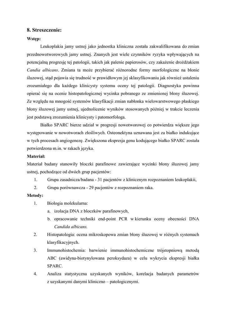8. Streszczenie: Wstęp: Leukoplakia jamy ustnej jako jednostka kliniczna została zakwalifikowana do zmian przednowotworowych jamy ustnej. Znanych jest wiele czynników ryzyka wpływających na potencjalną progresję tej patologii, takich jak palenie papierosów, czy zakażenie drożdżakiem Candia albicans. Zmiana ta może przybierać różnorodne formy morfologiczne na błonie śluzowej, stąd pojawia się trudność w prawidłowym jej sklasyfikowaniu jak również ustaleniu zrozumiałego dla każdego klinicysty systemu oceny tej patologii. Diagnostyka powinna opierać się na ocenie histopatologicznej wycinka pobranego ze zmienionej błony śluzowej. Ze względu na mnogość systemów klasyfikacji zmian nabłonka wielowarstwowego płaskiego błony śluzowej jamy ustnej, ujednolicenie wyników stosowanych później w trakcie leczenia jest podstawą zrozumienia klinicysty i patomorfologa. Białko SPARC bierze udział w progresji nowotworowej co potwierdza większe jego występowanie w nowotworach złośliwych. Osteonektyna uznawana jest za białko indukujące w tych procesach angiogenezę. Zwiększona ekspresja genu kodującego białko SPARC została potwierdzona m.in. w rakach języka. Materiał: Materiał badany stanowiły bloczki parafinowe zawierające wycinki błony śluzowej jamy ustnej, pochodzące od dwóch grup pacjentów: 1. Grupa zasadnicza/badana - 31 pacjentów z klinicznym rozpoznaniem leukoplakii, 2. Grupa porównawcza - 29 pacjentów z rozpoznaniem raka. Metody: 1. Biologia molekularna: a. izolacja DNA z bloczków parafinowych, b. opracowanie techniki end-point PCR w kierunku oceny obecności DNA Candida albicans. 2. Histopatologia: ocena mikroskopowa zmian błony śluzowej w różnych systemach klasyfikacyjnych. 3. Immunohistochemia: barwienie immunohistochemiczne trójstopniową metodą ABC (awidyna-biotynylowana peroksydaza) w celu wykrycia ekspresji białka SPARC. 4. Analiza statystyczna uzyskanych wyników, korelacja badanych parametrów z uzyskanymi danymi kliniczno – patologicznymi. Wyniki: 1. Porównano i usystematyzowano klasyfikacje histopatologiczne poszczególnych systemów oceny zmian nabłonkowych błony śluzowej jamy ustnej i za system najbardziej kompatybilny z wymogami systemu WHO uznano klasyfikację OIN. 2. Przeprowadzono ocenę immunopatomorfologiczną ekspresji białka SPARC w różnych stadiach zmian patologicznych nabłonka wielowarstwowego płaskiego błony śluzowej jamy ustnej i wykazano wzrost ekspresji białka w miarę progresji zmian patomorfologicznych. 3. Porównano dwie metody izolacji DNA z bloczków parafinowych oraz wybrano kolumienkową metodę izolacji DNA zestawem FFPE QiaAmp firmy Qiagen jako bardziej wydajną pod względem ilości DNA wyizolowanego z badanego materiału. 4. Opracowano skuteczną metodę detekcji DNA C. albicans, wyizolowanego z kolonii klinicznych szczepów drożdżaka, przy użyciu techniki PCR. Metodę zastosowano w ocenie obecności DNA drożdżaka w bloczkach parafinowych. Wnioski: 1. Stopień zaawansowania zmiany patologicznej błony śluzowej jamy ustnej wg klasyfikacji OIN jest systemem pewnym i porównywalnym z klasyfikacją WHO i w związku z tym może stanowić cenne uzupełnienie rutynowego rozpoznania histopatologicznego. 2. Wzrost ekspresji białka SPARC koreluje ze wzrostem zaawansowania zmian histopatologicznych w nabłonku wielowarstwowym płaskim błony śluzowej jamy ustnej. 3. Bloczki parafinowe zawierające wycinki błony śluzowej jamy ustnej są wymagającym materiałem w badaniach z wykorzystaniem technik molekularnych. Materiał ten ze względu na sposób przygotowania ma zastosowanie w patomorfologii, jednak ze względu na sposób przygotowania bloczków parafinowych i użyte w tym celu odczynniki, wykazuje trudności w zastosowaniu ze złożonymi metodami z kategorii technik molekularnych. 4. Dalsze badania muszą być przeprowadzone celem potwierdzenia czy istnieje możliwość diagnostyki C. albicans z wykorzystaniem bardziej dokładnych technik molekularnych celujących w rejony genomu C. albicans mniejszych niż 161 par zasad. 5. Miejscami anatomicznymi, w których zaobserwowano częstszy rozwój leukoplakii była błona śluzowa policzka, natomiast raka częściej dotyczył języka. Słowa kluczowe: Leukoplakia, Carcinoma planoepitheliale, Candida albicans, OIN, Lublana, SPARC, technika PCR