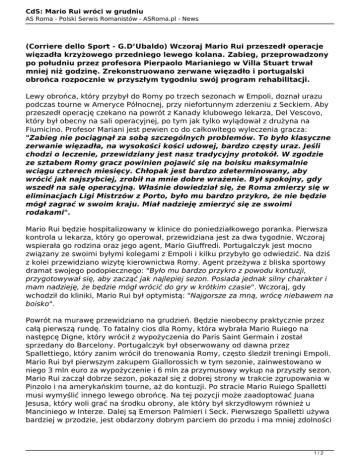CdS: Mario Rui wróci w grudniu AS Roma - Polski Serwis Romanistów - ASRoma.pl - News (Corriere dello Sport - G.D’Ubaldo) Wczoraj Mario Rui przeszedł operacje więzadła krzyżowego przedniego lewego kolana. Zabieg, przeprowadzony po południu przez profesora Pierpaolo Marianiego w Villa Stuart trwał mniej niż godzinę. Zrekonstruowano zerwane więzadło i portugalski obrońca rozpocznie w przyszłym tygodniu swój program rehabilitacji. Lewy obrońca, który przybył do Romy po trzech sezonach w Empoli, doznał urazu podczas tourne w Ameryce Północnej, przy niefortunnym zderzeniu z Seckiem. Aby przeszedł operację czekano na powrót z Kanady klubowego lekarza, Del Vescovo, który był obecny na sali operacyjnej, po tym jak tylko wylądował z drużyna na Fiumicino. Profesor Mariani jest pewien co do całkowitego wyleczenia gracza: "Zabieg nie pociągnął za sobą szczególnych problemów. To było klasyczne zerwanie więzadła, na wysokości kości udowej, bardzo częsty uraz. Jeśli chodzi o leczenie, przewidziany jest nasz tradycyjny protokół. W zgodzie ze sztabem Romy gracz powinien pojawić się na boisku maksymalnie wciągu czterech miesięcy. Chłopak jest bardzo zdeterminowany, aby wrócić jak najszybciej, zrobił na mnie dobre wrażenie. Był spokojny, gdy wszedł na salę operacyjną. Właśnie dowiedział się, że Roma zmierzy się w eliminacjach Ligi Mistrzów z Porto, było mu bardzo przykro, że nie będzie mógł zagrać w swoim kraju. Miał nadzieję zmierzyć się ze swoimi rodakami". Mario Rui będzie hospitalizowany w klinice do poniedziałkowego poranka. Pierwsza kontrola u lekarza, który go operował, przewidziana jest za dwa tygodnie. Wczoraj wspierała go rodzina oraz jego agent, Mario Giuffredi. Portugalczyk jest mocno związany ze swoimi byłymi kolegami z Empoli i kilku przybyło go odwiedzić. Na dziś z kolei przewidziano wizytę kierownictwa Romy. Agent przeżywa z bliska sportowy dramat swojego podopiecznego: "Było mu bardzo przykro z powodu kontuzji, przygotowywał się, aby zacząć jak najlepiej sezon. Posiada jednak silny charakter i mam nadzieję, że będzie mógł wrócić do gry w krótkim czasie". Wczoraj, gdy wchodził do kliniki, Mario Rui był optymistą: "Najgorsze za mną, wrócę niebawem na boisko". Powrót na murawę przewidziano na grudzień. Będzie nieobecny praktycznie przez całą pierwszą rundę. To fatalny cios dla Romy, która wybrała Mario Ruiego na następcę Digne, który wrócił z wypożyczenia do Paris Saint Germain i został sprzedany do Barcelony. Portugalczyk był obserwowany od dawna przez Spallettiego, który zanim wrócił do trenowania Romy, często śledził treningi Empoli. Mario Rui był pierwszym zakupem Giallorossich w tym sezonie, zainwestowano w niego 3 mln euro za wypożyczenie i 6 mln za przymusowy wykup na przyszły sezon. Mario Rui zaczął dobrze sezon, pokazał się z dobrej strony w trakcie zgrupowania w Pinzolo i na amerykańskim tourne, aż do kontuzji. Po stracie Mario Ruiego Spalletti musi wymyślić innego lewego obrońcę. Na tej pozycji może zaadoptować Juana Jesusa, który woli grać na środku obrony, ale który był skrzydłowym również u Manciniego w Interze. Dalej są Emerson Palmieri i Seck. Pierwszego Spalletti używa bardziej w przodzie, jest obdarzony dobrym parciem do przodu i ma mniej zdolności 1/2 CdS: Mario Rui wróci w grudniu AS Roma - Polski Serwis Romanistów - ASRoma.pl - News defensywnych. Seck, który przybył za darmo z Lazio, wciąż nie wydaje się być gotowym do gry w Romie. Od poniedziałku z pierwszym zespołem będzie trenował też Silvio Anocic, lewy obrońca Primavery, mistrza Włoch. Chorwat udowodnił swoją wartość w zespole Alberto De Rossiego, w ostatnich dniach trenował indywidualnie, gdyż nie podpisać przedłużenia kontraktu. W najbliższym tygodniu będzie gotowy to zrobić i może być dobrą alternatywą dla Spallettiego. Autor: abruzzi 2/2 Powered by TCPDF (www.tcpdf.org)