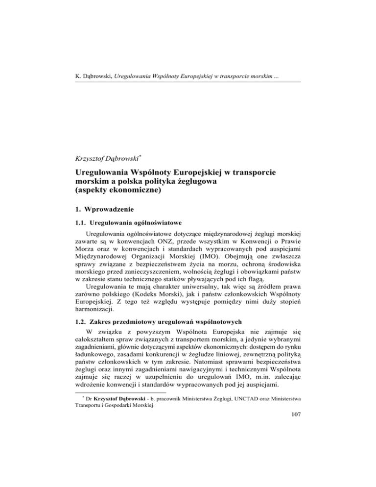 K. Dąbrowski, Uregulowania Wspólnoty Europejskiej w transporcie morskim ... Krzysztof Dąbrowski ∗ Uregulowania Wspólnoty Europejskiej w transporcie morskim a polska polityka żeglugowa (aspekty ekonomiczne) 1. Wprowadzenie 1.1. Uregulowania ogólnoświatowe Uregulowania ogólnoświatowe dotyczące międzynarodowej żeglugi morskiej zawarte są w konwencjach ONZ, przede wszystkim w Konwencji o Prawie Morza oraz w konwencjach i standardach wypracowanych pod auspicjami Międzynarodowej Organizacji Morskiej (IMO). Obejmują one zwłaszcza sprawy związane z bezpieczeństwem życia na morzu, ochroną środowiska morskiego przed zanieczyszczeniem, wolnością żeglugi i obowiązkami państw w zakresie stanu technicznego statków pływających pod ich flagą. Uregulowania te mają charakter uniwersalny, tak więc są źródłem prawa zarówno polskiego (Kodeks Morski), jak i państw członkowskich Wspólnoty Europejskiej. Z tego też względu występuje pomiędzy nimi duży stopień harmonizacji. 1.2. Zakres przedmiotowy uregulowań wspólnotowych W związku z powyższym Wspólnota Europejska nie zajmuje się całokształtem spraw związanych z transportem morskim, a jedynie wybranymi zagadnieniami, głównie dotyczącymi aspektów ekonomicznych: dostępem do rynku ładunkowego, zasadami konkurencji w żegludze liniowej, zewnętrzną polityką państw członkowskich w tym zakresie. Natomiast sprawami bezpieczeństwa żeglugi oraz innymi zagadnieniami nawigacyjnymi i technicznymi Wspólnota zajmuje się raczej w uzupełnieniu do uregulowań IMO, m.in. zalecając wdrożenie konwencji i standardów wypracowanych pod jej auspicjami. ∗ Dr Krzysztof Dąbrowski - b. pracownik Ministerstwa Żeglugi, UNCTAD oraz Ministerstwa Transportu i Gospodarki Morskiej. 107 Studia Europejskie, 1/1998 W zakresie zagadnień ekonomicznych transportu morskiego Wspólnota przyjęła szereg regulacji, z których wiele ma charakter prawnie wiążący. Nie wypracowano natomiast takich regulacji w dziedzinie wspólnej polityki dotyczącej portów morskich. Nie zostały też ujednolicone środki polityki wewnętrznej dotyczące żeglugi, takie jak polityka fiskalna, zasady amortyzacji czy tworzenia funduszy socjalnych dla pracowników. 1.3. Charakter uregulowań wspólnotowych i odpowiadające im uregulowania polskie Rozporządzenia Rady i Komisji są wiążące dla państw członkowskich WE i mają zastosowanie bezpośrednie. Nie wymagają zatem legislacji wprowadzającej w tych państwach, co wynika z artykułu 189 Traktatu o utworzeniu Wspólnoty Europejskiej (Traktat WE). Ważną kwestią jest dokonywanie oceny, które postanowienia bądź rozporządzenia są nadal ważne, a które uległy dezaktualizacji. Przez Komisję za najważniejszą uważana jest zasada swobody świadczenia usług w transporcie morskim, przewidziana w rozporządzeniu Rady nr 4055/86. Wiążący charakter mają też dyrektywy Rady lub Komisji, z tym że wiążący jest ich rezultat, podczas gdy formy i metody jego osiągnięcia mogą się różnić w zależności od poszczególnych państw członkowskich. 1 Regulacje polskie dotyczące zagadnień objętych tymi rozporządzeniami mają charakter ogólny: są to ustawy o przeciwdziałaniu praktykom monopolistycznym i o zwalczaniu nieuczciwej konkurencji. Dzięki owej ogólności pole manewru w zakresie możliwych rozwiązań i postanowień rozbieżnych jest stosunkowo małe. Ustawa branżowa, jaką jest polski Kodeks Morski, opiera się z kolei w dużej mierze, jak wspomniano, na uregulowaniach ogólnoświatowych (podobnie jak ustawodawstwo państw członkowskich WE). 1.4. Regulacje wspólnotowe i światowy rynek żeglugowy Na światowym rynku żeglugowym występują trzy główne sektory, co do swojej organizacji i struktury różniące się znacznie między sobą: − przewozy drobnicy, stanowiące 23-25% światowego handlu morskiego, dokonywane w przeważającej części w ramach żeglugi liniowej i w których poważną rolę odgrywają ugrupowania kartelowe, jakimi są tzw. konferencje żeglugi liniowej; 2 1 Por. V.Power, EC Shipping Law, London 1992, s.85-89. Listę najważniejszych instrumentów prawnych WE i Polski dotyczących ekonomicznych aspektów transportu morskiego podano w załączniku do niniejszego artykułu. 2 Konferencja żeglugi liniowej (konferencja liniowa): grupa dwóch lub więcej przewoźników morskich dysponujących statkami, którzy utrzymują międzynarodowe liniowe połączenia dla przewozu ładunków na określonej trasie lub trasach w ustalonych granicach geograficznych 108 K. Dąbrowski, Uregulowania Wspólnoty Europejskiej w transporcie morskim ... przewozy ładunków masowych suchych (zboże, węgiel, boksyty, fosfaty) oraz ładunków płynnych, dokonywane w większości dzięki frachtowaniu statków trampowych na wolnym rynku (m.in. na giełdach, jak np. Baltic Exchange w Londynie) i podlegające w pełni prawom tego rynku; − przewozy ładunków płynnych (ropa) i niektórych ładunków masowych suchych (ruda), częściowo dokonywane przez transportowe firmy poszczególnych koncernów wydobywczych i praktycznie nie podlegające prawom wolnego rynku. Uregulowania Wspólnoty mają charakter regionalny, dotyczą jej obrotów wewnętrznych oraz między państwami członkowskimi a krajami trzecimi, a zatem tylko częściowo wpływając na światowy rynek żeglugowy. Tak więc jedynie uregulowania w ramach ONZ mogłyby mieć znaczenie ogólnoświatowe. W odniesieniu do aspektów ekonomicznych taką rolę mogła odegrać przygotowana przez ONZ w 1974 r. Konwencja o Kodeksie Postępowania Konferencji Żeglugi Liniowej. − 2. Konwencja ONZ o Kodeksie Postępowania Konferencji Żeglugi Liniowej Konwencja ONZ o Kodeksie Postępowania Konferencji Żeglugi Liniowej została przygotowana z inicjatywy krajów rozwijających się, które w 1972 r. przegłosowały na forum UNCTAD (United Nations Conference on Trade and Development) stosowny wniosek. Kraje rozwinięte, w 