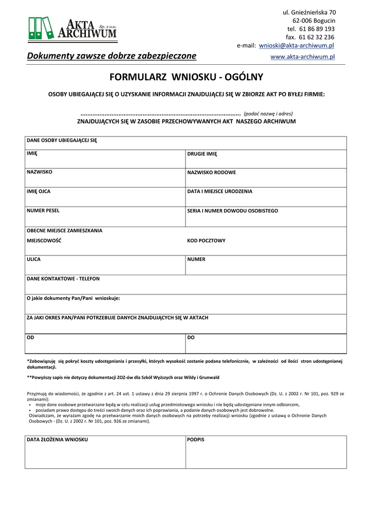 ul. Gnieźnieńska 70 62-006 Bogucin tel. 61 86 89 193 fax. 61 62 32 236 e-mail: [email protected] Dokumenty zawsze dobrze zabezpieczone www.akta-archiwum.pl FORMULARZ WNIOSKU - OGÓLNY OSOBY UBIEGAJĄCEJ SIĘ O UZYSKANIE INFORMACJI ZNAJDUJĄCEJ SIĘ W ZBIORZE AKT PO BYŁEJ FIRMIE: ............................................................................................. (podać nazwę i adres) ZNAJDUJĄCYCH SIĘ W ZASOBIE PRZECHOWYWANYCH AKT NASZEGO ARCHIWUM DANE OSOBY UBIEGAJĄCEJ SIĘ IMIĘ DRUGIE IMIĘ NAZWISKO NAZWISKO RODOWE IMIĘ OJCA DATA I MIEJSCE URODZENIA NUMER PESEL SERIA I NUMER DOWODU OSOBISTEGO OBECNE MIEJSCE ZAMIESZKANIA MIEJSCOWOŚĆ KOD POCZTOWY ULICA NUMER DANE KONTAKTOWE - TELEFON O jakie dokumenty Pan/Pani wnioskuje: ZA JAKI OKRES PAN/PANI POTRZEBUJE DANYCH ZNAJDUJĄCYCH SIĘ W AKTACH OD DO *Zobowiązuję się pokryć koszty udostępniania i przesyłki, których wysokość zostanie podana telefonicznie, w zależności od ilości stron udostępnianej dokumentacji. **Powyższy sapis nie dotyczy dokumentacji ZOZ-ów dla Szkół Wyższych oraz Wildy i Grunwald Przyjmuję do wiadomości, że zgodnie z art. 24 ust. 1 ustawy z dnia 29 sierpnia 1997 r. o Ochronie Danych Osobowych (Dz. U. z 2002 r. Nr 101, poz. 929 ze zmianami): • moje dane osobowe przetwarzane będą w celu realizacji usług przedmiotowego wniosku i nie będą udostępniane innym odbiorcom, • posiadam prawo dostępu do treści swoich danych oraz ich poprawiania, a podanie danych osobowych jest dobrowolne. Oświadczam, że wyrażam zgodę na przetwarzanie moich danych osobowych na potrzeby realizacji wniosku (zgodnie z ustawą o Ochronie Danych Osobowych - (Dz. U. z 2002 r. Nr 101, poz. 926 ze zmianami). DATA ZŁOŻENIA WNIOSKU PODPIS