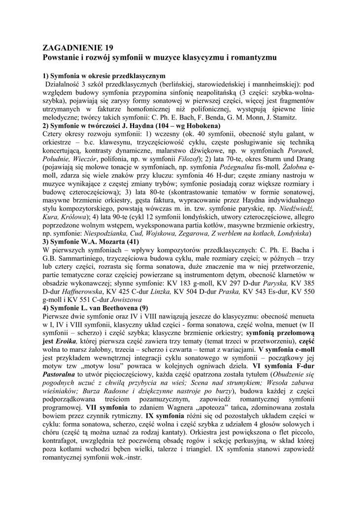 ZAGADNIENIE 19 Powstanie i rozwój symfonii w muzyce klasycyzmu i romantyzmu 1) Symfonia w okresie przedklasycznym Działalność 3 szkół przedklasycznych (berlińskiej, starowiedeńskiej i mannheimskiej): pod względem budowy symfonia przypomina sinfonię neapolitańską (3 części: szybka-wolnaszybka), pojawiają się zarysy formy sonatowej w pierwszej części, więcej jest fragmentów utrzymanych w fakturze homofonicznej niż polifonicznej, występują śpiewne linie melodyczne; twórcy takich symfonii: C. Ph. E. Bach, F. Benda, G. M. Monn, J. Stamitz. 2) Symfonie w twórczości J. Haydna (104 – wg Hobokena) Cztery okresy rozwoju symfonii: 1) wczesny (ok. 40 symfonii, obecność stylu galant, w orkiestrze – b.c. klawesynu, trzyczęściowość cyklu, częste posługiwanie się techniką koncertującą, kontrasty dynamiczne, malarstwo dźwiękowe, np. w symfoniach Poranek, Południe, Wieczór, polifonia, np. w symfonii Filozof); 2) lata 70-te, okres Sturm und Drang (pojawiają się molowe tonacje w symfoniach, np. symfonia Pożegnalna fis-moll, Żałobna emoll, zdarza się wiele znaków przy kluczu: symfonia 46 H-dur; częste zmiany nastroju w muzyce wynikające z częstej zmiany trybów; symfonie posiadają coraz większe rozmiary i budowę czteroczęściową); 3) lata 80-te (skontrastowanie tematów w formie sonatowej, masywne brzmienie orkiestry, gęsta faktura, wypracowanie przez Haydna indywidualnego stylu kompozytorskiego, powstają wówczas m. in. tzw. symfonie paryskie, np. Niedźwiedź, Kura, Królowa); 4) lata 90-te (cykl 12 symfonii londyńskich, utwory czteroczęściowe, allegro poprzedzone wolnym wstępem, wyeksponowana partia kotłów, masywne brzmienie orkiestry, np. symfonie: Niespodzianka, Cud, Wojskowa, Zegarowa, Z werblem na kotłach, Londyńska) 3) Symfonie W.A. Mozarta (41) W pierwszych symfoniach – wpływy kompozytorów przedklasycznych: C. Ph. E. Bacha i G.B. Sammartiniego, trzyczęściowa budowa cyklu, małe rozmiary części; w późnych – trzy lub cztery części, rozrasta się forma sonatowa, duże znaczenie ma w niej przetworzenie, partie tematyczne coraz częściej powierzane są instrumentom dętym, obecność klarnetów w obsadzie wykonawczej; słynne symfonie: KV 183 g-moll, KV 297 D-dur Paryska, KV 385 D-dur Haffnerowska, KV 425 C-dur Linzka, KV 504 D-dur Praska, KV 543 Es-dur, KV 550 g-moll i KV 551 C-dur Jowiszowa 4) Symfonie L. van Beethovena (9) Pierwsze dwie symfonie oraz IV i VIII nawiązują jeszcze do klasycyzmu: obecność menueta w I, IV i VIII symfonii, klasyczny układ części - forma sonatowa, część wolna, menuet (w II symfonii – scherzo) i część szybka; klasyczne brzmienie orkiestry; symfonią przełomową jest Eroika, której pierwsza część zawiera trzy tematy (temat trzeci w przetworzeniu), część wolna to marsz żałobny, trzecia – scherzo i czwarta – temat z wariacjami. V symfonia c-moll jest przykładem wewnętrznej integracji cyklu sonatowego w symfonii – początkowy jej motyw tzw „motyw losu” powraca w kolejnych ogniwach dzieła. VI symfonia F-dur Pastoralna to utwór pięcioczęściowy, każda część opatrzona została tytułem (Obudzenie się pogodnych uczuć z chwilą przybycia na wieś; Scena nad strumykiem; Wesoła zabawa wieśniaków; Burza Radosne i dziękczynne nastroje po burzy), budowa każdej z części podporządkowana treściom pozamuzycznym, zapowiedź romantycznej symfonii programowej. VII symfonia to zdaniem Wagnera „apoteoza” tańca, zdominowana została bowiem przez czynnik rytmiczny. IX symfonia różni się od pozostałych układem części w cyklu: forma sonatowa, scherzo, część wolna i część szybka z udziałem 4 głosów solowych i chóru (część tą można uznać za rodzaj kantaty). Orkiestra jest powiększona o flet piccolo, kontrafagot, uwzględnia też poczwórną obsadę rogów i sekcję perkusyjną, w skład której poza kotłami wchodzi bęben wielki, talerze i triangiel. IX symfonia stanowi zapowiedź romantycznej symfonii wok.-instr. 5) Symfonia klasycyzująca w twórczości kompozytorów romantycznych (klasyczna budowa cyklu, klasyczne formy, np. forma sonatowa, rondo etc., klasyczne techniki kompozytorskie, np. praca przetworzeniowa, klasyczne brzmienie orkiestry) a) F. Schubert (8 symfonii, wszystkie, z wyjątkiem Niedokończonej, czteroczęściowe; dopiero od VI symfonii pojawia się scherzo zamiast menueta, bardzo śpiewne tematy – wpływy pieśni) b) R. Schumann (4 symfonie: B-dur Wiosenna, C-dur tzw. Drugi Jupiter, Es-dur i dmoll, wzorowane na symfoniach Beethovena, układ czteroczęściowy cyklu, masywna, gęsta faktura orkiestry) c) F. Mendelssohn (prawie 20 symfonii, ale najbardziej znane są ostatnie symfonie: A-dur Włoska , a-moll Szkocka, d-moll Reformacyjna) d) J.Brahms (4 symfonie: c, D,F,e; prócz elementów przejętych z klasycyzmu w jego twórczości pojawiają się zapożyczenia z baroku: częste polifonizowanie, passacaglia w finale IV symfonii, barokowa motoryczność w szybkich częściach) e) P. Czajkowski (6 symfonii, niekiedy z elementami ludowymi, np. II –Małoruska, III – Polska; eksperymenty z budową cyklu: w zakończeniu V symfonii powraca jej początek, w VI Patetycznej– ostatnia część to wolne ogniwo cyklu; błyskotliwość instrumentacji) f) A. Dvorak (9 symfonii, czteroczęściowy układ cyklu, nawiązania do muzyki ludowej, wzorował się początkowo na Beethovenie i Brahmsie) g) A. Bruckner (ponad 10 symfonii, w tym 9 numerowanych; budowa cyklu – klasyczna; brzmienie orkiestry i harmonika – wzorowana na Wagnerze) 6) Romantyczna symfonia programowa a) H. Berlioz (Symfonia fantastyczna: 5 części – Marzenia - namiętności, Scena na balu, Wśród pól, Marsz na miejsce straceń, Sabat czarownic; symfonia Harold w Italii na altówkę solo i orkiestrę; budowa cyklu podporządkowana programowi, wzbogacone brzmienie orkiestry o dodatkowe instrumenty: harfy, dzwony rurowe, werbel, tuby; duże znaczenie kol