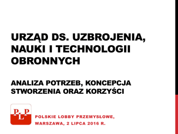 URZĄD DS. UZBROJENIA, NAUKI I TECHNOLOGII OBRONNYCH ANALIZA POTRZEB, KONCEPCJA STWORZENIA ORAZ KORZYŚCI POLSKIE LOBBY PRZEMYSŁOWE, WARSZAWA, 2 LIPCA 2016 R. BRAK ODPOWIEDNIEJ KOORDYNACJI DZIAŁAŃ W ZAKRESIE KSZTAŁTOWANIA I ROZWOJU UZBROJENIA ISTOTNIE OGRANICZA POTENCJAŁ OBRONNY POLSKI Analiza sytuacji w zakresie koordynacji rozwoju uzbrojenia Wielość interesariuszy nie przekłada się na udaną współpracę: • Wiele ministerstw ma wpływ na decyzje w podejmowane w sferze bardziej lub mniej pośrednio dotyczącej rozwoju potencjału naukowego i technicznego w obszarze obronności – od badań podstawowych przez produkcję i zamówienia po regulacje; • Rozbieżne interesy resortów i wycinkowość ich zainteresowania aspektami związanymi z obronnością sprawia, iż nie zachodzi dostateczna koordynacja; • Do głównych objawów tego stanu rzeczy należą: bałagan kompetencyjny, przepychanki międzyresortowe, przedłużanie procedur decyzyjnych, chaos w planowaniu i realizowaniu zakupów uzbrojenia i wyposażenia resortów siłowych, a także nieracjonalna prywatyzacja w przemyśle obronnym; • Brakuje platform rzeczywistej współpracy pomiędzy: użytkownikami końcowymi – zespołami naukowymi – przemysłem, szczególnie w początkowej fazie opracowywania programów i projektów. Dominuje rozproszony system planowania i ustalania priorytetowych kierunków badań i prac rozwojowych, również z obszaru bezpieczeństwa i obronności państwa, który realizowany jest w oparciu o różne struktury bez bieżącego nadzoru nad ich realizacją ze strony głównych gestorów. Urząd ds. Uzbrojenia, Nauki i Technologii Obronnych | PLP 2 BRAKU SPÓJNEJ POLITYKI ROZWOJU TECHNOLOGII I NOWOCZESNEGO UZBROJENIA NIE POZWALA NA PEŁNE WYKORZYSTANIE ISTNIEJĄCEGO POTENCJAŁU Konsekwencje istniejącej sytuacji dla obronności Polski Brak koordynacji powoduje dysfunkcjonalność systemową polityki w tym obszarze: • Modernizacja polskiej armii przebiega zbyt wolno, co spowodowane jest przedłużającymi się procedurami oraz brakiem „połączeń” pomiędzy poszczególnymi elementami łańcucha tworzenia potencjału obronnego; • Brak ustalonej kierunkowej polityki powoduje niestabilność instytucjonalną, tworząc niejasno zakreślone ramy, które powodują, iż proces tworzenia polityki uzbrojenia łatwo podlega wpływom lobbingu międzynarodowego; • Brak „strategicznego centrum” monitorującego i koordynującego całość tworzenia rozwiązań obronnych sprawia, iż polityka obronna nie jest skorelowana z budowaniem stabilnego zaplecza gospodarczo-finansowego i produkcyjnego i szerszą polityką gospodarczą rządu; • Brak jednoznacznego patronatu i odpowiedzialności za ten obszar powoduje niepełne wykorzystywanie szans rozwoju tego obszaru – przykładowo, nasze przedsiębiorstwa i instytuty pracujące na rzecz obronności w małym stopniu uczestniczą w programach międzynarodowych, które są dobrym mechanizmem transferu technologii, przepływu know-how do rodzimej kadry, a także mechanizmem ekonomizacji zaopatrzenia, pozwalającym dzięki efektom skali i współpracy osiągać odległe cele techniczne przy mniejszych nakładach zasobów. Urząd ds. Uzbrojenia, Nauki i Technologii Obronnych | PLP 3 WIELE PAŃSTW ROZWIĄZAŁO TE PROBLEMY POPRZEZ STWORZENIE DEDYKOWANYCH AGENT RZĄDOWYCH KOORDYNUJĄCYCH DZIAŁANIA W TYM OBSZARZE Przykłady instytucji zagranicznych* Analogiczne instytucje w innych krajach są odpowiedzialne m.in. za następujące funkcje: DARPA • • • • • DGA • • DFKI Opracowywanie przyszłego stanu uzbrojenia; Monitorowanie aktualnego stanu uzbrojenia; Realizację procesu zakupu uzbrojenia; Rozwój technologii o znaczeniu strategicznym; Rozwój konkretnych rozwiązań z zakresu uzbrojenia i obronności; Wspieranie rozwoju krajowego przemysłu zbrojeniowego; Wspieranie rozwoju krajowego eksportu uzbrojenia. Powyższe obszary ze względu na liczne wzajemne powiązania powinny być skonsolidowane pod kierownictwem jednej instytucji – Urzędu ds. Uzbrojenia, Nauki i Technologii Obronnych. *Szczegóły dotyczące powyższych instytucji znajdują się w załączniku. Niniejsze zestawienie nie obejmuje Agencji Awangardowych Opracowań i Innowacji (Агентствo Передовых Разработок и Инновации), która jest właśnie tworzona w Federacji Rosyjskiej . Urząd ds. Uzbrojenia, Nauki i Technologii Obronnych | PLP 4 URZĄD DS. UZBROJENIA, NAUKI I TECHNOLOGII OBRONNYCH POZWOLI NA PRZYŚPIESZENIE ROZWOJU POTENCJAŁU MILITARNEGO POLSKI Korzyści dla potencjału militarnego Polski Dzięki stworzeniu urzędu potencjał militarny Polski będzie się zwiększać – czas zacznie działać na korzyść Dzięki skomasowaniu rozproszonych zasobów poprzez skoordynowane i równoczesne działania na polach obejmujących zakres zainteresowania Urzędu ds. Uzbrojenia, Nauki i Technologii Obronnych, potencjał militarny Polski będzie wzrastać. Kluczowym w warunkach ciągłego zagrożenia powiększaniem się luki technologicznej zasobem jest czas, zaś stworzenie Urzędu pozwoli na szybsze decyzje i większą głębię strategiczną – dając możliwość konkurowania z ofertą globalnych graczy rynku uzbrojenia. Badania podstawowe Kierunki rozwoju badań podstawowych (granty) Badania aplikacyjne Kierunki rozwoju badań aplikacyjnych (granty, fundusze) Rozwój rozwiązań Rozwój techniki obronnej (granty, fundusze, specjalne programy, startupy) Urząd ds. Uzbrojenia, Nauki i Technologii Obronnych | PLP Produkcja przemysłowa Odpowiedź na zamówienia sił zbrojnych ze strony rodzimego przemysłu Nowoczesne siły zbrojne Skoordynowana polityka dot. uzbrojenia Koordynacja działań instytucji, nauki, armii i przemysłu Eksport rozwiązań i technologii Uzyskanie efektu skali i konkurencyjności, Przemysł obronny jako element gospodarki narodowej 5 ZAŁĄCZNIKI OPISY WYBRANYCH INSTYTUCJI ZAGRANICZNYCH Urząd ds. Uzbrojenia, Na