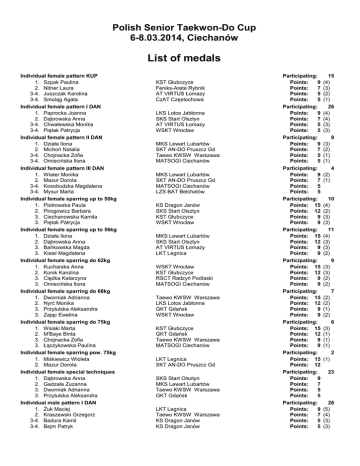 Polish Senior Taekwon-Do Cup 6-8.03.2014, Ciechanów List of medals Individual female pattern KUP 1. Szpak Paulina 2. Nitner Laura 3-4. Juszczak Karolina 3-4. Smoląg Agata Individual female pattern I DAN 1. Paprocka Joanna 2. Dąbrowska Anna 3-4. Chwalewska Monika 3-4. Piętak Patrycja Individual female pattern II DAN 1. Działa Ilona 2. Michoń Natalia 3-4. Chojnacka Zofia 3-4. Omiecińska Ilona Individual female pattern III DAN 1. Wiater Monika 2. Mazur Dorota 3-4. Kosobudzka Magdalena 3-4. Mysur Marta Individual female sparring up to 50kg 1. Piotrowska Paula 2. Pirogowicz Barbara 3. Ciechanowska Kamila 3. Piętak Patrycja Individual female sparring up to 56kg 1. Działa Ilona 2. Dąbrowska Anna 3. Bańkowska Magda 3. Kisiel Magdalena Individual female sparring do 62kg 1. Kucharska Anna 2. Konik Karolina 3. Ciężka Katarzyna 3. Omiecińska Ilona Individual female sparring do 68kg 1. Dworniak Adrianna 2. Nyrć Monika 3. Przytulska Aleksandra 3. Zając Ewelina Individual female sparring do 75kg 1. Wsiaki Marta 2. M'Baye Binta 3. Chojnacka Zofia 3. Łączykowska Paulina Individual female sparring pow. 75kg 1. Miśkiewicz Wioleta 2. Mazur Dorota Individual female special techniques 1. Dąbrowska Anna 2. Gadzała Zuzanna 3. Dworniak Adrianna 3. Przytulska Aleksandra Individual male pattern I DAN 1. Żuk Maciej 2. Kraszewski Grzegorz 3-4. Badura Kamil 3-4. Bejm Patryk KST Głubczyce Feniks-Arete Rybnik AT VIRTUS Łomazy CzAT Częstochowa LKS Lotos Jabłonna SKS Start Olsztyn AT VIRTUS Łomazy WSKT Wrocław MKS Lewart Lubartów SKT AN-DO Pruszcz Gd Taewo KWSW Warszawa MATSOGI Ciechanów MKS Lewart Lubartów SKT AN-DO Pruszcz Gd MATSOGI Ciechanów LZS BAT Bełchatów KS Dragon Janów SKS Start Olsztyn KST Głubczyce WSKT Wrocław MKS Lewart Lubartów SKS Start Olsztyn AT VIRTUS Łomazy LKT Legnica WSKT Wrocław KST Głubczyce RSCT Radzyń Podlaski MATSOGI Ciechanów Taewo KWSW Warszawa LKS Lotos Jabłonna GKT Gdańsk WSKT Wrocław KST Głubczyce GKT Gdańsk Taewo KWSW Warszawa MATSOGI Ciechanów LKT Legnica SKT AN-DO Pruszcz Gd SKS Start Olsztyn MKS Lewart Lubartów Taewo KWSW Warszawa GKT Gdańsk LKT Legnica Taewo KWSW Warszawa KS Dragon Janów KS Dragon Janów Participating: Points: 9 Points: 7 Points: 5 Points: 5 Participating: Points: 9 Points: 7 Points: 5 Points: 5 Participating: Points: 9 Points: 7 Points: 5 Points: 5 Participating: Points: 9 Points: 7 Points: 5 Points: 5 Participating: Points: 15 Points: 12 Points: 9 Points: 9 Participating: Points: 15 Points: 12 Points: 9 Points: 9 Participating: Points: 15 Points: 12 Points: 9 Points: 9 Participating: Points: 15 Points: 12 Points: 9 Points: 9 Participating: Points: 15 Points: 12 Points: 9 Points: 9 Participating: Points: 15 Points: 12 Participating: Points: 9 Points: 7 Points: 5 Points: 5 Participating: Points: 9 Points: 7 Points: 5 Points: 5 15 (4) (3) (2) (1) 26 (4) (4) (3) (3) 8 (3) (2) (1) (1) 4 (2) (1) 10 (4) (2) (3) (3) 11 (4) (3) (3) (2) 9 (3) (3) (2) (2) 7 (2) (2) (1) (2) 6 (3) (1) (1) (1) 2 (1) 23 26 (5) (4) (3) (3) Individual male pattern II DAN 1. Forgiel Karol 2. Książek Maciej 3-4. Dederko Mateusz 3-4. Dobrowolski Kamil Individual male pattern III DAN 1. Reduch Andrzej 2. Klaja Robert 3-4. Antos Piotr 3-4. Szczęsny Gaweł Individual male pattern IV DAN 1. Szwejkowski Piotr 2. Szwejkowski Paweł 3-4. Poleszak Rafał 3-4. Szczepaniuk Tomasz Individual male pattern KUP 1. Borzęcki Adrian 2. Jakubiszyn Adrian 3-4. Protasiewicz Maciej 3-4. Ząbczyk Kacper Individual male sparring do 57kg 1. Kubiak Łukasz 2. Góra Tomasz 3. Cukier Piotr 3. Dederko Mateusz Individual male sparring do 63kg 1. Szwejkowski Paweł 2. Gortat Krystian 3. Wawryniuk Michał 3. Zgorzelski Rafał Individual male sparring do 70kg 1. Dobrowolski Kamil 2. Raczyński Kamil 3. Forgiel Karol 3. Grzędowicz Jędrzej Individual male sparring do 78kg 1. Kraszewski Grzegorz 2. Wasilewski Piotr 3. Bęben Mateusz 3. Walczak Bartłomiej Individual male sparring do 85kg 1. Zazulak Radosław 2. Sudak Łukasz 3. Dominiak Michał 3. Kalinowski Jakub Individual male sparring pow. 85kg 1. Mróz Mateusz 2. Słodkowski Bartosz 3. Woś Konrad 3. Wypchał Piotr Individual male special techniques 1. Pełka Piotr 2. Mróz Mateusz 3. Dominiak Michał 3. Kamiński Mateusz LKT Legnica KAT Kraków Stoczek 45 Białystok WSKT Wrocław MATSOGI Ciechanów GKT Gdańsk KAT Kraków KKSW Lubin MATSOGI Ciechanów MATSOGI Ciechanów Feniks-Arete Rybnik LKS Lotos Jabłonna MKS Lewart Lubartów SKT AN-DO Pruszcz Gd PST "Ko-Dang" Lipsk MATSOGI Ciechanów RCSW Fighter Rybnik CzAT Częstochowa Taewo KWSW Warszawa Stoczek 45 Białystok MATSOGI Ciechanów LZS BAT Bełchatów MKS Lewart Lubartów SKST Szczecin WSKT Wrocław WSKT Wrocław LKT Legnica Taewo KWSW Warszawa Taewo KWSW Warszawa Taewo KWSW Warszawa Victoria Działoszyn Taewo KWSW Warszawa WSKT Wrocław WSKT Wrocław LKS Lotos Jabłonna KAT Kraśnik Taewo KWSW Warszawa KST Głubczyce WAT Wrocław KAT Kraków MATSOGI Ciechanów Taewo KWSW Warszawa LKS Lotos Jabłonna Taewo KWSW Warszawa Participating: Points: 9 Points: 7 Points: 5 Points: 5 Participating: Points: 9 Points: 7 Points: 5 Points: 5 Participating: Points: 9 Points: 7 Points: 5 Points: 5 Participating: Points: 9 Points: 7 Points: 5 Points: 5 Participating: Points: 15 Points: 12 Points: 9 Points: 9 Participating: Points: 15 Points: 12 Points: 9 Points: 9 Participating: Points: 15 Points: 12 Points: 9 Points: 9 Participating: Points: 15 Points: 12 Points: 9 Points: 9 Participating: Points: 15 Points: 12 Points: 9 Points: 9 Participating: Points: 15 Points: 12 Points: 9 Points: 9 Participating: Points: 9 Points: 7 Points: 5 Points: 5 12 (4) (3) (2) (2) 8 (3) (2) (1) (1) 6 (2) (2) (1) 33 (5) (4) (3) (3) 7 (3) (2) (1) (2) 12 (3) (2) (3) (3) 27 (5) (3) (5) (5) 17 (4) (3) (4) (3) 11 (3) (3) (2) (3) 8 (3) (2) (2) (2) 31 General Classification of Schools Place School Short name Gold Silver Bronze 1. Ludowy Klub Sportowy MATSOGI Ciechanów MATSOGI Ciechanów 4 1 5 2. Miejski Klub Sport