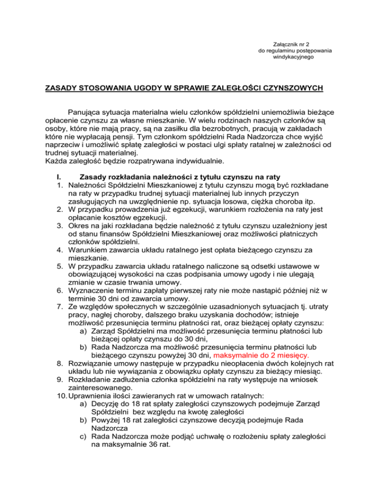 Załącznik nr 2 do regulaminu postępowania windykacyjnego ZASADY STOSOWANIA UGODY W SPRAWIE ZALEGŁOŚCI CZYNSZOWYCH Panująca sytuacja materialna wielu członków spółdzielni uniemożliwia bieżące opłacenie czynszu za własne mieszkanie. W wielu rodzinach naszych członków są osoby, które nie mają pracy, są na zasiłku dla bezrobotnych, pracują w zakładach które nie wypłacają pensji. Tym członkom spółdzielni Rada Nadzorcza chce wyjść naprzeciw i umożliwić spłatę zaległości w postaci ulgi spłaty ratalnej w zależności od trudnej sytuacji materialnej. Każda zaległość będzie rozpatrywana indywidualnie. I. Zasady rozkładania należności z tytułu czynszu na raty 1. Należności Spółdzielni Mieszkaniowej z tytułu czynszu mogą być rozkładane na raty w przypadku trudnej sytuacji materialnej lub innych przyczyn zasługujących na uwzględnienie np. sytuacja losowa, ciężka choroba itp. 2. W przypadku prowadzenia już egzekucji, warunkiem rozłożenia na raty jest opłacanie kosztów egzekucji. 3. Okres na jaki rozkładana będzie należność z tytułu czynszu uzależniony jest od stanu finansów Spółdzielni Mieszkaniowej oraz możliwości płatniczych członków spółdzielni. 4. Warunkiem zawarcia układu ratalnego jest opłata bieżącego czynszu za mieszkanie. 5. W przypadku zawarcia układu ratalnego naliczone są odsetki ustawowe w obowiązującej wysokości na czas podpisania umowy ugody i nie ulegają zmianie w czasie trwania umowy. 6. Wyznaczenie terminu zapłaty pierwszej raty nie może nastąpić później niż w terminie 30 dni od zawarcia umowy. 7. Ze względów społecznych w szczególnie uzasadnionych sytuacjach tj. utraty pracy, nagłej choroby, dalszego braku uzyskania dochodów; istnieje możliwość przesunięcia terminu płatności rat, oraz bieżącej opłaty czynszu: a) Zarząd Spółdzielni ma możliwość przesunięcia terminu płatności lub bieżącej opłaty czynszu do 30 dni, b) Rada Nadzorcza ma możliwość przesunięcia terminu płatności lub bieżącego czynszu powyżej 30 dni, maksymalnie do 2 miesięcy. 8. Rozwiązanie umowy następuje w przypadku nieopłacenia dwóch kolejnych rat układu lub nie wywiązania z obowiązku opłaty czynszu za bieżący miesiąc. 9. Rozkładanie zadłużenia członka spółdzielni na raty występuje na wniosek zainteresowanego. 10. Uprawnienia ilości zawieranych rat w umowach ratalnych: a) Decyzję do 18 rat spłaty zaległości czynszowych podejmuje Zarząd Spółdzielni bez względu na kwotę zaległości b) Powyżej 18 rat zaległości czynszowe decyzją podejmuje Rada Nadzorcza c) Rada Nadzorcza może podjąć uchwałę o rozłożeniu spłaty zaległości na maksymalnie 36 rat. d) W przypadku rozłożenia opłat za zaległości z tytułu rozliczenia mediów Zarząd podejmuje decyzję o ilości rat – maksymalnie do 4 rat. II. Rozstrzygnięcie 1. Na podstawie złożonego pisemnego wniosku dłużnika Zarząd Spółdzielni lub Rada Nadzorcza podejmuje decyzję o zawarciu ugody. 2. Dokumenty przekazywane są organowi uprawnionemu celem podjęcia decyzji: a) Zarządowi spółdzielni, który podejmuje decyzję rozstrzygającą udzielenia rat spłaty czynszu do 18 m-cy, b) Radzie nadzorczej, która podejmuje uchwałę dotyczącą udzielenia rat spłaty czynszu powyżej 18 m-cy. Monitorowanie spłat należności z tytułu spłaty zaległego czynszu przez Zarząd Spółdzielni 1. Monitorowanie członka spółdzielni obejmuje następujące czynności: a) Bieżącą kontrolę przebiegu spłaty należności z tytułu czynszu objętego spłatami ratalnymi, b) Analizę terminowego opłacania bieżącego czynszu. 2. W przypadku nie wywiązania się członka spółdzielni z ustalonego harmonogramu spłaty należności z tytułu czynszu bieżącego, z uwzględnieniem ustaleń pkt.9 Zarząd Spółdzielni, powiadamia członka spółdzielni o rozwiązaniu umowy i podjęciu dalszych działań dyscyplinujących i egzekucyjnych. III. IV. Postanowienia ogólne 1. Działania dyscyplinujące i egzekucyjne mogą być podejmowane po pisemnym potwierdzonym upomnieniu o zaległości. 2. Podjęcie działań dotyczących ugody spłaty ratalnej zaległego czynszu następuje na pisemny wniosek członka spółdzielni. 3. Układ ratalny zostaje zawarty na podstawie pisemnej umowy. (wzór umowy w załączeniu )