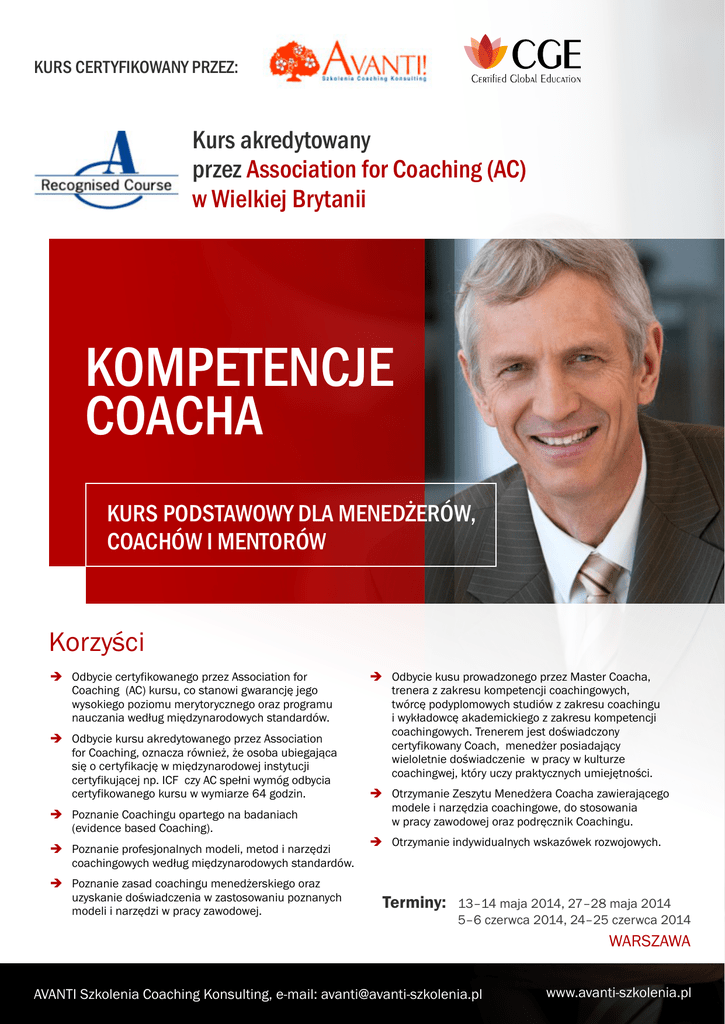 KURS CERTYFIKOWANY PRZEZ: Kurs akredytowany przez Association for Coaching (AC) w Wielkiej Brytanii KOMPETENCJE COACHA KURS PODSTAWOWY DLA MENEDŻERÓW, COACHÓW I MENTORÓW Korzyści č Odbycie certyfikowanego przez Association for Coaching (AC) kursu, co stanowi gwarancję jego wysokiego poziomu merytorycznego oraz programu nauczania według międzynarodowych standardów. č Odbycie kursu akredytowanego przez Association for Coaching, oznacza również, że osoba ubiegająca się o certyfikację w międzynarodowej instytucji certyfikującej np. ICF czy AC spełni wymóg odbycia certyfikowanego kursu w wymiarze 64 godzin. č Poznanie Coachingu opartego na badaniach (evidence based Coaching). č Poznanie profesjonalnych modeli, metod i narzędzi coachingowych według międzynarodowych standardów. č Poznanie zasad coachingu menedżerskiego oraz uzyskanie doświadczenia w zastosowaniu poznanych modeli i narzędzi w pracy zawodowej. č Odbycie kusu prowadzonego przez Master Coacha, trenera z zakresu kompetencji coachingowych, twórcę podyplomowych studiów z zakresu coachingu i wykładowcę akademickiego z zakresu kompetencji coachingowych. Trenerem jest doświadczony certyfikowany Coach, menedżer posiadający wieloletnie doświadczenie w pracy w kulturze coachingwej, który uczy praktycznych umiejętności. č Otrzymanie Zeszytu Menedżera Coacha zawierającego modele i narzędzia coachingowe, do stosowania w pracy zawodowej oraz podręcznik Coachingu. č Otrzymanie indywidualnych wskazówek rozwojowych. Terminy: 13–14 maja 2014, 27–28 maja 2014 5–6 czerwca 2014, 24–25 czerwca 2014 WARSZAWA AVANTI Szkolenia Coaching Konsulting, e-mail: [email protected] www.avanti-szkolenia.pl Kurs akredytowany przez Association for Coaching (AC) w Wielkiej Brytanii KOMPETENCJE COACHA KURS PODSTAWOWY DLA MENEDŻERÓW, COACHÓW I MENTORÓW Cele kursu č Uzyskanie kluczowych kompetencji Coacha wg kompetencji ICF i AC č Poznanie wiedzy z zakresu coachingu oraz metodyki prowadzenia procesu coachingu w organizacji oraz zarządzania ludźmi w kulturze coachingowej, č Poznanie modeli i narzędzi coachingu menedżerskiego č Uzyskanie praktycznych umiejętności Coacha czyli przygotowanie uczestników do pełnienia roli Menedżera Coacha i zarządzania w kulturze coachingowej. Dlaczego warto jest odbyć kurs „Kompetencje Coacha –kurs podstawowy dla menedżerów, Coachów i Mentorów” Organizacje w XXI wieku, aby zmierzyć się z konkurencją i rynkiem muszą być organizacjami szybo uczącymi się, czyli wiedza w organizacji jaką posiadają jej menedżerowie powinna być efektywnie gromadzona i dzielona wśród pracowników. Taką rolę pełni Mentor i mentoring w organizacji. Zarządzanie pracownikami w XXI wieku nie polega na wydawaniu rozkazów i oczekiwaniu bezwzględnego posłuszeństwa, ale na partnerstwie, zaangażowaniu pracownika, budowaniu jego odpowiedzialności i kompetencji. Za te działania odpowiedzialny jest menedżer. Jeśli potrafi on podczas rozmów z pracownikiem wspierać go w rozwoju, to pracownik, ale również cały dział w którym pracuje, rozwija się. Takie rozpowszechnianie wiedzy i umiejętności wynika z działania zasady kuli śnieżnej i zasady wzajemnego uczenia się. Umiejętności menedżera we wspieraniu innych w rozwoju stanowią więc kluczowy czynnik sukcesu organizacji, gdyż organizacja jest tak efektywna jak efektywni są jej menedżerowie, a oni są tak efektywni, jak efektywnie pracują ich pracownicy. Dlatego tak ważne jest aby menedżer posiadał umiejętności coachingowe – znał i świadomie stosował modele i narzędzia wspierające pracownika w rozwoju. Takich kompetencji – menedżera Coacha i Mentora uczy ten kurs. Po jego ukończeniu uczestnik będzie potrafił zarządzać w kulturze coachingowej i rozwijać innych. Prowadząca Wioletta Małota Executive Coach i Mentor Ekspert w zakresie Coachingu i mentoringu w Polsce, wspiera największe organizacje w zarządzaniu w kulturze coachingowej i mentoringowej, autorka artykułów z tego zakresu w prasie biznesowej, HR (Personel i Zarządzanie) i na www.infor.pl oraz naukowej. Master Coach – twórca nowych studiów podyplomowych w Wyższej Szkole Handlowej we Wrocławiu „Coaching w biznesie”, kierownik tych studiów, wykładowca przedmiotów z zakresu nauczania Coachingu (od 2010 r.). Wykładowca na studiach MBA w j. angielskim przedmiotów z zakresu przywództwa, coachingu, mentoringu. Doświadczony Executive Coach pracujący z najwyższą kadrą menedżerską. Certyfikowany Trener i Coach „Leadership Performance”, akredytowany przez Institute for Leadership and Management w Wielkiej Brytanii. Prowadziła liczne warsztaty dla menedżerów z zakresu kompetencji Coachingu menedżerskiego dla największych organizacji w Polsce m.in. dla KGHM, ZUS, BZWBK, Strabag, Empik, Dalkia, Asseco, i dla grupy ponad 100 menedżerów w szkoleniach otwartych. KONTAKT Grupa docelowa: menedżerowie, koordynatorzy projektów, osoby wspierające pracowników w rozwoju – obecni lub przyszli Coachowie wewnętrzni w organizacji. Wioletta Małota AVANTI Szkolenia Coaching Konsulting, e-mail: [email protected] tel: 22 243 10 40 , 509 399 028 www.avanti-szkolenia.pl AVANTI Szkolenia Coaching Konsulting, e-mail: [email protected] Terminy moduł I: 13–14 maja 2014 moduł II: 27–28 maja 2014 moduł III: 5–6 czerwca 2014 moduł IV: 24–25 czerwca 2014 www.avanti-szkolenia.pl Kurs akredytowany przez Association for Coaching (AC) w Wielkiej Brytanii KOMPETENCJE COACHA KURS PODSTAWOWY DLA MENEDŻERÓW, COACHÓW I MENTORÓW Terminy: 13–14 maja 2014, 27–28 maja 2014, 5–6 czerwca 2014, 24–25 czerwca 2014 WARSZAWA PROGRAM Aby kurs mógł być certyfikowany jego zakres programowy powinien wynosić minimum 64 godziny. Kurs jest realizowany w 4 modułach dwudniowych, odbywających się w odstępach 2-3 tygodniowych. Nauka odbywa się zarówno na zajęciach – poprzez praktyczne ćwiczenie poznawanych kom
