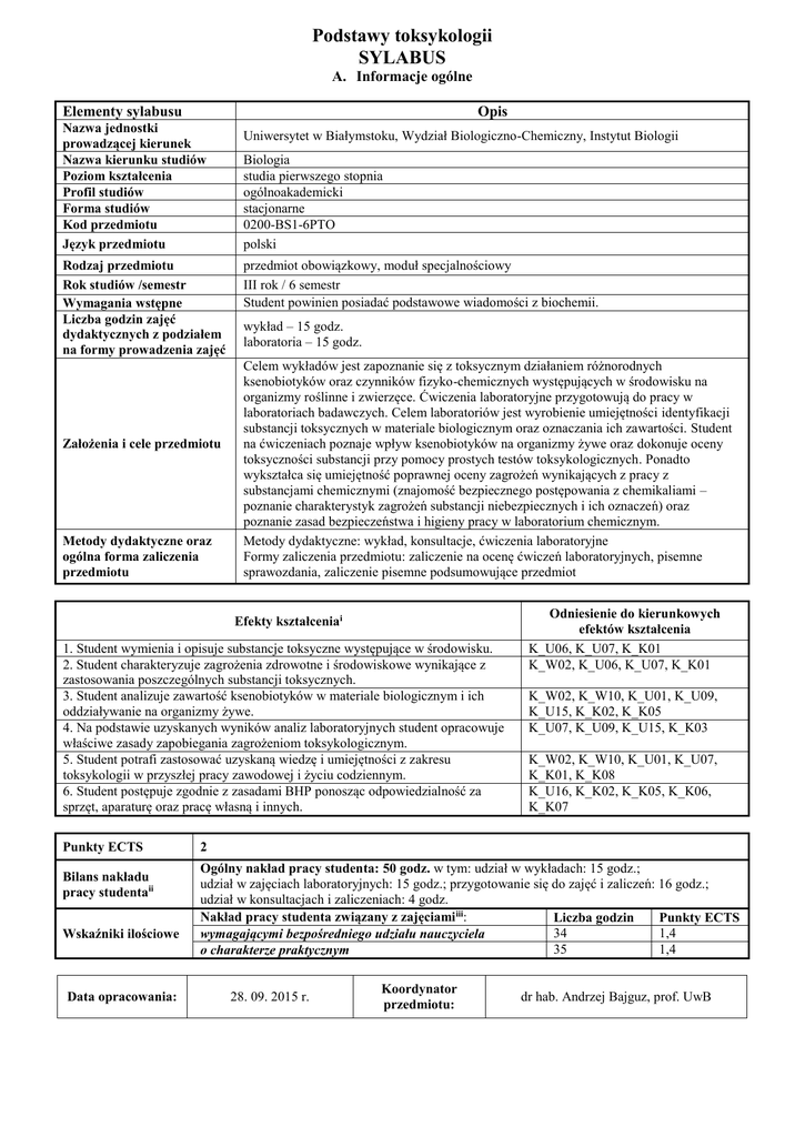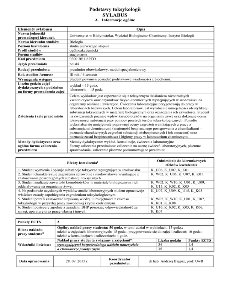 Podstawy toksykologii SYLABUS A. Informacje ogólne Elementy sylabusu Opis Nazwa jednostki prowadzącej kierunek Nazwa kierunku studiów Poziom kształcenia Profil studiów Forma studiów Kod przedmiotu Język przedmiotu Uniwersytet w Białymstoku, Wydział Biologiczno-Chemiczny, Instytut Biologii Rodzaj przedmiotu Rok studiów /semestr Wymagania wstępne Liczba godzin zajęć dydaktycznych z podziałem na formy prowadzenia zajęć przedmiot obowiązkowy, moduł specjalnościowy III rok / 6 semestr Student powinien posiadać podstawowe wiadomości z biochemii. Założenia i cele przedmiotu Metody dydaktyczne oraz ogólna forma zaliczenia przedmiotu Biologia studia pierwszego stopnia ogólnoakademicki stacjonarne 0200-BS1-6PTO polski wykład – 15 godz. laboratoria – 15 godz. Celem wykładów jest zapoznanie się z toksycznym działaniem różnorodnych ksenobiotyków oraz czynników fizyko-chemicznych występujących w środowisku na organizmy roślinne i zwierzęce. Ćwiczenia laboratoryjne przygotowują do pracy w laboratoriach badawczych. Celem laboratoriów jest wyrobienie umiejętności identyfikacji substancji toksycznych w materiale biologicznym oraz oznaczania ich zawartości. Student na ćwiczeniach poznaje wpływ ksenobiotyków na organizmy żywe oraz dokonuje oceny toksyczności substancji przy pomocy prostych testów toksykologicznych. Ponadto wykształca się umiejętność poprawnej oceny zagrożeń wynikających z pracy z substancjami chemicznymi (znajomość bezpiecznego postępowania z chemikaliami – poznanie charakterystyk zagrożeń substancji niebezpiecznych i ich oznaczeń) oraz poznanie zasad bezpieczeństwa i higieny pracy w laboratorium chemicznym. Metody dydaktyczne: wykład, konsultacje, ćwiczenia laboratoryjne Formy zaliczenia przedmiotu: zaliczenie na ocenę ćwiczeń laboratoryjnych, pisemne sprawozdania, zaliczenie pisemne podsumowujące przedmiot Efekty kształceniai 1. Student wymienia i opisuje substancje toksyczne występujące w środowisku. 2. Student charakteryzuje zagrożenia zdrowotne i środowiskowe wynikające z zastosowania poszczególnych substancji toksycznych. 3. Student analizuje zawartość ksenobiotyków w materiale biologicznym i ich oddziaływanie na organizmy żywe. 4. Na podstawie uzyskanych wyników analiz laboratoryjnych student opracowuje właściwe zasady zapobiegania zagrożeniom toksykologicznym. 5. Student potrafi zastosować uzyskaną wiedzę i umiejętności z zakresu toksykologii w przyszłej pracy zawodowej i życiu codziennym. 6. Student postępuje zgodnie z zasadami BHP ponosząc odpowiedzialność za sprzęt, aparaturę oraz pracę własną i innych. Punkty ECTS Bilans nakładu pracy studentaii Wskaźniki ilościowe Data opracowania: Odniesienie do kierunkowych efektów kształcenia K_U06, K_U07, K_K01 K_W02, K_U06, K_U07, K_K01 K_W02, K_W10, K_U01, K_U09, K_U15, K_K02, K_K05 K_U07, K_U09, K_U15, K_K03 K_W02, K_W10, K_U01, K_U07, K_K01, K_K08 K_U16, K_K02, K_K05, K_K06, K_K07 2 Ogólny nakład pracy studenta: 50 godz. w tym: udział w wykładach: 15 godz.; udział w zajęciach laboratoryjnych: 15 godz.; przygotowanie się do zajęć i zaliczeń: 16 godz.; udział w konsultacjach i zaliczeniach: 4 godz. Nakład pracy studenta związany z zajęciami iii: Liczba godzin Punkty ECTS 34 1,4 wymagającymi bezpośredniego udziału nauczyciela 35 1,4 o charakterze praktycznym 28. 09. 2015 r. Koordynator przedmiotu: dr hab. Andrzej Bajguz, prof. UwB SYLABUS B. Informacje szczegółowe Elementy składowe sylabusu Nazwa przedmiotu Podstawy toksykologii Kod przedmiotu Nazwa kierunku Nazwa jednostki prowadzącej kierunek Język przedmiotu 0200-BS1-6PTO Biologia, studia pierwszego stopnia Wydział Biologiczno-Chemiczny UwB, Instytut Biologii polski Rok studiów/ semestr trzeci rok, szósty semestr (letni) Liczba godzin zajęć dydaktycznych oraz forma prowadzenia zajęć Prowadzący 15 godz., wykład Treści merytoryczne przedmiotu: Historia i klasyfikacja trucizn. Drogi wprowadzania trucizn – ich dawki i stężenia. Wchłanianie substancji, ich metabolizm, transport, dystrybucja, akumulacja i wydalanie. Przyczyny zatruć. Czynniki wpływające na efekt toksyczny. Mechanizmy działania toksycznego na poziomie komórkowym. Biotransformacja i toksyczność wybranych substancji organicznych i nieorganicznych. Substancje toksyczne pochodzenia roślinnego i zwierzęcego, ich wpływ na organizm człowieka. Toksykologia środków odurzających. Toksykologia żywności – substancje dodatkowe w żywności, ich podział, charakterystyka i toksyczność. Pestycydy – oddziaływanie na organizm i środowisko, charakterystyka wybranych grup, degradacja i obieg w środowisku. Efekty kształcenia: 1. Student wymienia i opisuje substancje toksyczne występujące w środowisku. 2. Student charakteryzuje zagrożenia zdrowotne i środowiskowe wynikające z zastosowania poszczególnych substancji toksycznych. Efekty kształcenia wraz ze sposobem ich weryfikacji Forma i warunki zaliczenia przedmiotu Wykaz literatury podstawowej i uzupełniającej Opis dr hab. Andrzej Bajguz, prof. UwB Sposoby weryfikacji: 1. Zaliczenie pisemne podsumowujące przedmiot (test - zadania zamknięte i otwarte, opisowe, schematy i rysunki do uzupełnienia opisów i objaśnień). 1. Obecność na zajęciach (dopuszcza się możliwość opuszczenia jednego wykładu). 2. Pozytywna ocena zaliczenia laboratoriów. 3. Pozytywna ocena egzaminu. Literatura podstawowa: 1. Klaassen C.D, Watkins III J.B (pod red.), Casarett & Doull Podstawy toksykologii. MedPharm Polska, Wrocław, 2014. 2. Piotrowski J.K. (pod red.), Podstawy toksykologii. Wyd. Naukowo-Techniczne, Warszawa, 2006. Literatura uzupełniająca: 1. Seńczuk W. (pod red.), Toksykologia współczesna. Wyd. Lekarskie PZWL, Warszawa, 2006. 2. Laskowski R., Migula P., Ekotoksykologia od komórki do ekosystemu. PWRiL, Warszawa, 2004. 3. Manahan S.E., Toksykologia środowiska. Aspekty chemiczne i biochemiczne. Wyd. Naukowe PWN