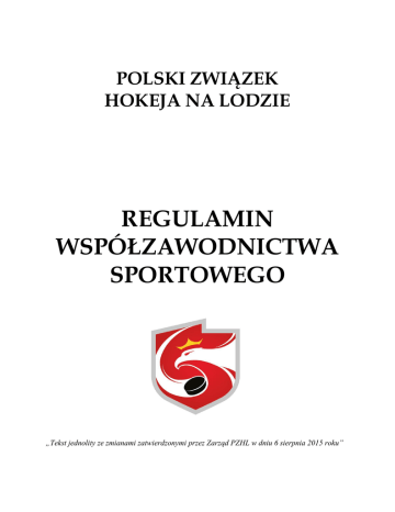 POLSKI ZWIĄZEK HOKEJA NA LODZIE REGULAMIN WSPÓŁZAWODNICTWA SPORTOWEGO „Tekst jednolity ze zmianami zatwierdzonymi przez Zarząd PZHL w dniu 6 sierpnia 2015 roku” ROZDZIAŁ I POSTANOWIENIA OGÓLNE §1 1. Niniejszy Regulamin reguluje zasady organizacji, prowadzenia oraz uczestnictwa we współzawodnictwie sportowym w hokeju na lodzie organizowanym na terenie Polski przez Polski Związek Hokeja na Lodzie (w skrócie PZHL) oraz podmioty działające z jego upoważnienia lub powołane do zarządzania ligą zawodową, na podstawie przepisów ustawy z dnia 25 czerwca 2010 roku o sporcie. 2. Przepisy regulaminu mają zastosowanie do wszystkich klubów, zawodników, trenerów i innych osób reprezentujących kluby lub zawodników, a także do sędziów, delegatów i innych osób biorących udział w organizowaniu i prowadzeniu współzawodnictwa sportowego w hokeju na lodzie – w zakresie nie uregulowanym w odrębnych przepisach wydanych przez PZHL. 3. Współzawodnictwo w lidze zawodowej organizowane jest na podstawie odrębnego regulaminu. § 2. Pojęcia użyte w regulaminie mają następujące znaczenie: 1. klub – osoba prawna prowadząca działalność w zakresie sportu i uczestnicząca lub zamierzająca uczestniczyć we współzawodnictwie sportowym organizowanym przez PZHL lub podmioty działające na jego zlecenie; 2. klub macierzysty – klub, w którym zawodnik rozpoczął udział we współzawodnictwie sportowym w hokeju na lodzie; 3. klub aktualny – ostatni klub, z którym zawodnik ma lub miał podpisany kontrakt lub podpisane zobowiązanie do reprezentowania barw klubowych, z wyłączeniem klubu, którego barwy zawodnik reprezentował na podstawie umowy o współpracy lub umowy o wypożyczeniu; 4. zawodnik – osoba fizyczna posiadająca licencję uprawniającą do uczestnictwa we współzawodnictwie sportowym w hokeju na lodzie; 5. zawodnik zagraniczny – zawodnik nie posiadający obywatelstwa polskiego; 2 6. zawodnik pochodzenia polskiego - zawodnik nieposiadający obywatelstwa polskiego, spełniający przesłanki do uznania go za osobę pochodzenia polskiego w rozumieniu obowiązujących przepisów prawa powszechnego 7. zawodnik–wychowanek – zawodnik, który po raz pierwszy zmienia barwy klubowe spełniający łącznie następujące warunki: a) ukończył lub ukończy co najmniej 14 lat w roku, w którym dokonywana jest zmiana barw klubowych, b) w macierzystym klubie brał udział w grze w okresie co najmniej dwóch sezonów przed zmianą przynależności klubowej. c) uczestniczył we współzawodnictwie sportowym w hokeju na lodzie w Polsce lub za granicą w co najmniej jednym sezonie w okresie trzech sezonów przed zmianą przynależności klubowej. Zawodnik wypożyczony nadal posiada status wychowanka o ile spełnia powyższe warunki. Okres wypożyczenia nie jest zaliczany do okresu wymienionego w lit. b) 8. zawodnik wolny – zawodnik, który nie ma podpisanego ważnego kontraktu lub zobowiązania do reprezentowania barw klubowych lub zawodnik, który nie uczestniczył we współzawodnictwie sportowym w hokeju na lodzie w Polsce lub za granicą w okresie trzech pełnych sezonów; 9. zawodnik własny – zawodnik, który: a) w poprzednim sezonie był zawodnikiem klubu i przed dniem zgłoszenia do rozgrywek nie zmieniał barw klubowych, b) w danym sezonie rozgrywkowym posiadał już ważną licencję okresową do klubu uprawniającą do gry w innej kategorii rozgrywek, c) po raz pierwszy przystępuje do współzawodnictwa sportowego w hokeju na lodzie; 10. zawodnik – reprezentant Polski – zawodnik, który w momencie podejmowania decyzji o zmianie barw klubowych na podstawie niniejszego Regulaminu brał udział w oficjalnych zawodach kalendarza IIHF w jakiejkolwiek kategorii wiekowej w ciągu ostatnich dwóch lat poprzedzających rozpoczęcie procedury zmiany barw klubowych; 11. wypożyczenie – możliwość czasowego reprezentowania innego klubu niż klub macierzysty lub klub aktualny, nie związana ze zmianą barw klubowych zawodnika; 12. zmiana barw klubowych – transfer zawodnika z jednego klubu do innego klubu nie związany z podpisaniem umowy o wypożyczeniu lub umowy o współpracy; 3 13. Promesa Listu Czystości – pisemne przyrzeczenie klubu do wydania Listu Czystości zawodnikowi-wychowankowi, pod warunkiem otrzymania ekwiwalentu za wyszkolenie zawodnika-wychowanka; 14. List Czystości – zaświadczenie potwierdzające, że zawodnik jest zawodnikiem wolnym, wydane na druku zgodnym ze wzorem PZHL; 15. kontrakt – każda umowa, z której jednoznacznie wynika, że zawodnik lub trener zobowiązuje się do reprezentowania określonego klubu we współzawodnictwie sportowym w hokeju na lodzie w okresie wskazanym w tej umowie; 16. zobowiązanie do reprezentowania barw klubowych – pisemna deklaracja zawodnika do reprezentowania barw klubowych w danym sezonie rozgrywkowym, warunkująca wydanie licencji okresowej, ważna na cały sezon, chyba że wiążący zawodnika i klub kontrakt określa warunki odstąpienia od zobowiązania przed końcem sezonu; 17. licencja klubowa - licencja potwierdzająca uprawnienie klubu do udziału we współzawodnictwie sportowym w danej sezonie i kategorii rozgrywek wydawana przez organizatora rozgrywek 18. licencja zawodnika – licencja, wydawana osobie fizycznej posiadającej obywatelstwo polskie, uprawniająca do udziału we współzawodnictwie sportowym w hokeju na lodzie; 19. licencja okresowa zawodnika – licencja potwierdzająca uprawnienie zawodnika do reprezentowania określonego klubu w danym sezonie i kategorii rozgrywek wydawana przez organizatora rozgrywek; 20. rozpoczęcie sezonu – pierwszy dzień maja roku kalendarzowego, w którym następuje rozpoczęcie rozgrywek; 21. zakończenie sezonu – ostatni dzień kwietnia roku kalendarzowego, w którym następuje zakończenie rozgrywek; 22. rozgrywki mistrzowskie – sposób organizacji współzawodnictwa sportowego w hokeju na lodzie zmierzające do wyłonie