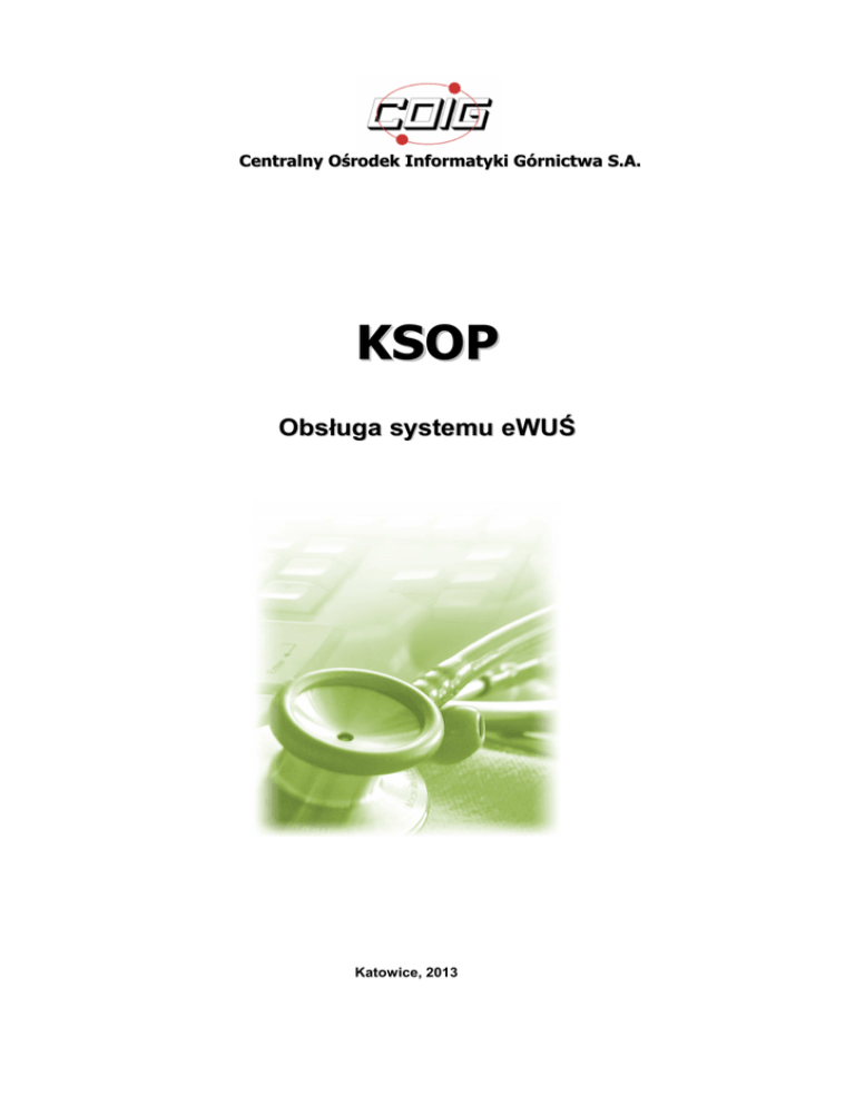 Centralny Ośrodek Informatyki Górnictwa S.A. K S OP Obsługa systemu eWUŚ Katowice, 2013 Obsługa systemu eWUŚ __________________________________________________________________ Spis treści 1. Konfiguracja systemu eWUŚ ........................................................................................................... 3 2. Logowanie się do systemu eWUŚ.................................................................................................... 6 3. Korzystanie z systemu eWUŚ .......................................................................................................... 6 4. Weryfikacja cykliczna ...................................................................................................................... 9 5. Weryfikacja automatyczna.............................................................................................................. 9 Copyright © 2013 COIG SA Wszelkie prawa zastrzeżone. Nieautoryzowane rozpowszechnianie całości lub fragmentu niniejszej publikacji w jakiejkolwiek postaci jest zabronione. Wykonywanie kopii metodą kserograficzną, fotograficzną, a także kopiowanie na nośniku filmowym, magnetycznym lub innym powoduje naruszenie praw autorskich niniejszej publikacji. COIG, Logo COIG są znakami zastrzeżonymi firmy COIG SA 2 Obsługa systemu eWUŚ __________________________________________________________________ 1. Konfiguracja systemu eWUŚ 1. Stacja robocza Aby móc korzystać z systemu eWUŚ w systemie KSOP w konfiguracji systemu dla stacji roboczej (wybranego komputera) w parametrze EWUS – „Weryfikacja statusu uprawnienia świadczeniobiorcy w oparciu o mechanizm usług sieciowych eWUŚ (NFZ)” musi być wybrana wartość różna od „brak weryfikacji” – domyślnie jest to opcja nr 3. Korzystanie z systemu na wybranym komputerze jest możliwe po wybraniu jednej z 3 opcji: 1. „Tylko w bazie KSOP – w archiwum zapytań do systemu KSOP” – tę opcję należy stosować w przypadku komputerów, które nie mają dostępu do Internetu, 2. „Tylko w systemie eWUŚ – potrzebne połączenia internetowe” - tę wartość parametru stosuje się w przypadku, gdy komputer posiada stałe połączenie do Internetu, 3. „W bazie KSOP, a w razie braku aktualnego wpisu w systemie eWUŚ – potrzebne połączenie internetowe” – system w przypadku, gdy nie był wcześniej sprawdzany status uprawnień pacjenta, wysyła zapytanie do systemu eWUŚ – jest to opcja wybrana domyślnie. W przypadku komputerów, które łączą się poprzez serwer proxy należy wprowadzić w parametrach stacji roboczej dane serwera, czyli adres (PROXY_DOM), port (PROXY_PORT), metodę uwierzytelniania (PROXY_MET) oraz Proxy – częściowe jako ścieżka (PROXY_URL). 3 Obsługa systemu eWUŚ __________________________________________________________________ 2. Użytkownik Konfiguracja dostępu użytkownika do systemu eWUŚ może się odbywać na 2 sposoby: 1. Administrator ustawia poszczególnym użytkownikom wartość parametru EWUS_ZAKR w konfiguracji systemu dla użytkownika zgodnie z dalszą instrukcją. 2. Użytkownik po zalogowaniu do systemu KSOP sam konfiguruje zakres pacjentów przez niego sprawdzanych. Po kliknięciu przycisku [Tak] przez użytkownika lub wybraniu parametru EWUS_ZAKR przez administratora wyświetla się formatka, pozwalająca zdefiniować zakres pacjentów, których dane o ubezpieczeniu są pobierane z systemu eWUŚ przez wybranego/zalogowanego użytkownika. Do wyboru jest 5 opcji: 4 Obsługa systemu eWUŚ __________________________________________________________________ 1. „Bieżąca weryfikacja” – zalogowany użytkownik sprawdza uprawnienia tylko dla wprowadzanych na bieżąco rezerwacji oraz wizyt, 2. „Brak weryfikacji” – zalogowany użytkownik nie loguje się do systemu eWUŚ, 3. „Weryfikacja własnych pacjentów” – zalogowany lekarz loguje się do systemu eWUŚ i pobiera dane dotyczące pacjentów zapisanych do niego w terminarzu, 4. „Weryfikacja wszystkich pacjentów” – użytkownik pobiera z systemu eWUŚ dane dotyczące wszystkich pacjentów zarejestrowanych na dzień dzisiejszy, 5. „Weryfikacja wszystkich pacjentów w swoich jednostkach organizacyjnych” – użytkownik pobiera z systemu informacje o pacjentach zarejestrowanych na dany dzień, w poradniach, do których jest przypisany. Istnieje możliwość wpisania do konfiguracji użytkownika systemu KSOP loginu do systemu eWUŚ poprzez parametr EWUS_LOGIN. Dana ta może być zapisana także po zalogowaniu do systemu, jeżeli w okienku logowania zostanie zaznaczona opcja „Zapisz w bazie login i identyfikator użytkownika”. 5 Obsługa systemu eWUŚ __________________________________________________________________ 2. Logowanie się do systemu eWUŚ Zalogowanie do systemu eWUŚ jest możliwe jedynie w przypadku, gdy została przeprowadzona konfiguracja systemu KSOP. Wartości pól „Oddział”, „Typ kontrahenta” oraz „Świadczeniodawca” pobierane są z danych o instalacji. Aby się zalogować należy wprowadzić login i hasło. W przypadku, gdy w konfiguracji zalogowanego użytkownika wprowadzony jest login do systemu eWUŚ, należy jedynie wprowadzić hasło i kliknąć przycisk [Zatwierdź]. Po zalogowaniu KSOP pamięta hasło do systemu eWUŚ do momentu wylogowania z/zamknięcia KSOPa. Po zaznaczeniu opcji „Zapisz w bazie hasło użytkownika” KSOP będzie podpowiadał hasło każdorazowo. Po zmianie hasła w systemie eWUŚ należy wprowadzić nowe hasło, które po poprawnym zalogowaniu będzie pamiętane i podpowiadane. 3. Korzystanie z systemu eWUŚ Po zalogowaniu do systemu eWUŚ otwiera się formatka, na której można pobrać z systemu eWUŚ dane dotyczące ubezpieczeń pacjentów poprzez wybór odpowiedniego zakresu – domyślnie jest to zakres ustawiony w konfiguracji zalogowanego użytkownika. Naciśnięcie przycisku [Rozpocznij sprawdzanie] rozpoczyna proces weryfikacji uprawnień zgodnie ze