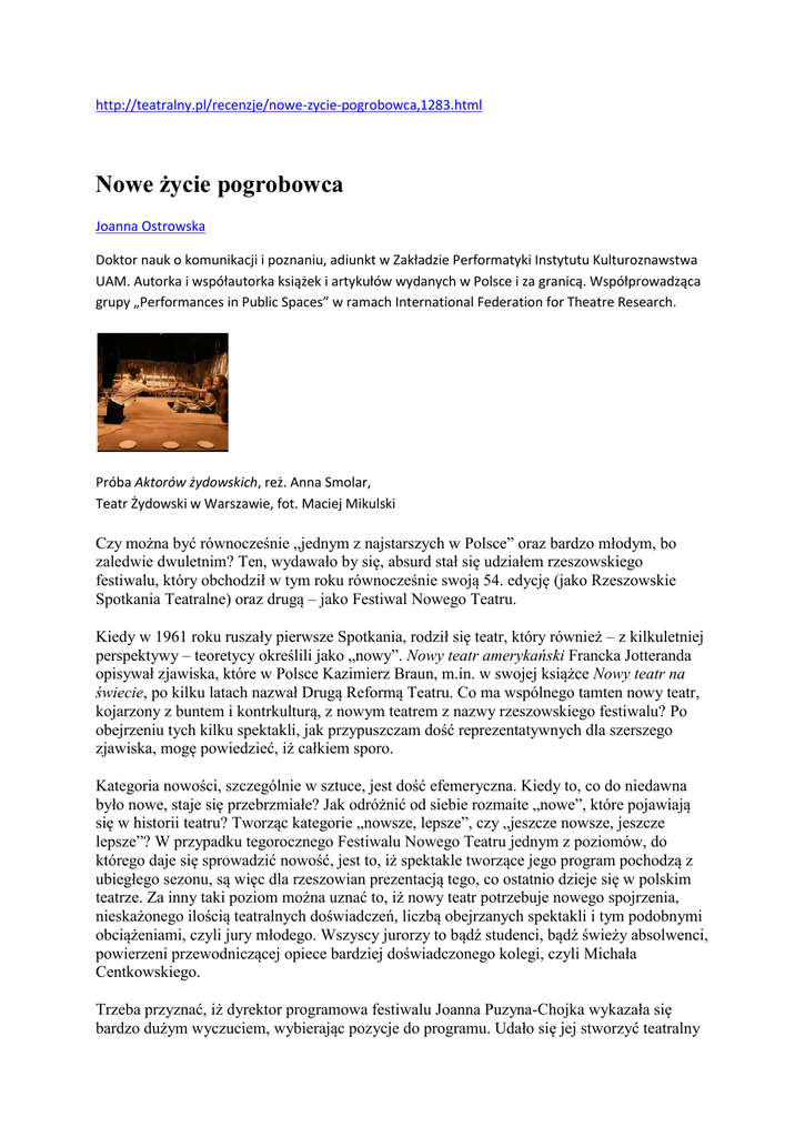 http://teatralny.pl/recenzje/nowe-zycie-pogrobowca,1283.html Nowe życie pogrobowca Joanna Ostrowska Doktor nauk o komunikacji i poznaniu, adiunkt w Zakładzie Performatyki Instytutu Kulturoznawstwa UAM. Autorka i współautorka książek i artykułów wydanych w Polsce i za granicą. Współprowadząca grupy „Performances in Public Spaces” w ramach International Federation for Theatre Research. Próba Aktorów żydowskich, reż. Anna Smolar, Teatr Żydowski w Warszawie, fot. Maciej Mikulski Czy można być równocześnie „jednym z najstarszych w Polsce” oraz bardzo młodym, bo zaledwie dwuletnim? Ten, wydawało by się, absurd stał się udziałem rzeszowskiego festiwalu, który obchodził w tym roku równocześnie swoją 54. edycję (jako Rzeszowskie Spotkania Teatralne) oraz drugą – jako Festiwal Nowego Teatru. Kiedy w 1961 roku ruszały pierwsze Spotkania, rodził się teatr, który również – z kilkuletniej perspektywy – teoretycy określili jako „nowy”. Nowy teatr amerykański Francka Jotteranda opisywał zjawiska, które w Polsce Kazimierz Braun, m.in. w swojej książce Nowy teatr na świecie, po kilku latach nazwał Drugą Reformą Teatru. Co ma wspólnego tamten nowy teatr, kojarzony z buntem i kontrkulturą, z nowym teatrem z nazwy rzeszowskiego festiwalu? Po obejrzeniu tych kilku spektakli, jak przypuszczam dość reprezentatywnych dla szerszego zjawiska, mogę powiedzieć, iż całkiem sporo. Kategoria nowości, szczególnie w sztuce, jest dość efemeryczna. Kiedy to, co do niedawna było nowe, staje się przebrzmiałe? Jak odróżnić od siebie rozmaite „nowe”, które pojawiają się w historii teatru? Tworząc kategorie „nowsze, lepsze”, czy „jeszcze nowsze, jeszcze lepsze”? W przypadku tegorocznego Festiwalu Nowego Teatru jednym z poziomów, do którego daje się sprowadzić nowość, jest to, iż spektakle tworzące jego program pochodzą z ubiegłego sezonu, są więc dla rzeszowian prezentacją tego, co ostatnio dzieje się w polskim teatrze. Za inny taki poziom można uznać to, iż nowy teatr potrzebuje nowego spojrzenia, nieskażonego ilością teatralnych doświadczeń, liczbą obejrzanych spektakli i tym podobnymi obciążeniami, czyli jury młodego. Wszyscy jurorzy to bądź studenci, bądź świeży absolwenci, powierzeni przewodniczącej opiece bardziej doświadczonego kolegi, czyli Michała Centkowskiego. Trzeba przyznać, iż dyrektor programowa festiwalu Joanna Puzyna-Chojka wykazała się bardzo dużym wyczuciem, wybierając pozycje do programu. Udało się jej stworzyć teatralny wielogłos wokół zagadnienia będącego zresztą przedmiotem jednego z paneli towarzyszących spotkaniom – jaką strategię przyjąć może „artysta w czasach oburzenia”. Równocześnie, czego potwierdzeniem może być prezentacja zbiorowej mądrości polskich czołowych krytyków teatralnych podsumowujących dla miesięcznika „Teatr” ubiegły sezon, zaprosiła ona do Rzeszowa jego najciekawsze premiery. Właściwie wyłącznie jeden spektakl – Afryka Teatru Polskiego w Bydgoszczy, nie został wymieniony w żadnej z kategorii „naj w sezonie” w „Teatrze”. Drugi z nich – Karskiego historia nieprawdziwa z Teatru im. Norwida w Jeleniej Górze, co prawda nie znalazł się w tym rankingu, lecz za to był finalistą Konkursu na Wystawienie Polskiej Sztuki Współczesnej. Wspominany w tym miejscu Konkurs ma niewątpliwe zasługi w kształtowaniu tego, co nazwać można „nowym teatrem” w Polsce. Skutecznie promując i wspierając nową dramaturgię, doprowadził niejako przypadkiem do sytuacji charakteryzowanej przez określenie „dramaturgia jednorazowego użytku”. Bardzo łatwo robić obecnie festiwale „prapremier”, bo większość współczesnych propozycji repertuarowych to pierwsze (i często jedyne) zjawienia na scenie, natomiast konia z rzędem temu, komu udałoby się zbudować program festiwalu zbierającego kolejne odczytania tego samego współczesnego polskiego dramatu. W związku z tym rzeszowski festiwal jakby siłą rzeczy stał się przeglądem tekstów „po raz pierwszy” na scenie, bo taką etykietkę można było dokleić niemal wszystkim spektaklom, łącznie z Grażyną Adama Mickiewicza w reżyserii Radosława Rychcika z Teatru im. Ludwika Solskiego w Tarnowie. Jedynym tekstem z powracającej klasyki była premierowa Kurka wodna – katastrofa jest coraz bliżej według Witkiewicza w reżyserii Jana Nowary z teatru-gospodarza. Jednak także i ta inscenizacja posiadała wiele akcentów nadających jej ów rys jednorazowości, poprzez bardzo dosłowne osadzenie akcji spektaklu we realiach współczesnych konfliktów światowych. Obecna „jednorazowość” współczesnej dramaturgii polskiej była przyczyną wielu utyskiwań badaczy teatru podczas tegorocznego spotkania PTBT w Bydgoszczy. Tak po ludzku rozumiejąc tęsknotę za „solidną” dramaturgią (jako przeciwstawieństwem tej jednorazowej) – bo nic tak nie ułatwia pracy badacza, jak śledzenie rozmaitych odczytań tego samego tekstu i porównywanie, co też reżyser X w nim znalazł i jak różni się to od historycznej i kanonicznej interpretacji reżysera Y – zupełnie nie potrafię podzielać tych żalów. Teatr jest sztuką chwili, osadzoną w czasie i dlaczego miałoby to nie dotyczyć tego jego elementu, jakim jest tekst dramatyczny? Właśnie na gruncie chwilowości i jednorazowości tekstu dramatycznego i wiążącej się z tym unikalności przedstawień teatralnych spotkały się w ramach festiwalu w Rzeszowie „nowe teatry” – ten sprzed pięćdziesięciu lat i ten współczesny. Weźmy na przykład takich Aktorów żydowskich Michała Buszewicza w reżyserii Anny Smolar z Teatru Żydowskiego w Warszawie, jedno z najciekawszych – moim zdaniem – przedstawień tego festiwalu. To opowieść snuta przez aktorów pojawiających się przed nami na wpół prywatnie, mówiących o prawdziwych epizodach ze swego życia (na ile