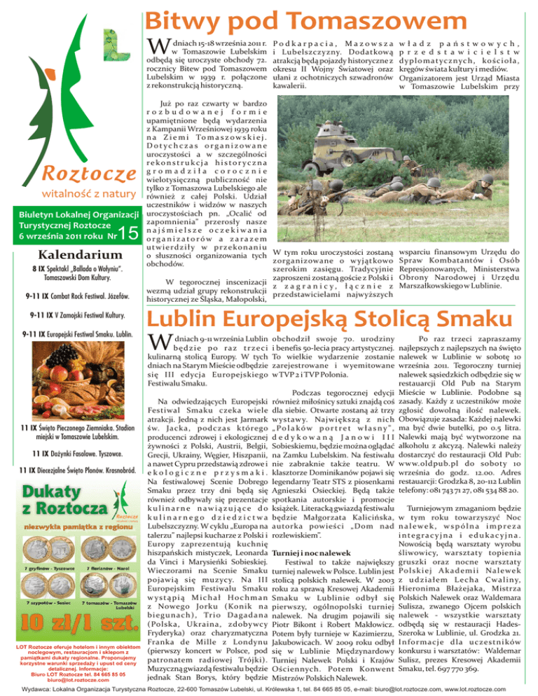 Bitwy pod Tomaszowem W dniach 15-18 września 2011 r. w Tomaszowie Lubelskim odbędą się uroczyste obchody 72. rocznicy Bitew pod Tomaszowem Lubelskim w 1939 r. połączone z rekonstrukcją historyczną. Podkarpacia, Mazowsza i Lubelszczyzny. Dodatkową atrakcją będą pojazdy historyczne z okresu II Wojny Światowej oraz ułani z ochotniczych szwadronów kawalerii. Już po raz czwarty w bardzo rozbudowanej formie upamiętnione będą wydarzenia z Kampanii Wrześniowej 1939 roku n a Z i e m i To m a s z o w s k i e j . Dotychczas organizowane uroczystości a w szczególności rekonstrukcja histor yczna gromadziła corocznie wielotysięczną publiczność nie tylko z Tomaszowa Lubelskiego ale również z całej Polski. Udział uczestników i widzów w naszych Biuletyn Lokalnej Organizacji uroczystościach pn. „Ocalić od zapomnienia” przerosły nasze Turystycznej Roztocze najśmielsze oczekiwania 6 września 2011 roku Nr organizatorów a zarazem u t w i e rd z i ł y w p r ze ko n a n i u o słuszności organizowania tych W tym roku uroczystości zostaną zorganizowane o w yjątkowo obchodów. 8 IX Spektakl „Ballada o Wołyniu”. szerokim zasięgu. Tradycyjnie zaproszeni zostaną goście z Polski i Tomaszowski Dom Kultury. W tegorocznej inscenizacji z z a g r a n i c y, ł ą c z n i e z wezmą udział grupy rekonstrukcji przedstawicielami najwyższych 9-11 IX Combat Rock Festiwal. Józefów. historycznej ze Śląska, Małopolski, władz państwowych, p r z e d s t a w i c i e l s t w dy p l o m a t yc z nyc h , ko ś c i o ł a , kręgów świata kultury i mediów. Organizatorem jest Urząd Miasta w Tomaszowie Lubelskim przy 15 Kalendarium 9-11 IX V Zamojski Festiwal Kultury. 9-11 IX Europejski Festiwal Smaku. Lublin. 11 IX Święto Pieczonego Ziemniaka. Stadion miejski w Tomaszowie Lubelskim. 11 IX Dożynki Fasolowe. Tyszowce. 11 IX Diecezjalne Święto Plonów. Krasnobród. LOT Roztocze oferuje hotelom i innym obiektom noclegowym, restauracjom i sklepom z pamiątkami dukaty regionalne. Proponujemy korzystne warunki sprzedaży i upust od ceny detalicznej. Informacje: Biuro LOT Roztocze tel. 84 665 85 05 [email protected] wsparciu finansowym Urzędu do Spraw Kombatantów i Osób Represjonowanych, Ministerstwa Obrony Narodowej i Urzędu Marszałkowskiego w Lublinie. Lublin Europejską Stolicą Smaku W dniach 9-11 września Lublin b ę d z i e p o ra z t r z e c i kulinarną stolicą Europy. W tych dniach na Starym Mieście odbędzie się III edycja Europejskiego Festiwalu Smaku. Na odwiedzających Europejski Festiwal Smaku czeka wiele atrakcji. Jedną z nich jest Jarmark św. Jacka, podczas którego producenci zdrowej i ekologicznej żywności z Polski, Austrii, Belgii, Grecji, Ukrainy, Węgier, Hiszpanii, a nawet Cypru przedstawią zdrowe i ekologiczne przysmaki. Na festiwalowej Scenie Dobrego Smaku przez trzy dni będą się również odbywały się prezentacje kulinarne nawiązujące do kulinarnego dziedzictwa Lubelszczyzny. W cyklu „Europa na talerzu" najlepsi kucharze z Polski i Europy zaprezentują kuchnię hiszpańskich mistyczek, Leonarda da Vinci i Marysieńki Sobieskiej. Wieczorami na Scenie Smaku pojawią się muzycy. Na III Europejskim Festiwalu Smaku w y s t ą p i ą M i c h a ł Ho c h m a n z Nowego Jorku (Konik na biegunach), Trio Dagadana (Polska, Ukraina, zdoby wcy Fryderyka) oraz charyzmatyczna Franka de Mille z Londynu (pierwszy koncert w Polsce, pod patronatem radiowej Trójki). Muzyczną gwiazdą festiwalu będzie jednak Stan Borys, który będzie obchodził swoje 70. urodziny i benefis 50-lecia pracy artystycznej. To wielkie wydarzenie zostanie zarejestrowane i wyemitowane w TVP 2 i TVP Polonia. Po raz trzeci zapraszamy najlepszych z najlepszych na święto nalewek w Lublinie w sobotę 10 września 2011. Tegoroczny turniej nalewek sąsiedzkich odbędzie się w restauarcji Old Pub na Starym Mieście w Lublinie. Podobne są zasady. Każdy z uczestników może zgłosić dowolną ilość nalewek. Obowiązuje zasada: Każdej nalewki ma być dwie butelki, po 0.5 litra. Nalewki mają być wytworzone na alkoholu z akcyzą. Nalewki należy dostarczyć do restauracji Old Pub: www.oldpub.pl do soboty 10 września do godz. 12.00. Adres restauarcji: Grodzka 8, 20-112 Lublin telefony: 081 743 71 27, 081 534 88 20. Podczas tegorocznej edycji również miłośnicy sztuki znajdą coś dla siebie. Otwarte zostaną aż trzy w ystaw y. Największą z nich „Polaków portret własny", dedykowaną Janowi III Sobieskiemu, będzie można oglądać na Zamku Lubelskim. Na festiwalu nie zabraknie także teatru. W klasztorze Dominikanów pojawi się legendarny Teatr STS z piosenkami Agnieszki Osieckiej. Będą także spotkania autorskie i promocje książek. Literacką gwiazdą festiwalu Turniejowym zmaganiom będzie będzie Małgorzata Kalicińska, w tym roku towarzyszyć Noc autorka powieści „Dom nad n a l e w e k , w s p ó l n a i m p r e z a rozlewiskiem”. integracyjna i edukacyjna. Nowością będą warsztaty wyrobu śliwowicy, warsztaty topienia Turniej i noc nalewek Festiwal to także największy gruszki oraz nocne warsztaty turniej nalewek w Polsce. Lublin jest Po l s k i e j A k a d e m i i Na l e we k stolicą polskich nalewek. W 2003 z u d z i a ł e m L e c h a C wa l i ny, roku za sprawą Kresowej Akademii Hieronima Błażejaka, Mistrza Smaku w Lublinie odbył się Polskich Nalewek oraz Waldemara pierwszy, ogólnopolski turniej Sulisza, zwanego Ojcem polskich nalewek. Na drugim pojawili się nalewek - wszystkie warsztaty Piotr Bikont i Robert Makłowicz. odbędą się w restauracji HadesPotem były turnieje w Kazimierzu, Szeroka w Lublinie, ul. Grodzka 21. Jakubowicach. W 2009 roku odbył Informacje dla uczestników się w Lublinie Międzynardowy konkursu i warsztatów: Waldemar Turniej Nalewek Polski i Krajów Sulisz, prezes Kresowej Akademii Ościennych. Potem Konwent Smaku, tel. 697 770 369. Mistrzów Polskich Nalewek. Wydawca: Lokalna Organizacja Turystyczn