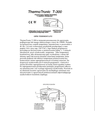 OPIS TERMOSTATU ThermoTronic T-300 to termostat przeznaczony do ogrzewania podłogowego lub innego elektrycznego o mocy do 3500W. Posiada on hermetyczny czujnik temperatury zamontowany w przewodzie o dł. Ok. 2 m oraz wzmocniony przekaźnik przełączający o max prądzie 16A ( przy nap. 230 VAC). Jego funkcje programowe pozwalają na utrzymywanie w pomieszczeniu jednej z 3 różnych określonych przez użytkownika temperatur. Albo temperatury komfortowej, albo ekonomicznej (gdy wychodzimy z domu lub idziemy spać) lub trzeciej doraźnie ustawianej temperatur, która pozwala podnieść lub obniżyć temperaturę pomieszczenia bez konieczności zmian zaprogramowanych wcześniej ustawień. Do dyspozycji użytkownika jest 8 różnych programów, z których 6 można dowolnie zaprogramować na każdy dzień tygodnia osobno. Po zaprogramowaniu przełączanie pomiędzy programami odbywa się automatycznie i nie wymaga ingerencji użytkownika. Pozwala to na obniżenie kosztów ogrzewania do niezbędnego minimum oraz utrzymywanie w ogrzewanych pomieszczeniach odpowiadającego użytkownikowi komfortu cieplnego. INSTALOWANIE BATERII Po naciśnięciu rygla znajdującego się w górnej części obudowy, należy rozchylić obie części termostatu, włożyć w oznaczone miejsca 2 alkaliczne baterie LR6, zwracając uwagę na właściwą polaryzację i zamknąć obudowę z powrotem. Na wskaźniku LCD powinno być widoczne wskazanie godziny 0:00 oraz aktualnej temperatury. Jeśli tak nie jest należy termostat zresetować naciskając przycisk RESET. USTAWIANIE CZASU Po naciśnięciu przycisku TIME, zaczyna pulsować wskaźnik dnia tygodnia. Posługując się przyciskami GÓRA,DÓŁ wybieramy właściwy dzień tygodnia, po czym naciskamy ponownie TIME. Zaczyna wtedy pulsować wskaźnik godzin, na którym przyciskami GÓRA,DÓŁ ustawiamy godzinę i jeszcze raz naciskamy TIME. Pulsuje wtedy wskaźnik minut i analogicznie przyciskami GÓRA,DÓŁ ustawiamy wskazanie minut. Na zakończenie należy nacisnąć TIME lub odczekać 10 sekund na zapamiętanie ustawień. PROGRAMOWANIE TEMPERATURY EKONOMICZNEJ I KOMFORTOWEJ Po naciśnięciu przycisku TEMP na wskaźniku LCD pojawia się aktualnie zaprogramowana temperatura. Jeśli jest przy tym widoczny znak, to jest to temperatura komfortowa. Jeżeli zaś znak , to jest to temperatura ekonomiczna. Obie te temperatury ustawia się przy pomocy przycisków GÓRA,DÓŁ, przy czym każde naciśnięcie zmienia jej wartość o 0,5 C. Przełączenie pomiędzy temperaturą komfortową a ekonomiczną odbywa się poprzez naciśnięcie przycisku / Na zakończenie programowania należy jeszcze raz nacisnąć TEMP. PROGRAMOWANIE ROZKŁADU TEMPERATUR Aby zaprogramować termostat na cały tydzień, można programować każdy dzień osobno lub grupami dni. Do dyspozycji jest 8 programów z których P1-P6 można dowolnie zaprogramować. Pozostałe dwa,P7 i P8 to programy stałe, których nie można modyfikować. Program P7 utrzymuje przez całą dobę temp. komfortową, zaś P8 temp. Ekonomiczną. Aktualny rozkład temperatury w ciągu doby jest przedstawiony na podziałce godzinowej umieszczonej w dolnej części wsk. LCD. Widoczne tam czarne kwadraciki wskazują okres utrzymywania temp. komfortowej natomiast ich brak wskazuje okres utrzymywania temp. ekonomicznej. Programowanie zaczyna się od naciśnięcia przycisku PROG. Zaczyna wtedy pulsować dzień tygodnia, więc przyciskami GÓRA,DÓŁ wybieramy właściwy dzień. Naciskamy jeszcze raz PROG i zaczyna pulsować nr programu. Przyciskami GÓRA,DÓŁ wybieramy nr programu (np. P1), po czym kolejny raz naciskamy PROG. Na ekranie LCD widoczny jest następujący obraz: Przyciskiem / należy wybrać właściwy dla aktualnego okresu programowania symbol ( dla temp. ekonomicznej lub dla temp. komfortowej i przyciskami GÓRA,DÓŁ przesuwać pulsujący kwadracik tak, by tylko w godzinach, w których ma być utrzymywana temperatura komfortowa były widoczne czarne kwadraciki. Aby podczas przesuwania pulsującego kwadracika zmienić rodzaj ustawianej temperatury z ekonomicznej na komfortową lub odwrotnie, należy w międzyczasie nacisnąć przycisk / i kontynuować programowanie przyciskami GÓRA, DÓŁ. Przycisk GÓRA przesuwa kwadracik w prawo (do przodu),natomiast przycisk DÓŁ w lewo (do tyłu),pozwalając na skorygowanie niewłaściwych ustawień. Dla ułatwienia orientacji, aktualna pozycja kwadracika jest wskazywana w postaci godziny na wskaźniku LCD. Przykład: w poniedziałek temperatura komfortowa ma być utrzymywana tylko w godz. 15-22.W pozostałych godzinach temperatura ekonomiczna. Programowanie zaczynamy od naciśnięcia PROG i następnie przyciskiem GÓRA wybieramy poniedziałek. Kolejny raz naciskamy PROG i przyciskiem GÓRA wybieramy nr programu np. P1.Jeszcze raz naciskamy PROG i na wskaźniku LCD mamy następujący obraz: Ponieważ pulsujący kwadracik wskazuje godz. 0 czyli okres w którym ma być utrzymywana temp. Ekonomiczna ale widoczny na wskaźniku LCD symbol sygnalizuje zakres temp. komfortowej, należy naciskając przycisk przełączyć termostat na ustawianie okresu temperatury ekonomicznej (na LCD widoczny znak ) i przyciskami GÓRA,DÓŁ przesuwać pulsujący kwadracik do godz.15.Wtedy rozpoczyna się okres trwania temperatury komfortowej, więc należy przyciskiem /zmienić symbol na wskaźniku LCD na (symbol określający zakres temp. komfortowej) i ponownie przyciskami GÓRA,DÓŁ przesuwać kwadracik dalej do godz. 22 z tym, że teraz kwadraciki po przesunięciu pozostają widoczne sygnalizując zaprogramowanie w tych godzinach temperatury komfortowej. Po osiągnięciu godz. 22,należy z powrotem przy pomocy przycisku / zmienić zakres na temperaturę ekonomiczną i przesunąć kwadracik do godz.0. Aby zapamiętać ustawienia należy jeszcze raz nacisnąć PROG. Taki proces programowania należy przeprowadzić dla wszystkich dni tygodnia. Można to zrobić dla każdego dnia osobno, lub jednocześnie d