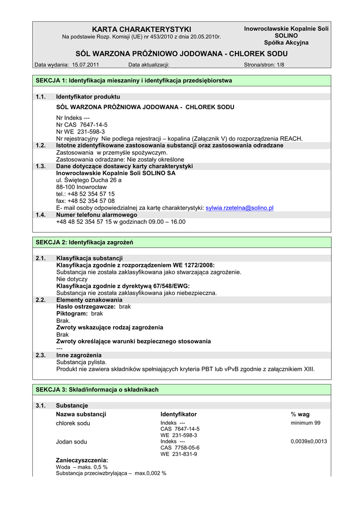 KARTA CHARAKTERYSTYKI Na podstawie Rozp. Komisji (UE) nr 453/2010 z dnia 20.05.2010r. Inowrocławskie Kopalnie Soli SOLINO Spółka Akcyjna SÓL WARZONA PRÓŻNIOWO JODOWANA - CHLOREK SODU Data wydania: 15.07.2011 Data aktualizacji: Strona/stron: 1/8 SEKCJA 1: Identyfikacja mieszaniny i identyfikacja przedsiębiorstwa 1.1. Identyfikator produktu SÓL WARZONA PRÓŻNIOWA JODOWANA - CHLOREK SODU 1.2. 1.3. 1.4. Nr Indeks --Nr CAS 7647-14-5 Nr WE 231-598-3 Nr rejestracyjny Nie podlega rejestracji – kopalina (Załącznik V) do rozporządzenia REACH. Istotne zidentyfikowane zastosowania substancji oraz zastosowania odradzane Zastosowania w przemyśle spożywczym. Zastosowania odradzane: Nie zostały określone Dane dotyczące dostawcy karty charakterystyki Inowrocławskie Kopalnie Soli SOLINO SA ul. Świętego Ducha 26 a 88-100 Inowrocław tel.: +48 52 354 57 15 fax: +48 52 354 57 08 E- mail osoby odpowiedzialnej za kartę charakterystyki: [email protected] Numer telefonu alarmowego +48 48 52 354 57 15 w godzinach 09.00 – 16.00 SEKCJA 2: Identyfikacja zagrożeń 2.1. 2.2. 2.3. Klasyfikacja substancji Klasyfikacja zgodnie z rozporządzeniem WE 1272/2008: Substancja nie została zaklasyfikowana jako stwarzająca zagrożenie. Nie dotyczy Klasyfikacja zgodnie z dyrektywą 67/548/EWG: Substancja nie została zaklasyfikowana jako niebezpieczna. Elementy oznakowania Hasło ostrzegawcze: brak Piktogram: brak Brak. Zwroty wskazujące rodzaj zagrożenia Brak Zwroty określające warunki bezpiecznego stosowania --Inne zagrożenia Substancja pylista. Produkt nie zawiera składników spełniających kryteria PBT lub vPvB zgodnie z załącznikiem XIII. SEKCJA 3: Skład/informacja o składnikach 3.1. Substancje Nazwa substancji chlorek sodu Jodan sodu Identyfikator % wag Indeks --CAS 7647-14-5 WE 231-598-3 Indeks --CAS 7758-05-6 WE 231-831-9 minimum 99 Zanieczyszczenia: Woda – maks. 0,5 % Substancja przeciwzbrylająca – max.0,002 % 0,0039±0,0013 KARTA CHARAKTERYSTYKI Na podstawie Rozp. Komisji (UE) nr 453/2010 z dnia 20.05.2010r. Inowrocławskie Kopalnie Soli SOLINO Spółka Akcyjna SÓL WARZONA PRÓŻNIOWO JODOWANA - CHLOREK SODU Data wydania: 15.07.2011 Data aktualizacji: Strona/stron: 2/8 Substancje nierozpuszczalne –max 0,05 % Wzór chemiczny: NaCl Wzór strukturalny: SEKCJA 4: Środki pierwszej pomocy 4.1. 4.2. 4.3. Opis środków pierwszej pomocy Drogi narażenia: drogi oddechowe, drogi pokarmowe, kontakt ze skórą, kontakt z oczami. Następstwa wdychania: • Wyprowadzić poszkodowana osobę na świeże powietrze. Ułożyć w wygodnej pozycji. Zapewnić ciepło i spokój. • Utrzymywać drożność dróg oddechowych. • W razie potrzeby wezwać pomoc lekarską. Następstwa połknięcia: • Przepłukać usta. Podać do wypicia dużą ilość wody. Nie wywoływać wymiotów. Zapewnić spokój, leżenie i ciepło. • W razie potrzeby zapewnić pomoc lekarską. Kontakt z oczami: • Przemyć zanieczyszczone oczy większą ilością letniej wody przez 15 - 20 minut, przy wywiniętych powiekach (usunąć przedtem szkła kontaktowe). • W przypadku konieczności zapewnić konsultację lekarza – okulisty.. Kontakt ze skórą: • Zdjąć zanieczyszczone ubranie. Oczyścić zanieczyszczoną skórę, przemyć wodą a następnie wodą z łagodnym mydłem. • Zasięgnąć porady dermatologa gdy wystąpi podrażnienie skóry. Najważniejsze ostre i opóźnione objawy oraz skutki narażenia Duża koncentracja pyłu substancji może powodować mechaniczne podrażnienie skóry, oczu i dróg oddechowych. Spożycie dużych ilości może spowodować mdłości, wymioty. Wskazania dotyczące wszelkiej natychmiastowej pomocy lekarskiej i szczególnego postępowania z poszkodowanym W miejscu pracy powinny być dostępne środki umożliwiające pierwszą pomoc przedlekarską. SEKCJA 5: Postępowanie w przypadku pożaru 5.1. 5.2. 5.3. Środki gaśnicze Odpowiednie środki gaśnicze do gaszenia pożarów w sąsiedztwie: rozproszona woda, ditlenek węgla CO2, proszki gaśnicze, piana gaśnicza. Niewłaściwe środki gaśnicze: Nie stosować zwartych strumieni wody na palącą się powierzchnię. Szczególne zagrożenia związane z substancją Specyficzne zagrożenia podczas pożaru. Podczas spalania tworzą się toksyczne produkty rozkładu termicznego: chlor, chlorowodór, tlenek sodu. Zagrożenia wybuchowe: Nie występuje. Informacje dla straży pożarnej Stosować standardowe metody gaszenia pożarów chemicznych. Pojemniki narażone na działanie wysokiej temperatury chłodzić wodą i w miarę możliwości usunąć z zagrożonego obszaru. Sprzęt ochronny strażaków: Ubrania odporne na działanie wysokich temperatur. Niezależne aparaty izolujące drogi oddechowe. KARTA CHARAKTERYSTYKI Na podstawie Rozp. Komisji (UE) nr 453/2010 z dnia 20.05.2010r. Inowrocławskie Kopalnie Soli SOLINO Spółka Akcyjna SÓL WARZONA PRÓŻNIOWO JODOWANA - CHLOREK SODU Data wydania: 15.07.2011 Data aktualizacji: Strona/stron: 3/8 SEKCJA 6: Postępowanie w przypadku niezamierzonego uwolnienia do środowiska 6.1. 6.2. 6.3. 6.4. Indywidualne środki ostrożności, wyposażenie ochronne i procedury w sytuacjach awaryjnych Zapewnić odpowiednią wentylację ogólną i miejscową. W warunkach produkcyjnych zakładać odzież ochronną z materiałów naturalnych (bawełna) lub włókien syntetycznych, rękawice wykonane z lateksu, neoprenu, nitrylu lub PCV. W warunkach przemysłowych stosować okulary ochronne typu gogle. Nie pić, nie jeść i nie palić w trakcie używania. Unikać bezpośredniego kontaktu z substancją. Unikać wdychania pyłu. Środki ostrożności w zakresie ochrony środowiska Nie dopuścić do zanieczyszczenia środowiska. Zabezpieczyć studzienki ściekowe. W przypadku poważnego zanieczyszczenia cieku wodnego, systemu kanalizacyjnego lub zanieczyszczenia gruntu, powiadomić odpowiednie władze administracyjne i kontrolne oraz organizacje ratownicze. Metody i materiały zapobiegające rozprzestrzenianiu 