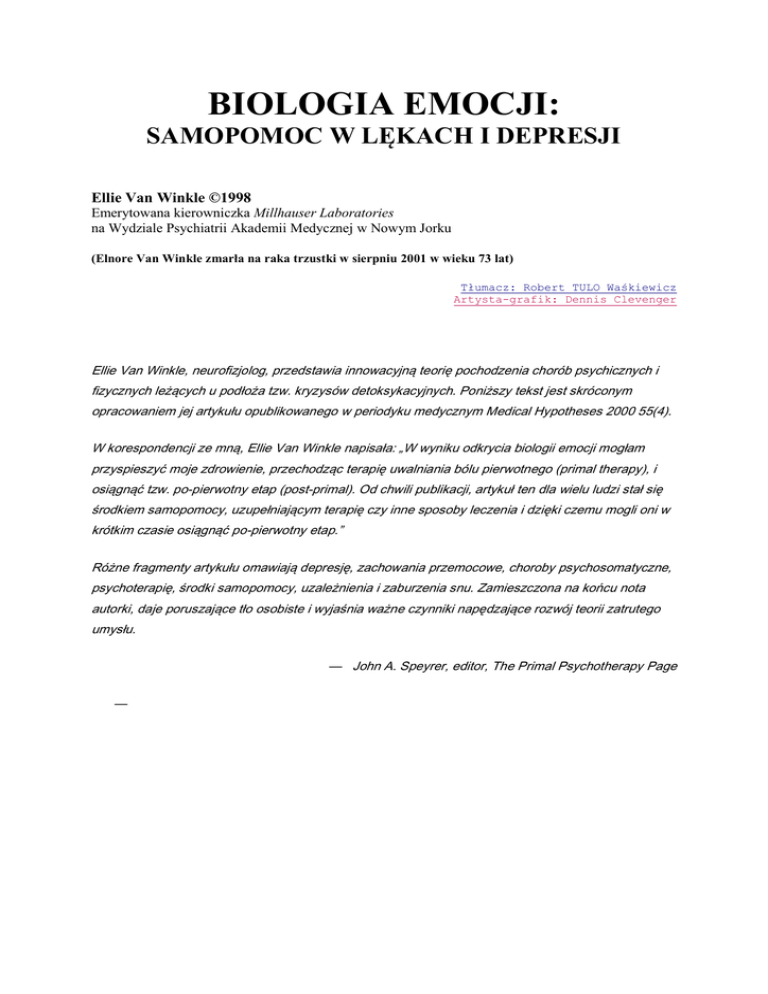 BIOLOGIA EMOCJI: SAMOPOMOC W L KACH I DEPRESJI Ellie Van Winkle ©1998 Emerytowana kierowniczka Millhauser Laboratories na Wydziale Psychiatrii Akademii Medycznej w Nowym Jorku (Elnore Van Winkle zmarøa na raka trzustki w sierpniu 2001 w wieku 73 lat) Tøumacz: Robert TULO Wa kiewicz Artysta-grafik: Dennis Clevenger Ellie Van Winkle, neurofizjolog, przedstawia innowacyjną teorię pochodzenia chorób psychicznych i fizycznych leżących u podłoża tzw. kryzysów detoksykacyjnych. Poniższy tekst jest skróconym opracowaniem jej artykułu opublikowanego w periodyku medycznym Medical Hypotheses 2000 55(4). W korespondencji ze mną, Ellie Van Winkle napisała: „W wyniku odkrycia biologii emocji mogłam przyspieszyć moje zdrowienie, przechodząc terapię uwalniania bólu pierwotnego (primal therapy), i osiągnąć tzw. po-pierwotny etap (post-primal). Od chwili publikacji, artykuł ten dla wielu ludzi stał się środkiem samopomocy, uzupełniającym terapię czy inne sposoby leczenia i dzięki czemu mogli oni w krótkim czasie osiągnąć po-pierwotny etap.” Różne fragmenty artykułu omawiają depresję, zachowania przemocowe, choroby psychosomatyczne, psychoterapię, środki samopomocy, uzależnienia i zaburzenia snu. Zamieszczona na końcu nota autorki, daje poruszające tło osobiste i wyjaśnia ważne czynniki napędzające rozwój teorii zatrutego umysłu. — John A. Speyrer, editor, The Primal Psychotherapy Page — Motto: „Jeśli nie wydobędziesz tego, co w Tobie zalega, To, co czego nie wydobędziesz, zniszczy cię.” Ewangelia gnostycka św. Tomasza TOKSYCZNY POTOP W UMY LE LUDZKO CI Każde dziecko rodzi się z instynktowną reakcją “walcz lub uciekaj,” co jest służącym przetrwaniu darem natury. Aby zaspokajać swoje potrzeby i unikać zagrożeń, korzystamy z tej reakcji przez całe życie. Częścią tej reakcji jest instynktowne wyrażanie złości. Takim wyrazem złości u noworodka jest płacz. Kiedy rodzice źle traktują lub zaniedbują emocjonalnie niemowlę, zmuszają je tym zazwyczaj do stłumienia jego usprawiedliwionej złości. A kiedy owa złość towarzysząca reakcji “walcz lub uciekaj” jest stale tłumiona, neurony w mózgu zatykają się i powstaje toksykoza, która jest źródłem przyszłych symptomów emocjonalnej i psychicznej choroby. Wiemy, że nawet fizyczne rany goją się szybciej, jeśli możemy wyrażać wściekłość. Słodka kołysanka: „Cicho, maleństwo, nie płacz już, nie płacz…” służy wygodzie rodziców, ale sprzeciwia się dobru dziecka. Nawet, gdy nie mamy żadnych wspomnień bycia wykorzystywanym czy zaniedbanym emocjonalnie, większość z nas została nauczona tłumienia złości. DEPRESJA Kiedy, w wyniku kumulacji nadmiaru neurotransmiterów i innych substancji neurochemicznych, powstaje w mózgu toksykoza, neurony nie mogą uwalniać wystarczających ilości neurotransmisyjnych cząstek do pobudzania reszty systemu nerwowego i pojawiają się objawy depresji. Depresja jest także wywoływana przez zatkanie receptorów endogennymi (pochodzenia wewnętrznego) substancjami neurochemicznymi, oraz egzogennymi substancjami neurochemicznymi (pochodzącymi z zewnętrznego środowiska), jak niezmetabolizowane pokarmy, narkotyki i inne toksyny. KRYZYSY DETOKSYKACYJNE A L K I ZACHOWANIA PRZEMOCOWE Kiedy komórki ciała zostają zatrute, zazwyczaj obumierają i zostają przez organizm zastąpione nowymi. Komórki nerwowe jednak zasadniczo nie odnawiają się, więc gdy neuron zostaje zatruty, jego część pęka i uwalnia toksyny podczas stanu, jaki można nazwać kryzysem detoksykacyjnym. W trakcie takiego kryzysu synapsy zostają zalane nadmiarem cząsteczek neurotransmisyjnych i innych substancji neurochemicznych. Toksyny te zawierają nadmiar neurotransmisyjnej noradrenaliny, a także adrenaliny, dopaminy, serotoniny, GABA, endorfin i innych substancji. System nerwowy zostaje przesadnie pobudzony nadmiarem neurotransmiterów, co wywołuje spektrum objawów podniecenia – od łagodnego lęku aż do manii i skrajnych aktów przemocy. Objawami odstawienia po takim zalaniu jest neurotyczny lęk i wściekłość. Ze względu na ścieżki neuronalne w mózgu, objawy te mogą też być takie, jak w chorobie Parkinsona czy Alzheimera, w zaburzeniach neurologicznych i w chorobach psychosomatycznych. Wszystkie te symptomy są zdarzeniami uzdrawiającymi i najlepiej jest, jeśli nie są tłumione. Jednak intensywny lęk, jaki powstaje w wyniku uwolnienia nadmiaru adrenaliny, jak też inne symptomy pobudzeniowe, są sygnałem próbującej się uzewnętrznić złości, która – w czasie takich detoksykacyjnych kryzysów – musi zostać przekierowana na pierwotnych oprawców, aby symptomy pobudzeniowe mogły za każdym razem wzmocnić leczniczy efekt kryzysu detoksykacyjnego. Po takim kryzysie, niektóre substancje neurochemiczne zatykają receptory, co może powodować wystąpienie lub nawrót objawów depresji. Zdrowienie jest ciągiem periodycznych uwolnień owych akumulacji neurochemicznych, a kiedy proces ten dobiegnie końca, dana osoba nie będzie więcej doświadczać lęków ani depresji. Wiele określeń używanych do opisu chorób psychicznych jest w fizjologicznym sensie trafna. Załamanie nerwowe to nic innego niż rozerwanie neuronów w celu uwolnienia zgromadzonych w nich toksyn. Szaleństwo dotyczy szału, wpadania w szał. Kryzys detoksykacyjny może być wyolbrzymioną reakcją “walcz lub uciekaj,” gdzie złość uwalnia się we wściekłym szale. Edgar Allen Poe w "The Tell-Tale Hart" (Opowiadające serce) napisał, że obłęd jest niczym innym tylko nadaktywnością systemu nerwowego. Poe rozumiał intuicyjnie, że jego charakter był doprowadzany do obłędu głośnym łomotaniem własnego serca – aktywnością związaną ze złością i lękiem i przyspieszaną przez nadmiar neurotransmiterów. Z powodu przerywanej charakterystyki transmisji neuronalnej oraz zatykania się pewnych neuronalnyc