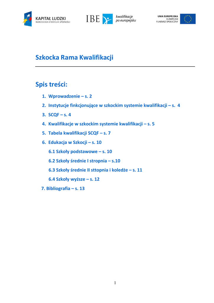 Szkocka Rama Kwalifikacji Spis treści: 1. Wprowadzenie – s. 2 2. Instytucje finkcjonujące w szkockim systemie kwalifikacji – s. 4 3. SCQF – s. 4 4. Kwalifikacje w szkockim systemie kwalifikacji – s. 5 5. Tabela kwalifikacji SCQF – s. 7 6. Edukacja w Szkocji – s. 10 6.1 Szkoły podstawowe – s. 10 6.2 Szkoły średnie I stropnia – s.10 6.3 Szkoły średnie II sttopnia i koledże – s. 11 6.4 Szkoły wyższe – s. 12 7. Bibliografia – s. 13 1 1. Wprowadzenie Szkocka Rama Kwalifikacji – The Scottish Credit and Qualifications Framework (SCQF) – funkcjonuje już od roku 2001. Celem inicjatywy, w wyniku której powstała, było stworzenie spójnego i przejrzystego systemu kwalifikacji, łatwego do zrozumienia i stosowania. Szkocka Rama Kwalifikacji miała: wspierać i ułatwiać uczenie się przez całe życie; jasno wyznaczać warunki brzegowe kwalifikacji (wymagania wstępne i uzyskiwane korzyści) oraz programów nauczania na dowolnym poziomie; wytyczać klarowne ścieżki kariery; pozwalać na określenie poziomu funkcjonujących w Szkocji kwalifikacji; wskazywać zależności między kwalifikacjami lub programami nauczania oraz pomagać uczącym się w dalszym rozwoju. Prace nad Szkocką Ramą Kwalifikacji przebiegały w latach 1998 – 2001. Brały w nich udział: Quality Assurance Agency (QAA), czyli niezależny urząd stojący na straży standardów i jakości nauczania na obszarze uczelni wyższych w Szkocji (formalnie QAA Scotland, nie mylić z QAA działającym w Anglii); Scottish Qualifications Authority (SQA), urząd autoryzujący podmioty przyznające kwalifikacje zawodowe; Universities Scotland, czyli reprezentacja 19 uczelni wyższych; wspierane przez odpowiadające za edukację departamenty szkockiego rządu oraz Scottish Advisory Committee on Credit and Access (SACCA), czyli połączony komitet QAA i Universities Scotland, złożony z przedstawicieli szkockich uniwersytetów i koledżów (patrz też niżej: “Instytucje funkcjonujące w szkockim systemie kwalifikacji”). Szkocka Rama Kwalifikacji zaadaptowała wcześniej istniejące: SCOTCAT (Scottish Credit Accumulation and Transfer) funkcjonujące od 1992 w obszarze edukacji wyższej, ramę dla krajowych placówek edukacyjnych, kursów etc. stworzoną w ramach inicjatywy Higher Still, obowiązującą w szkołach i uczelniach w latach 1994 – 2000 (za: „Referencing The 2 Qualifications Frameworks of The United Kingdom to The European Qualifications Framework”). Prace nad odniesieniem SCQF do Europejskiej Ramy Kwalifikacji (ERK) podjęto zgodnie z zaleceniem Parlamentu Europejskiego i Rady Europy z 23 kwietnia 2008 roku. Celem tych prac, poza realizacją celów Unii Europejskiej (stworzenie funkcjonalnego wspólnego rynku pracy, ze sprawnym i transparentnym systemem porównywania, weryfikacji i walidacji kwalifikacji), była konsolidacja i zwiększenie efektywności już funkcjonującego, reformowanego od ćwierćwiecza systemu. Na początku 2008 roku Quality Committee, organ doradczy Scottish Credit and Qualifications Framework Partnership, powstałego w 2006 roku stowarzyszenia (patrz niżej: “Instytucje funkcjonujące w szkockim systemie kwalifikacji”), którego celem był dalszy rozwój Szkockiej Ramy Kwalifikacji, powołał niezależnego konsultanta. Jego zadaniem było odniesienie dwunastopoziomowej SCQF do ośmiopoziomowej Europejskiej Ramy Kwalifikacji (ERK). Jednocześnie komisja ta ustanowiła ciało doradcze SCQF-EQF Steering Group, pomagające konsultantowi we wszelkich działaniach dotyczących jego zadania. Członkowie SCQF-EQF Steering Group spotkali się po raz pierwszy w lipcu 2008 roku, co należy uznać za początek właściwych prac nad realizacją zalecenia Parlamentu Europejskiego i Rady Europy wydanego trzy miesiące wcześniej Porównania Szkockiej Ramy Kwalifikacji SCQF do ośmiopoziomowej Europejskiej Ramy Kwalifikacji dokonano w 2009 roku (patrz niżej: tabela “Odniesienie poziomów SCQF do poziomów ERK”) i opisano w szkockim raporcie referencyjnym. Liczba mieszkańców Szkocji PKB na jednego mieszkańca (w funtach) Nakłady na edukację 5 295 000 26 766 7,8 3 (w procentach PKB) 2. Instytucje funkcjonujące w szkockim systemie kwalifikacji Instytucją odpowiedzialną za szkocki system kwalifikacji, w tym za ramę kwalifikacji i prowadzenie rejestru kwalifikacji, jest Scottish Credit and Qualifications Framework Partnership (SCQF Partnership). W jego skład wchodzą: Association of Scotland’s Colleges; Quality Assurance Agency for Higher Education; Scottish Qualifications Authority (SQA) – autonomiczne ciało pozarządowe fiansowane przez Scottish Government Schools Directorate. Odpowiada za nadawanie kwalifikacji, akredytację niektórych podmiotów nadających kwalifikacje oraz walidację kwalifikacji innych niż dyplomy szkół wyższych; Universities Scotland – podmiot reprezentujący szkoły wyższe; przedstawiciele ministerstw. SCQF Partnership pełni funkcję Krajowego Punktu Koordynacyjnego (NCP). Ma status organizacji charytatywnej, co zabezpiecza go przed możliwymi naciskami politycznymi, na przykład ze strony ministerstw. 3. SCQF Szkocka Rama Kwalifikacji liczy dwanaście poziomów. Poziom pierwszy odnosi się do zdobywania elementarnego doświadczenia, przy pomocy instruktora/opiekuna, na przykład umiejętności włączenia komputera i uruchomienia przeglądarki internetowej. Poziomy od drugiego do dwunastego opisane są przez deskryptory w pięciu kategoriach: wiedza i zrozumienie (głównie odnosi się to do danego przedmiotu); wykorzystanie wiedzy i rozumienia w praktyce; ogólne umiejętności poznawcze (na przykład ocena, analiza krytyczna); komunikacja, kompetencje matematyczne i umiejętności w zakresie IT; samodzielność, odpowiedzialność i zdolność do współpracy. 4 Ze względu na różnicę w liczbie poziomów obu ram oraz szerokie spektrum SCQF, obejmującej także efekty uczenia się na pozomach niższych, niż obejmuje