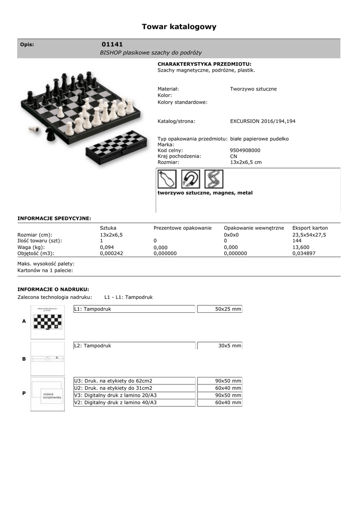 Towar katalogowy 01141 Opis: BISHOP plasikowe szachy do podróży CHARAKTERYSTYKA PRZEDMIOTU: Szachy magnetyczne, podróżne, plastik. Materiał: Kolor: Kolory standardowe: Tworzywo sztuczne Katalog/strona: EXCURSION 2016/194,194 Typ opakowania przedmiotu: Marka: Kod celny: Kraj pochodzenia: Rozmiar: białe papierowe pudełko 9504908000 CN 13x2x6,5 cm tworzywo sztuczne, magnes, metal INFORMACJE SPEDYCYJNE: Sztuka 13x2x6,5 1 0,094 0,000242 Rozmiar (cm): Ilość towaru (szt): Waga (kg): Objętość (m3): Prezentowe opakowanie 0 0,000 0,000000 Opakowanie wewnętrzne 0x0x0 0 0,000 0,000000 Maks. wysokość palety: Kartonów na 1 palecie: INFORMACJE O NADRUKU: Zalecona technologia nadruku: L1 - L1: Tampodruk L1: Tampodruk 50x25 mm L2: Tampodruk 30x5 mm A B P U3: U2: V3: V2: Druk. na Druk. na Digitalny Digitalny etykiety do 62cm2 etykiety do 31cm2 druk z lamino 20/A3 druk z lamino 40/A3 90x50 60x40 90x50 60x40 mm mm mm mm Eksport karton 23,5x54x27,5 144 13,600 0,034897