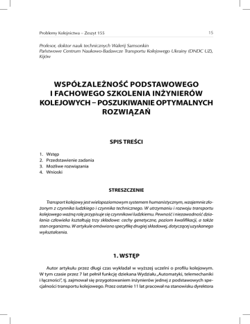 Problemy Kolejnictwa – Zeszyt 155 15 Profesor, doktor nauk technicznych Walerij Samsonkin Państwowe Centrum Naukowo-Badawcze Transportu Kolejowego Ukrainy (DNDC UZ), Kijów WSPÓŁZALEŻNOŚĆ PODSTAWOWEGO I FACHOWEGO SZKOLENIA INŻYNIERÓW KOLEJOWYCH – POSZUKIWANIE OPTYMALNYCH ROZWIĄZAŃ SPIS TREŚCI 1. 2. 3. 4. Wstęp Przedstawienie zadania Możliwe rozwiązania Wnioski STRESZCZENIE Transport kolejowy jest wielopoziomowym systemem humanistycznym, wzajemnie złożonym z czynnika ludzkiego i czynnika technicznego. W utrzymaniu i rozwoju transportu kolejowego ważną rolę przypisuje się czynnikowi ludzkiemu. Pewność i niezawodność działania człowieka kształtują trzy składowe: cechy genetyczne, poziom kwalifikacji, a także stan organizmu. W artykule omówiono specyfikę drugiej składowej, dotyczącej uzyskanego wykształcenia. 1. WSTĘP Autor artykułu przez długi czas wykładał w wyższej uczelni o profilu kolejowym. W tym czasie przez 7 lat pełnił funkcję dziekana Wydziału „Automatyki, telemechaniki i łączności”, tj. zajmował się przygotowaniem inżynierów jednej z podstawowych specjalności transportu kolejowego. Przez ostatnie 11 lat pracował na stanowisku dyrektora W. Samsonkin 16 organizacji naukowo-badawczej, znajdującej się w strukturze państwowej administracji transportu kolejowego Ukrainy, czyli był odbiorcą „produkcji” wyższej uczelni. Niniejszy artykuł stanowi analizę procesu nauczania w wewnętrznych i zewnętrznych warunkach Ukrainy. 2. PRZEDSTAWIENIE ZADANIA Spór na temat: „Co ważniejsze: podstawowe albo zawodowe nauczanie?” to wieczny dylemat wyższych uczelni o profilu technicznym (kolejowym). To zrozumiałe: oba rodzaje kształcenia są nieodłącznymi składnikami każdego planu nauczania. Zwycięzcą sporu nt. koncepcji nauczania jest raz jedna, raz druga strona. Kryterium zwycięstwa jest stan, w jakim znajduje się transport kolejowy: • Stan stabilny – środki techniczne (pojazdy kolejowe, urządzenia automatyki kolejowej) po planowanym ich odnowieniu, eksploatuje się przez około 10 lat. Wyższe uczelnie są wyposażone w bazę laboratoryjną, mają opracowaną metodykę prowadzenia działalności, są określone ilości oraz miejsca wdrażania środków technicznych. W takim przypadku przeważa zawodowe kształcenie. • Stan przemian – to techniczne, technologiczne lub strukturalne innowacje. W tym stanie w przedsiębiorstwie kolejowym odczuwa się potrzebę głębszego przygotowania podstawowego, pozwalającego na szybsze adaptowanie się do wymagań nowej techniki (której nie uczono w wyższej uczelni) i zupełnie nowych technologii, zmieniających warunki wzajemnego oddziaływania systemu „transport kolejowy – – otoczenie”. Cechy tego sporu tłumaczy się obecnie następującymi okolicznościami: • Dostrzegalne jest obniżenie poziomu przygotowania abiturientów. Szczególnie obserwuje się to w podstawowym przygotowaniu młodych specjalistów, bowiem „wczorajsi” studenci uczą się stale fachowych spraw i po pewnym czasie większość z nich staje się w pełni wykwalifikowanymi fachowcami. • „Technokratyczna” koncepcja wyższego wykształcenia technicznego. Historycznie złożyło się tak, że personel inżynieryjno-techniczny i administracyjny transportu kolejowego, kształcąc się w wyższej szkole technicznej, studiuje te same przedmioty w jednakowym zakresie. Tymczasem zainteresowania powinny być zróżnicowane: dla pracowników administracyjnych ważniejsze jest przygotowanie podstawowe i humanistyczne, dla kadry inżynieryjno-technicznej – zawodowe i podstawowe. Sytuację mógłby zmienić istniejący system podwyższenia kwalifikacji, ale ponieważ jest on realizowany w tych samych wyższych uczelniach przez tę samą kadrę wykładowców, to opisany stan nie zmienia się. • Reformowanie transportu kolejowego w większości państw byłego ZSRR doprowadziło do łamania dobrze znanych na co dzień zwyczajnych faktów: niepewności w karierze młodych specjalistów, nieodzowności nawyków pracy i życia w środowisku Współzależność podstawowego i fachowego szkolenia inżynierów kolejowych… 17 rynkowym, społecznych i psychologicznych napięć występujących zarówno w całym społeczeństwie, jak i w przedsiębiorstwach transportu kolejowego. Oto jak wygląda ilościowe obciążenie w wyższych uczelniach o profilu kolejowym 4-go poziomu akredytacji. W planie nauczania ogółem istnieją 3 bloki (humanistyczny, podstawowy, specjalistyczny), które przyjęto za 100%. W tablicy pokazano procentowy udział godzin nauczania w kształceniu podstawowym i zawodowym. Specjalność Kształcenie Tabor Automatyka i telekomunikacja Podstawowe 34% 33% Specjalistyczne 56% 45% Widać wyraźną przewagę kształcenia specjalistycznego nad podstawowym. W specjalności „Tabor” stosunek kształcenia specjalistycznego do zawodowego wynosi 1,65, w specjalności „Automatyka i telekomunikacja” 1,36 (zakres humanistycznego kształcenia w tych dwóch specjalnościach różni się więcej niż dwa razy, ale to już zupełnie inna historia). W warunkach Ukrainy taka sytuacja jest oczywista, co tłumaczy się tym, że na kształtowanie planów nauczania decydujący wpływ mają katedry wypuszczające absolwentów, całkowicie zajmujące się kształceniem specjalistycznym. Właściwe pytanie to: Jakie powinny być te proporcje? Z jednej strony, odpowiedzią na to pytanie może być kryterium przedstawione na początku artykułu, a z drugiej strony – w celu dokładniejszego określenia proporcji kształcenia podstawowego i specjalistycznego należy przeanalizować nie tylko rejestr dyscyplin, ale i robocze programy nauczania każdej z nich. Często programy nauczania są wytworem twórczości wykładowcy i w specjalistycznej dyscyplinie mogą znajdować się tematy należące do kształcenia podstawowego i odwrotnie. Z trzeciej strony natomiast, problem ma czysto scholastyczn