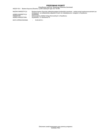 PRZEDMIAR ROBÓT 45223110-0 Klasyfikacja robót wg. Wspólnego Słownika Zamówień Bariera fizyczna (Ścianka z profili stalowych typu GU 16-400 NAZWA INWESTYCJI : ADRES INWESTYCJI INWESTOR ADRES INWESTORA : : : DATA OPRACOWANIA Budowa bariery fizycznej zabezpieczającej środowisko gruntowo - wodne przed zanieczyszczeniami pochodzącymi ze składowiska odpadów innych niż niebezpieczne i obojętne w Szydłowcu. Szydłowiec Samorządowy Zakład Usług Komunalnych w Szydłowcu Szydłowiec, ul. Kamienna 70 : 16.05.2013 r. Dokument został opracowany przy pomocy programu NORMA PRO Szydłowiec-Wykonanie bariery fizycznej.PRD Lp. Podstawa Opis i wyliczenia j.m. Poszcz Razem Budowa bariery fizycznej zabezpieczającej środowisko gruntowo - wodne przed zanieczyszczeniami pochodzącymi ze składowiska odpadów innych niż niebezpieczne i obojętne w Szydłowcu. 1 45223110-0 Bariera fizyczna (Ścianka z profili z tworzywa sztucznego) 1 KNNR 1 Roboty pomiarowe przy liniowych robotach ziemnych km d.1 0111-02 22,3/1000 km 0,022 RAZEM 0,022 2 KNR 2-01 Plantowanie skarp i dna wykopów wykonywanych ręcznie w gr.kat.V-VI m2 d.1 0506-03 25*2,5 m2 62,500 RAZEM 62,500 3 KNR 9-06 Wbijanie ścianek szczelnych z grodzic z tworzywa sztucznego wibromłotem; m d.1 0101-03 głębokość wbicia do 2 m, grunt kat. IV analogia 22,3 m 22,300 RAZEM 22,300 4 KNR 19-01 Zainstalowanie pompy do pompowania wody z wykopu kpl. d.1 0107-07 2 kpl. 2,000 RAZEM 2,000 5 KNR 2-01 Pompowanie próbne pomiarowe lub oczyszcząjace z piezometrów godz. d.1 0605-01 3*2 godz. 6,000 RAZEM 6,000 6 Kalkulacja in- Pobranie i badanie laboratoryjne próbek wody kpl d.1 dywidualna 4 kpl 4,000 RAZEM 4,000 7 Kalkulacja in- Obsługa geodezyjna wraz ze sporządzeniem dokumentacji powykonawczej kpl d.1 dywidualna 1 kpl 1,000 RAZEM 1,000 -2- Norma PRO Wersja 4.40 Nr seryjny: 13503 Szydłowiec-Wykonanie bariery fizycznej.PRD ZESTAWIENIE ROBOCIZNY Lp. 1. robocizna Nazwa Jm r-g Ilość 455,2915 Cena jedn. RAZEM Słownie: -3- Norma PRO Wersja 4.40 Nr seryjny: 13503 Wartość Szydłowiec-Wykonanie bariery fizycznej.PRD ZESTAWIENIE MATERIAŁÓW Lp. Nazwa 1. Materiał na uszczelnienie zamków grodzic 2. Pobranie i badanie laboratoryjne próbek wody 3. Obsługa geodezyjna wraz ze sporządzeniem dokumentacji powykonawczej 4. Grodzice z tworzyw sztucznych 5. słupki drewniane iglaste śr. 70 mm dla dróg i wałów Jm m2 kpl kpl m2 m3 Ilość 55,7500 4,0000 1,0000 Cena jedn. 55,7500 0,0064 RAZEM Słownie: -4- Norma PRO Wersja 4.40 Nr seryjny: 13503 Wartość Szydłowiec-Wykonanie bariery fizycznej.PRD ZESTAWIENIE SPRZĘTU Lp. 1. 2. 3. 4. 5. 6. 7. 8. 9. 10. Nazwa pompa przenośna elektryczna wibromłot HVB 30 żuraw samochodowy 12-16 t żuraw samojezdny kołowy 12-16 t ciągnik kołowy 29-37 kW (40-50KM) samochód dostawczy samochód skrzyniowy do 5 t przyczepa dłużycowa 10 t zespół prądotwórczy przewoźny 10 kVA zespół prądotwórczy 250 kVA Jm m-g m-g m-g m-g m-g m-g m-g m-g m-g m-g Ilość 6,0000 68,0150 21,4080 71,3600 21,4080 0,0330 0,0600 21,4080 6,0000 68,0150 Cena jedn. RAZEM Słownie: -5- Norma PRO Wersja 4.40 Nr seryjny: 13503 Wartość