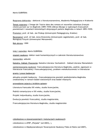 Maria GUBIŃSKA Rozprawa doktorska : doktorat z literaturoznawstwa, Akademia Pedagogiczna w Krakowie Temat rozprawy: L’image de l’Autre dans des romans et nouvelles coloniaux français choisis portant sur le Maghreb (1895-1939) (Obraz Obcego w wybranych francuskich powieściach i nowelach kolonialnych dotyczących państw Maghrebu w latach 1895-1939) Promotor: prof. dr hab. Jan Prokop (Uniwersytet Pedagogiczny, Kraków) Recenzenci: prof. dr hab. Anna Drzewicka (Uniwersytet Jagielloński), prof. dr hab. Remigiusz Forycki (Uniwersytet Warszawski) Rok obrony: 1999 imię i nazwisko: Maria GUBIŃSKA stopień naukowy: doktor nauk humanistycznych w zakresie literaturoznawstwa stanowisko: adiunkt Katedra, Zakład, Pracownia: Katedra Literatur Zachodnich – Zakład Literatur Romańskich zainteresowania naukowe: francuskojęzyczna literatura Maghrebu, podróż, egzotyzm w literaturze francuskiej i francuskojęzycznej, problem wielokulturowości w literaturze granty i prace badawcze: aktualny projekt badawczy - francuskojęzyczna powieść postkolonialna Maghrebu (realizowany w ramach badań statutowych oraz badań własnych) prowadzone zajęcia z krótkim opisem: Literatura francuska XIX wieku, studia licencjackie, Podróż romantyczna w XIX wieku, studia licencjackie, Projekt indywidualny, studia licencjackie, Ewolucja powieści francuskiej, studia magisterskie, Francuskojęzyczna literatura Maghrebu, studia magisterskie członkostwo w stowarzyszeniach i instytucjach naukowych: członkostwo w ATRP „Plejada” (od 2003), ), członkostwo w Międzynarodowym Towarzystwie Naukowy Fides et Ratio (od 2007), członkostwo w Komisji Neofilologicznej PAU (od 2008), członkostwo w SERD (Société des études romantiques et dix-neuvièmiste) (od 2012) udział w konferencjach naukowych krajowych i zagranicznych: 2014 Zawłaszczanie przestrzeni we francuskiej powieści kolonialnej (na przykładzie Louisa Bertranda i Isabelle Eberhardt), Pracownia Badań Komparatystycznych, Instytut Neofilologii UP w Krakowie, 06.06.2014 (sympozjum naukowe). 313-2013, Europa: z czego wyrasta i ku czemu zmierza, Wydział I Filologiczny PAU, Kraków, 25.10.2013. Referat: Islam – Europa, czy dialog głuchych? (konferencja krajowa). L’auteur, le personnage, le lecteur dans les lettres romanes, Instytut Filologii Romańskiej, UJ, Kraków, 21-22.10. 2012. Referat: Le monde féminin dans Ombre sultane d’Assia Djebar (konferencja międzynarodowa). Pensées orientale et occidentale : influences et complementarité, UJ, Kraków, 12-13.10.2011. Referat: La confrontation entre Orient et Occident dans quelques nouvelles choisies d’Isabelle Eberhardt (konferencja międzynarodowa). 2013. 2012. 2011. 2010 • Inférence, ellipse, parabole, Uniwersytet Pedagogiczny, Kraków, 7-10.06. 2010. Referat: Roman parabolique sur l’immigration féminine marocaine en France: Les yeux baissés de Tahar Ben Jelloun (konferencja miedzynarodowa). La condition humaine dans la littérature française et francophone, Uniwersytet Opolski, 12-14.05.2010. Referat: Albert Camus et l’Algérie : relecture de L’Étranger et de La Peste dans la perspective de l’exclusion collective dans un pays colonial, (konferencja miedzynarodowa) • 2009 VII Międzynarodowa Konferencja Naukowa: Wschód – Zachód. Dialog języków i kultur, Akademia Pomorska w Słupsku, 24-25.10.2009. Referat: Kultura arabsko-muzułmańska wobec cywilizacji Zachodu we współczesnej francuskojęzycznej literaturze Maghrebu. 2008 • Międzynarodowa Konferencja: Le sens et sa complexité, Uniwersytet Pedagogiczny, Kraków, Przegorzały, 5-7 czerwca 2008. Referat: Entre le signe et l’image; le choc des deux cultures dans La goutte d‘or de Michel Tournier • posiedzenie Komisji Neofilologicznej PAU, Kraków, 7 maja 2008. Referat: Uniwersalizm francuski a wielokulturowość francuskojęzycznej literatury Maghrebu. • Międzynarodowa Konferencja: L’art de séduire dans la littérature française, Uniwersytet Opolski, Kamień Śląski, 17-18 maja 2007. Referat: La séduction aux temps des colonies: Le Roman d’un spahi de Pierre Loti • Międzynarodowa Konferencja: Francophonie et interculturalité, UAM, Poznań, 17-18 października 2007. Referat: Assia Djebar et la question de la francophonie 2007 2006 • Międzynarodowa konferencja: Images, Symboles, Mythes et Poétique de l’Ascension/Envol., Instytut Filologii Romańskiej UJ, Kraków. Referat: L’envol „avorté” dans „René” de François–René de Chateaubriand. • Międzynarodowa Konferencja: L’Europe des Langues et des Cultures, Uniwersytet Pedagogiczny, Kraków, 23-25.06.2005. Referat: L’écriture française de Tahar Ben Jelloun comme exemple de la transgression de tous les tabous de la société marocaine (L’enfant de sable,Luit sacrée). • Międzynarodowa konferencja: In aqua scribis : l’eau dans la littérature, Instytut Filologii Romańskiej Uniwersytetu Gdańskiego, 21-23.04.2004. Referat: Le thème du hammam dans quelques textes de Tahar Ben Jelloun, Assia Djebar et Le Clézio. • Międzynarodowa Konferencja: La condition masculine dans la littérature française, Zakład Kultury i Języka Francuskiego Uniwersytetu Opolskiego, 13-14.04.2004. Referat: Figures masculines dans des nouvelles choisies d’Isabelle Eberhardt. • Międzynarodowa Konferencja: Dwie Francje, Instytut Francuski i Ojcowie Dominikanie, Kraków, 15.10.2004. Referat: Obecność islamu we Francji. • Międzynarodowa Konferencja: Français langue internationale; recherche et formation, Instytut Neofilologii Uniwersytetu Pedagogicznego w Krakowie, 10-11.12.2004. Referat: Écrire dans la langue de l’Autre; quelques réflexions sur la littérature maghrébine de langue française. • Międzynarodowa Konferencja: Imaginer le jardin, Instytut Filologii Romańskiej, Kraków, 12-13.06.2000. Referat: Le jardin, Arcadie gidienne dans ses écrits portant sur l’Afrique du Nord. • Międzynarodowa Konferencja: Paris en Fran