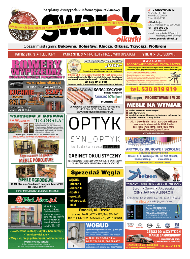 19 GRUDNIA 2013 Nr 24/2013 (183) Nakład: 20 000 szt. ISSN: 1896-1797 Redakcja: ul. K. K. Wielkiego 29, 32-300 Olkusz tel. 698 805 242 608 696 097 e-mail: [email protected] [email protected] www.gwarek-olkuski.pl Obszar miast i gmin: Bukowno, Bolesław, Klucze, Olkusz, Trzyciąż, Wolbrom PATRZ STR. 3 FELIETONY PATRZ STR. 3 PROTESTY PRZECIWKO OPŁATOM Przedsiębiorstwo Wielobranżowe „ŁUKA” dypl. mistrz kucharstwa - Łukasz Szlęzak Organizacja styp i imprez okolicznościowych Olkusz, ul. Powstańców Śląskich 40 /obok cmentarza/ koszt stypy od jednej osoby - 38 zł /w tym obiad, ciasto, napoje zimne i gorące/ www.gastronomia-wolbrom.pl www.system-olkusz.pl OLKUSZ, ul. Sławkowska 22 KUCHNIE NA WYMIAR SKLEP SZAFY Zapraszamy również do organizacji imprez w naszych lokalach w Wolbromiu SKLEP WODNO-KANALIZACYJNY Łukasz Knapczyk tel./fax 32 641 32 00 kom. 502 26 15 86 WSZYSTKO Z DREWNA "U GÓRALA" Producent wyrobów z drewna oferuje: • Boazerię świerkową: szer. 7 cm, 9 cm lub 15 cm • Podbitkę pod dachy • Bardzo duży asortyment listew wykończeniowych z lipy, świerka, buka, dębu i jesionu. Deski podłogowe, schody, poręcze, tralki, sztachety, więźby dachowe, meble oraz drzwi. Czynne: pon - piątek 9.00 - 17.15, sobota 9.00-13.00 U W A G A !!!!!!!! POGOTOWIE DOMOWE - ZŁOTA RĄCZKA Duża rozpiętość w działaniu, od mycia okien po nową aranżację mieszkań, domu, poprzez naprawy ślusarskie, wodno-kanalizacyjne PRZYKŁADOWE INNE DZIAŁANIA • Ścianki RG /gipsowe/ • podwieszane sufity • • Przywóz mebli własnym transportem zgodnie ze wskazaniem z katalogu następnie montaż w mieszkaniu, biurze • • Uzupełnianie uszkodzonych płytek podłogowych, ściennych • • Ponad 30 letnie doświadczenie w zakresie budownictwa • Oferta skierowana jest do klientów indywidualnych, przedsiębiorców prywatnych, firm państwowych. tel. 530 819 919 PROJEKTOWANIE W 3D Z DRZWIAMI SUWANYMI WSZYSTKO DO MEBLI czynne 9.00 - 17.00 U NAS NA JTANIEJ!!!! [email protected] ( 508 218 110 STR. 8 OKS SŁOWIKI ul. Główna, 32-329 Bolesław, tel. 728-820-552 Po - Pt 8.00 - 17.00, So 8.00 - 14.00 www.knapczyklukasz.bazarek.pl OPTYK MEBLE NA WYMIAR Al. 1000-lecia 15D, 32-300 Olkusz przy bramie wjazdowej do OFNE Emalia tel. 662 738 296, 601 432 908 [email protected] www.duodampex.pl MOŻLIWOŚĆ DOWOZU WŁASNYM TRANSPORTEM Zapraszamy na piętro MEBLE POKOJOWE GABINET OKULISTYCZNY rejestracja telefoniczna 500-200-941 ul. K. K. Wielkiego 60 (“SILVER” BUDYNEK DAWNEJ POLICJI PRZY POCZCIE) Sprzedaż Węgla MEBLE OGRODOWE 32-300 Olkusz, ul. Składowa 2, (budynek Dworca PKP) tel. (32) 754 60 10 [email protected], drzwi.olkusz24.pl ul. Nullo 2, 32-300 Olkusz na przeciwko postoju Taxi tel/fax: 32 211 03 27, kom. +48 519 409 079 [email protected] [email protected] pon - pt 9.00 ÷ 18.00, sobota 9.00 ÷ 13.00 • Nowoczesne Laptopy • Szybkie Komputery • • Tanie kasy fiskalne • • Wszystko, czego potrzebujesz do komputera • Profesjonalny serwis: Usługi związane z pełnym zakresem serwisu komputerów, laptopów oraz tabletów. WĘGIEL - orzech I - orzech II - kostka - groszek - ekogroszek - miał TELEFONY • KOMPUTERY • GPS • REJESTRATORY Salon • Serwis • Akcesoria CENY JAK NA ALLEGRO!!! Olkusz ul. Kościuszki 16, tel.: 502-815-535 ALLEGRO: aukcje_netcom Rodaki, ul. Rzeka czynne: Pn-Pt od 730 - 1600, Sob 800 - 1400 Tel: 514 617 132 , 505 576 273, 728 122 613 WOBUD Sprzedaż urządzeń sanitarnych i grzewczych Autoryzowany Przedstawiciel: De Dietrich, Vailant, Junkers, SAS, Imerges ul.Nullo 23, 32-300 Olkusz, tel.32 754 26 27, 602 589 437 Projektowanie i doradztwo techniczne w zakresie instalacji gazowych, CO i Wod-Kan. - Tel 507 108 026 Promocje: Telefon KRUGER&MATZ MOVE 4x 1.2 GHZ !!! - 439 zł PROMOCJA SPORTOWA SŁUCHAWKA BLUETOOTH STEREO NOKIA BH-505 - 99 zł 2 Informacje Powiatowy serwis informacyjny Wiedzieć, by unikać II powiatowy konkurs wiedzy o HIV i AIDS odbył się pod hasłem: „Gdy wiesz wszystko o wirusie, możesz przeciwstawić mu się”. 16 grudnia 2013 roku w Starostwie Powiatowym młodzież z gimnazjów Powiatu Olkuskiego sprawdzała swoją wiedzę w pisemnym teście. Konkurs odbywał się w ramach obchodów niedawnego Światowego Dnia AIDS. Światowy Dzień AIDS został ustanowiony w roku 1988 przez ONZ i obchodzony jest 1 grudnia. Co roku w grudniu odbywa się zatem kampania informacyjna, przypominająca o zagrożeniach związanych z zakażeniem AIDS, a także obalająca mity na temat tej choroby. Organizowane są wówczas pogadanki i konkursy. W sali konferencyjnej Starostwa, gdzie odbywał się konkurs, młodzież powitała Ewa Barzycka, dyrektorka Wydziału Polityki Społecznej i Promocji. Wydział ten, wraz z powiatowym Sanepidem, współorganizował konkurs. Następnie zabrała głos dr Agata Knapik, Państwowy Powiatowy Inspektor Sanitarny, dyrektorka Powiatowej Stacji Sanitarno-Epidemiologicznej w Olkuszu. Przypomniała, że choć sam fakt zakażenia HIV nie jest już równoznaczny z wyrokiem śmierci, jak było to ćwierć wieku temu, medycyna wciąż nie zna w pełni skutecznego lekarstwa ani szczepionki. Dlatego wciąż główną „bronią” w walce z AIDS pozostaje wiedza o sposobach przenoszenia wirusa i o tym, jak unikać zakażenia. Doktor Knapik przewodniczyła komisji czuwającej nad przebiegiem konkursu. Oprócz niej w skład jury weszły: dyrektorka Wydziału Polityki Społecznej i Promocji Ewa Barzycka, wicedyrektorka tegoż Wydziału Anna Curyło-Rzepka, nauczycielka z olkuskiego Gimnazjum nr 3 Danuta Piątkowska oraz Ewelina Bącek z Powiatowej Stacji Sanitarno-Epidemiologicznej w Olkuszu. Święta Bożego Narodzenia – szczególne dni radości, ciepła rodzinnego i wzajemnej bliskości. Niech atmosfera tych Świąt trwa przez cały nadchodzący rok 2014, aby najbliższe dwanaście miesięcy stało się czasem pokoju i stabilizacji. Życzymy wszystkim, aby najbliższe Święta mogli przeżywać uwolnieni od trosk i kło