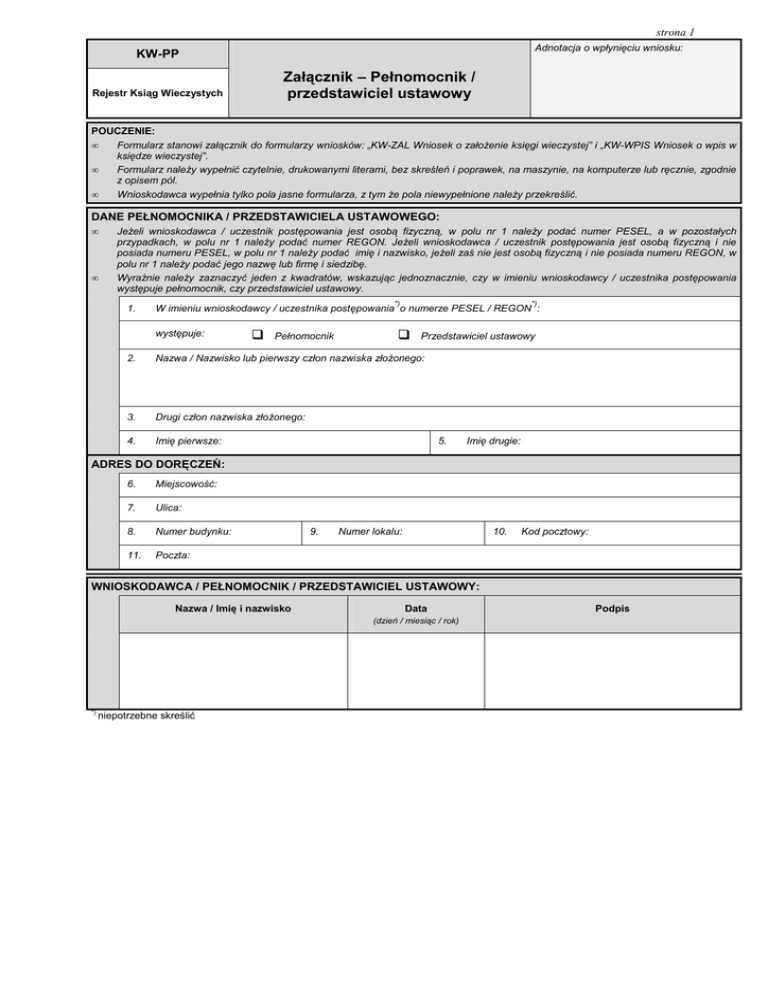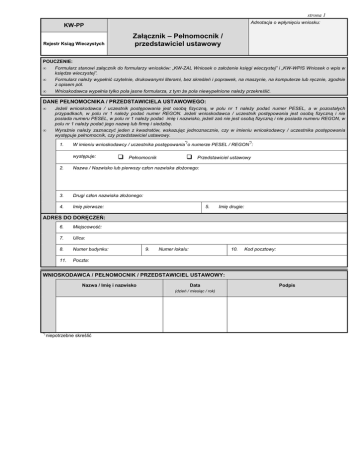 strona 1 Adnotacja o wpłynięciu wniosku: KW-PP Załącznik – Pełnomocnik / przedstawiciel ustawowy Rejestr Ksiąg Wieczystych POUCZENIE: • Formularz stanowi załącznik do formularzy wniosków: „KW-ZAL Wniosek o załoŜenie księgi wieczystej” i „KW-WPIS Wniosek o wpis w księdze wieczystej”. • Formularz naleŜy wypełnić czytelnie, drukowanymi literami, bez skreśleń i poprawek, na maszynie, na komputerze lub ręcznie, zgodnie z opisem pól. • Wnioskodawca wypełnia tylko pola jasne formularza, z tym Ŝe pola niewypełnione naleŜy przekreślić. DANE PEŁNOMOCNIKA / PRZEDSTAWICIELA USTAWOWEGO: • • JeŜeli wnioskodawca / uczestnik postępowania jest osobą fizyczną, w polu nr 1 naleŜy podać numer PESEL, a w pozostałych przypadkach, w polu nr 1 naleŜy podać numer REGON. JeŜeli wnioskodawca / uczestnik postępowania jest osobą fizyczną i nie posiada numeru PESEL, w polu nr 1 naleŜy podać imię i nazwisko, jeŜeli zaś nie jest osobą fizyczną i nie posiada numeru REGON, w polu nr 1 naleŜy podać jego nazwę lub firmę i siedzibę. Wyraźnie naleŜy zaznaczyć jeden z kwadratów, wskazując jednoznacznie, czy w imieniu wnioskodawcy / uczestnika postępowania występuje pełnomocnik, czy przedstawiciel ustawowy. 1. *) *) W imieniu wnioskodawcy / uczestnika postępowania o numerze PESEL / REGON : występuje: Pełnomocnik Przedstawiciel ustawowy 2. Nazwa / Nazwisko lub pierwszy człon nazwiska złoŜonego: 3. Drugi człon nazwiska złoŜonego: 4. Imię pierwsze: 5. Imię drugie: ADRES DO DORĘCZEŃ: 6. Miejscowość: 7. Ulica: 8. Numer budynku: 11. Poczta: 9. Numer lokalu: 10. Kod pocztowy: WNIOSKODAWCA / PEŁNOMOCNIK / PRZEDSTAWICIEL USTAWOWY: Nazwa / Imię i nazwisko Data (dzień / miesiąc / rok) *) niepotrzebne skreślić Podpis