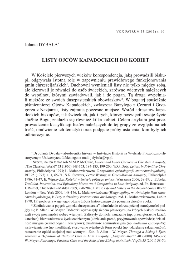 V O X PAT R U M 3 3 ( 2 0 1 3 ) t . 6 0 Jolanta DYBAŁA* LISTY OJCÓW KAPADOCKICH DO KOBIET W Kościele pierwszych wieków korespondencja, jaką prowadzili biskupi, odgrywała istotną rolę w zapewnieniu prawidłowego funkcjonowania gmin chrześcijańskich1. Duchowni wymieniali listy nie tylko między sobą, ale kierowali je również do osób świeckich, zarówno wiernych należących do wspólnot, którymi zawiadywali, jak i do pogan. Tą drogą wypełniali niektóre ze swoich duszpasterskich obowiązków2. W bogatej spuściźnie piśmienniczej Ojców Kapadockich, zwłaszcza Bazylego z Cezarei i Grzegorza z Nazjanzu, listy zajmują poczesne miejsce. Wśród adresatów kapadockich biskupów, tak świeckich, jak i tych, którzy poświęcili swoje życie służbie Bogu, znalazło się również kilka kobiet. Celem artykułu jest przeprowadzenie klasyfikacji listów należących do tej grupy ze względu na ich treść, omówienie ich tematyki oraz podjęcie próby ustalenia, kim były ich odbiorczynie. Dr Jolanta Dybała – absolwentka historii w Instytucie Historii na Wydziale Filozoficzno-Historycznym Uniwersytetu Łódzkiego; e-mail: [email protected]. 1 Szerzej na ten temat zob M.M.P. McGuire, Letters and Letter Carriers in Christian Antiquity, „The Classical World” 53 (1960) 148-153, 184-185, 199-200; W.G. Doty, Letters in Primitive Christianity, Philadelphia 1973; L. Małunowiczówna, Z zagadnień epistolografii starochrześcijańskiej, RH 25 (1977) z. 3, 65-71; S.K. Stowers, Letter Writing in Greco-Roman Antiquity, Philadelphia 1986, 41-47; E. Wipszycka, Kościół w świecie późnego antyku, Warszawa 2006, 38-39; J. Ebbeler, Tradition, Innovation, and Epistolary Mores, w: A Companion to Late Antiquity, ed. Ph. Rousseau – J. Raithel, Chichester – Malden 2009, 270-284; J. Muir, Life and Letters in the Ancient Greek World, London – New York 2009, 148-176. L. Małunowiczówna (Wstęp ogólny, w: Antologia listu starochrześcijańskiego, I: Listy z dziedziny kierownictwa duchowego, red. L. Małunowiczówna, Lublin 1978, 15) podkreśla wagę tego rodzaju źródła historycznego dla poznania dziejów epoki. 2 Zdefiniowania pojęcia „opieka duszpasterska” odnośnie do okresu późnej starożytności podjęły się P. Allen i W. Mayer. Badaczki wyznaczyły siedem płaszczyzn, na których biskupi realizowali swoje powinności wobec wiernych. Zaliczyły do nich: nauczanie (np. przez głoszenie kazań, katechez); kierownictwo w życiu codziennym (udzielanie porad, przyjmowanie spowiedzi); działalność misyjna (wśród pogan i heretyków); działalność administracyjna (np. audientia episcopalis); wstawiennictwo (np. modlitwą); stosowanie rytualnych form opieki (np. udzielanie sakramentów); roztaczanie opieki socjalnej nad wiernymi. Zob. P. Allen – W. Mayer, Through a Bishop’s Eyes. Towards a Definition of Pastoral Care in Late Antiquity, „Augustinianum” 40 (2000) 345-397; W. Mayer, Patronage, Pastoral Care and the Role of the Bishop at Antioch, VigCh 55 (2001) 58-70. * 124 JOLANTA DYBAŁA 1. Spuścizna epistolograficzna Ojców Kapadockich. Korespondencja Bazylego liczy ponad 3603 listów niezwykle różnorodnej treści4. Można je podzielić na listy interwencyjne, protekcyjne, konsolacyjne, kierownicze, pasterskie, kanoniczne i dogmatyczne. Pisma te wykazują duże zróżnicowanie także pod względem formy, gdyż obok listów przeciętnej długości spotykamy wśród nich zarówno lakoniczne bilety, jak i obszerne, systematyczne wypowiedzi. Styl literacki tego fragmentu spuścizny biskupa Cezarei dowodzi retorycznego wykształcenia autora, który, stosując się do zaleceń współczesnej mu teorii epistolograficznej, potrafił zachować naturalność5. Listy Bazylego pozwalają ich czytelnikowi dość dobrze poznać samego duchownego, gdyż – jak zauważa Włodzimierz Krzyżaniak – stanowią one „swoisty «dziennik» jego przeżyć, przejść, inicjatyw, osiągnięć i niepowodzeń, dzięki swemu autobiograficznemu charakterowi ukazują nam Bazylego w samym nurcie życia ówczesnego Kościoła”6. Grzegorz z Nazjanzu pozostawił po sobie listy dydaktyczne, konsolacyjne, pochwalne, gratulacyjne i polecające7. Łącznie kolekcja ta zawiera 245 pozycji. To sam biskup, pod koniec życia, na prośbę Nikobula, męża swojej siostrzenicy, wybrał i przygotował je do wydania, wzorując się na dawnej 3 W niniejszym artykule posługuję się czterotomowym wydaniem lisów Bazylego, które ukazało się w ramach serii The Loeb Classical Library: Saint Basil, The Letters, t. I-IV, with an English Translation by R.J. Deferrari, Cambridge – London 1950-1961. 4 W odpisach dotrwało do naszych czasów 366 listów Bazylego. Wiele z nich budzi jednak wątpliwości co do swojej autentyczności, niektóre są cudzego autorstwa, inne zaś to oczywiste pseudoepigrafy. Por. W. Krzyżaniak, Wstęp, w: Bazyli Wielki, Listy, tłum. W. Krzyżaniak, Warszawa 1972, 12. Omówienie korespondencji Bazylego z Cezarei w: R.J. Deferrari, Introduction, w: Saint Basil, The Letters, I, tłum. R.J. Deferrari, Cambridge – London 1950, XXXVI-XXXVIII; L. Małunowiczówna, Konsolacyjne listy św. Bazylego Wielkiego, RH 24 (1976) z. 3, 61-63; taż, Wstęp ogólny, s. 27-28; J. Gribomont, Notes biographiques sur s. Basile le Grand, w: Basil of Caesarea. Christian, Humanist, Ascetic. A Sixteen-Hundredth Anniversary Symposium, I, ed. P.J. Fedwick, Toronto 1981, 24-27; W.D. Hauschild, Einleitung, w: Basilius von Caesarea, Briefe, I, tłum. W.D. Hauschild, Stuttgart 1990, 1-31; F. Hooper – M. Schwartz, Roman Letters. History from a Personal Point of View, Detroit 1991, 148-157; J.R. Pouchet, Les 366 lettres de saint Basile. Son milieu et ses activités, StPatr. 27 (1993) 100-104; J.R. Pouchet, Basile de Cesarée, éducateur de la foi et promoteur de la charité d’après sa correspondance, RHE 102 (2007) nr 1, 7-11. 5 Por. Małunowiczówna, Wstęp ogólny, s. 27-28. 6 Krzyżaniak, Wstęp, s. 