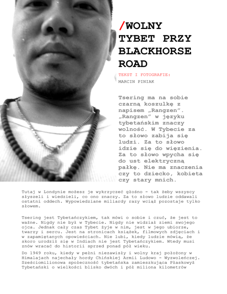 /WOLNY TYBET PRZY BLACKHORSE ROAD TEKST I FOTOGRAFIE: MARCIN PINIAK Tsering ma na sobie czarną koszulkę z napisem „Rangzen”. „Rangzen” w języku tybetańskim znaczy wolność. W Tybecie za to słowo zabija się ludzi. Za to słowo idzie się do więzienia. Za to słowo wpycha się do ust elektryczną pałkę. Nie ma znaczenia czy to dziecko, kobieta czy stary mnich. Tutaj w Londynie możesz je wykrzyczeć głośno - tak żeby wszyscy słyszeli i wiedzieli, co ono znaczy. Za to słowo ludzie oddawali ostatni oddech. Wypowiedziane miliardy razy wciąż pozostaje tylko słowem. Tsering jest Tybetańczykiem, tak mówi o sobie i czuć, że jest to ważne. Nigdy nie był w Tybecie. Nigdy nie widział ziemi swojego ojca. Jednak cały czas Tybet żyje w nim, jest w jego ubiorze, twarzy i sercu. Jest na stronicach książek, filmowych zdjęciach i w zapamiętanych opowieściach. Nie lubi, kiedy ludzie mówią, że skoro urodził się w Indiach nie jest Tybetańczykiem. Wtedy musi znów wracać do historii sprzed ponad pół wieku. Do 1949 roku, kiedy w pełni niezawisły i wolny kraj położony w Himalajach najechały hordy Chińskiej Armii Ludowo - Wyzwoleńczej. Sześciomilionowa społeczność tybetańska zamieszkująca Płaskowyż Tybetański o wielkości blisko dwóch i pół miliona kilometrów kwadratowych stała się więźniami we własnym kraju. Tak jest do dnia dzisiejszego. Pozostałość po historycznym Tybecie chińskie władze nazwały „Tybetański Region Autonomiczny”, przy czym słowo „autonomiczny” jest zaprzeczeniem swojego pierwotnego znaczenia. Na skutek chińskiej inwazji śmierć poniosło ponad milion dwieście Tybetańczyków Mały Tybet Tsering wraz z Kalsangiem i Karmą mieszkają w domu w pobliżu stacji Blackhorse Road. To jest ich Wolny Tybet. O tym informuje wlepka na kuchennych drzwiach z napisem „Free Tibet” unoszący się w powietrzu zapach chili i sami jego lokatorzy. Od czasu do czasu przychodzi Dawa -postać niedużego wzrostu, bardzo ruchliwa w wieku lat dwudziestu kilku. Oczywiście Tybetańczyk. Jest Lamą (dosł. Matka, co znaczy Nauczyciel) i mnichem. Prowadzi buddyjski ośrodek „Palyul” na ulicy Rotherfield. Kocha futbol i zieloną herbatę. Widok tego drobnego Lamy żonglującego piłką, innym razem tańczącego w rytm tybetańskiego hitu „Let’s go to disco” czy dmącego w aborygeński instrument zwany didgeridoo, bardzo odstaje od wyobrażeń, jakie można mieć na temat buddyjskich mnichów. Ma w sobie tyle spontaniczności i otwartości, że wręcz zaraża wszystkich wokół optymizmem. Karma dla odmiany jest cichy, introwertyczny i raczej nieśmiały. Piłka nożna to jego życie. Potrafi ją kopać godzinami, lub oglądać w telewizji. Nawet jadąc na rowerze słucha meczu z radia umocowanego w koszyku przy kierownicy. Uwielbia indyjskie filmy. W Indiach godzinami siedział w kinie. Tutaj no cóż, raczej mu się nie podoba. Trzeba dużo pracować, na nic nie ma czasu, ludzie wiecznie w pędzie. To nie dla niego. Tęskni do dusznej małej sali kinowej i bohaterów swoich ukochanych filmów. Do zapachów indyjskiej kuchni na ulicy i bliskich ludzi. Jesteśmy uchodźcami Tsering nazywa siebie „uchodźcą” pomimo faktu, że posiada obywatelstwo indyjskie. Fale uchodźców tybetańskich zapoczątkował sam Dalajlama, który jest przywódcą duchowym i politycznym wszystkich Tybetańczyków. Podczas powstania w 1959 roku opuścił Lhasę (stolicę Tybetu) i przez Himalaje przedostał się do Indii. Tym samym wyznaczył drogę setkom tysięcy Tybetańczyków, którzy w ten sam sposób uciekają z kraju przed prześladowaniami, więzieniem i chińską polityką terroru. Wielu z nich umiera po drodze, innych zawracają przekupywani przez Chiny żołnierze na granicy Nepalu, Bhutanu, lub samych Indii. Powrót do Tybetu z wizytówką uciekiniera równa się torturom, więzieniu czy nawet śmierci. Tsering pochodzi z Dharmasali, gdzie ma swoją siedzibę Tybetański Rząd na Uchodźstwie. Na co dzień pracuje w jednym z podległych Dalajlamie departamentów,a jego praca polega na organizacji bojkotu chińskiej Olimpiady „Pekin 2008″. Jest aktywistą. Jest zdecydowanie typem ognistym z dużym temperamentem i ciekawością świata. Londyn to nie jest jego miejsce, kocha swoją Dharmasalę, jej specyficzny luz, brak pośpiechu i bałagan. Lubi jej wartkie strumyki małych rzek i wzgórza nieopodal domu. Tam ma swoich przyjaciół i rodziców. Najważniejszą kobietą w jego życiu jest matka. Dla Tybetańczyków więzi rodzinne to jeden z ważniejszych związków w życiu. Mają ogromny szacunek do rodziny. To jest ich żywe połączenie z ojczyzną. Rodzina i religia. Buddyzm tybetański - jeden z najbardziej zaawansowanych systemów rozwoju świadomości - jest praktykowany w nieskrępowany sposób na całym świecie. Jednak w Tybecie komuniści sprowadzili go do obrzędowej atrakcji dla turystów. W swej esencji jest on żywym doświadczeniem przekazywanym przez pokolenia mistrzów swym uczniom. Strumień nauk jest nieprzerwany do dziś. Głównie w Indiach i na zachodzie, gdzie żyją i nauczają tybetańscy mistrzowie. Przez setki lat na himalajskim „dachu świata” praktykowano i rozwijano nauki Buddy wtłaczając je w życie codzienne, politykę, sztukę i edukację. Rozdzielić Tybetu i buddyzmu nie sposób. Jedynie rozerwać jak chińscy agresorzy. Podczas swojego „panowania” zniszczyli większość klasztorów, świątyń i świętych miejsc ( z blisko sześciu tysięcy klasztorów zostało kilka najczęściej zniszczonych) - między innymi robiono z nich chlewy i stajnie. Świętymi tekstami nawożono ziemię, a mnichów mniszki zmuszano do uprawiania publicznego seksu. Częściami relikwii, posążków i stup (rodzaj „piramidy” symbolizującej oświecenie o różnych wielkościach i wymiarach) brukowano nowo powstające drogi. Samo posiadanie zdjęcia Dalajlamy karane było więzieniem. Tsering ma 