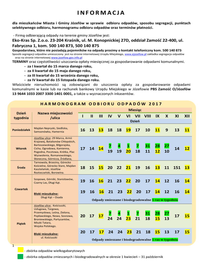 INFORMACJA dla mieszkańców Miasta i Gminy Józefów w sprawie odbioru odpadów, sposobu segregacji, punktach selektywnego odbioru, harmonogramu odbioru odpadów oraz terminów płatności. - Firmą odbierającą odpady na terenie gminy Józefów jest: Eko-Kras Sp. Z.o.o. 23-204 Kraśnik, ul. M. Konopnickiej 27D, oddział Zamość 22-400, ul. Fabryczna 1, kom. 500 140 873, 500 140 875 Gospodarstwa, które nie posiadają pojemników na odpady prosimy o kontakt telefoniczny kom. 500 140 873Sposób segregacji odpadów umieszczony jest na stronie internetowej Urzędu Miejskiego, www.ejozefow.pl zakładka segregacja odpadów oraz na stronie internetowej www.jozefow.gov.info.pl TERMINY oraz częstotliwości uiszczania opłaty miesięcznej za gospodarowanie odpadami komunalnymi. - za I kwartał do 15 marca danego roku, - za II kwartał do 15 maja danego roku, - za III kwartał do 15 września danego roku, - za IV kwartał do 15 listopada danego roku. Właściciele nieruchomości są zobowiązani do uiszczenia opłaty za gospodarowanie odpadami komunalnymi w kasie lub na rachunek bankowy Urzędu Miejskiego w Józefowie PBS Zamość O/Józefów 13 9644 1033 2007 3300 1401 0001, a także u wyznaczonych inkasentów. HARMONOGRAM ODBIORU ODPADÓW 2017 Dzień tygodnia Poniedziałek Wtorek Środa Nazwa miejscowości /ulica Majdan Nepryski, Siedliska, Samsonówka, Hamernia Miesiąc I III IV V VI VII VIII IX X XI XII Dzień 16 13 13 18 18 19 17 10 11 9 13 11 7 4 1 7 19 19 20 18 31 11 28 27 12 10 14 12 18 15 15 20 22 21 19 16 13 11 151 13 Szopowe, Górniki, Stanisławów, Czarny Las, Długi Kąt. 19 16 16 21 23 22 20 17 14 12 16 14 Bloki mieszkalne: 19 16 16 21 23 22 20 17 14 12 16 14 Józefów ulice: 29 Marca, Armii Krajowej, Batalionów Chłopskich, Bartoszewskiego, Biłgorajska, Cicha, Ogrodowa, Kamienna, Pogodna, Pocztowa, Krótka, Plac Wyzwolenia, Romanowskiego, Słoneczna, Górnicza, Źródlana, Tarnowola, Brzeziny, Górecko Kościelne, Górecko Stare, Majdan Kasztelański, Józefów Roztoczański, Borowina. Czwartek 17 14 14 Długi Kąt – Osada Piątek II Józefów ulice: Kościuszki, Usługowa, Targowa, Przemysłowa, Leśna, Zielona, Popławskiego, Nowa, Sosnowa, Broniewskiego, Partyzantów, Miszki Tatara, Wojska Polskiego. Bloki mieszkalne: Odpady zmieszane i biodegradowalne 1 raz w tygodniu 28 27 15 13 17 15 20 17 17 24 24 23 21 18 15 13 17 15 20 17 17 ul. Kościuszki 7 4 1 7 24 24 23 21 31 18 Odpady zmieszane i biodegradowalne 1 raz w tygodniu 1 - zbiórka odpadów wielkogabarytowych - zbiórka odpadów zmieszanych i biodegradowalnych w okresie 1 kwiecień – 31 październik Zgodnie z art. 6r ust 3-3d ustawy z 13 września 1996 r. o utrzymaniu czystości i porządku w gminach (Dz. U. z 2013 r. poz. 1399 ze zm.) oraz Uchwałą Rady Miejskiej w Józefowie Nr VIII/43/15 z dnia 30 czerwca 2015 r. w sprawie określenia szczegółowego sposobu i zakresu świadczenia usług w zakresie odbierania odpadów komunalnych od właścicieli nieruchomości i zagospodarowania tych odpadów, ustala się terminarz odbioru odpadów na rok 201712345 .: 1.) w okresie od 1 listopada do 31 marca dla mieszkańców całej gminy raz w miesiącu 2.) w okresie od 1 kwietnia do 31 października zbiórka odpadów ulegających biodegradacji: a. raz na tydzień od mieszkańców zamieszkałych w mieszkaniach wielolokalowych—bloki mieszkalne w Józefowie, bloki mieszkalne w Długim Kącie. b. raz na dwa tygodnie od mieszkańców zamieszkałych w budynkach jednorodzinnych w obrębie miejscowości Józefów c. raz w miesiącu od mieszkańców zamieszkałych w budynkach jednorodzinnych w pozostałych miejscowościach gminy. Zbiórka odpadów wielkogabarytowych odbędzie się w miesiącach: marzec, czerwiec, wrzesień, grudzień w dniach wywozu odpadów, zgodnie z harmonogramem Zbiórką są objęte: Radia, telewizory, inny sprzęt elektryczny i elektryczny Lodówki, zamrażarki, pralki, wirówki, zlewozmywaki, wanny, kuchenki gazowe, , inny sprzęt AGD, Meble, tapczany, dywany, wykładziny, materace, itp. UWAGA! Sprzęt AGD-RTV i elektroniczny może być odebrany tylko kompletny. MAKULATURA (worek niebieski): - gazety, zeszyty, książki w miękkich okładkach lub po usunięciu twardych, - katalogi , ulotki i prospekty, - tekturę, kartony, - worki papierowe, opakowania papierowe, - ścinki drukarskie. SZKŁO (worek zielony): - butelki po piwie oraz innych napojach, - butelki po sokach i napojach gazowanych, - słoiki po innych artykułach spożywczych. UWAGA: Butelki i słoiki wrzucamy do worka (pojemnika) ostrożnie. Im mniej się stłucze tym większą wartość będzie miał zebrany surowiec. Opakowania można myć lub nie. Przed wrzucaniem do worka (pojemnika), należy usunąć większe pozostałości żywności (np. wybrać łyżeczką, wylać płyny). METAL (worek czerwony): - drobny złom żelazny oraz drobny złom metali kolorowych, opakowania z aluminium (np. puszki po piwie, narzędzia, druty, nakrętki po słoikach), opakowania po dezodorantach, lakierach do włosów itp. - puszki po napojach i konserwach. BIODEGRADOWALNE (worek czarny): - odpady ulegające biodegradacji – tj. odpady które ulegają rozkładowi tlenowemu lub beztlenowemu przy udziale mikroorganizmów, - odpady zielone- tj. odpady stanowiące część roślin, odpady komunalne pochodzące z pielęgnacji terenów zieleni oraz targowisk, z wyjątkiem odpadów pochodzących z czyszczenia ulic i placów. - odpady ulegające biodegradacji w strumieniu zmieszanych odpadów komunalnych, w tym odpady kuchenne, oleje i tłuszcze jadalne. TWORZYWA SZTUCZNE (worek żółty): - puste, nie zakręcone butelki plastikowe po różnych napojach ( typu PET, PE), - puste, nie zakręcone butelki plastikowe po kosmetykach i środkach czystości – tzn. chemię gospodarczą, (opakowania po szamponach, płynach itp.), - czystą folię i torebki z tworzyw sztucznych, - czyste kanistry plastikowe, plastikowe skrzynki, doniczki, wiadra, - opakowania plastikowe po margary