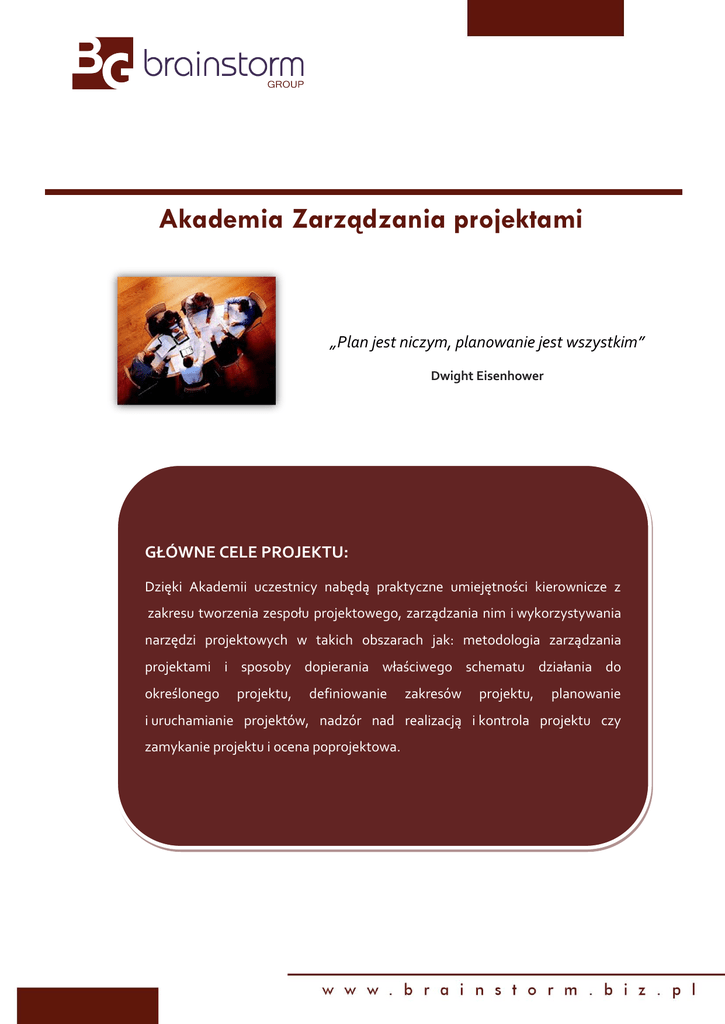 Akademia Zarządzania projektami „Plan jest niczym, planowanie jest wszystkim” Dwight Eisenhower GŁÓWNE CELE PROJEKTU: Dzięki Akademii uczestnicy nabędą praktyczne umiejętności kierownicze z zakresu tworzenia zespołu projektowego, zarządzania nim i wykorzystywania narzędzi projektowych w takich obszarach jak: metodologia zarządzania projektami i sposoby dopierania właściwego schematu działania do określonego projektu, definiowanie zakresów projektu, planowanie i uruchamianie projektów, nadzór nad realizacją i kontrola projektu czy zamykanie projektu i ocena poprojektowa. Dzięki Akademii, realizowanej według przedstawionego poniżej programu, uczestnicy nabędą kompetencje na trzech poziomach: Poziom Wiedzy: Uczestnik: Pozna założenia i metodologię skutecznego prowadzenia projektu. Pozna ścieżki wsparcia dla projektu, metody zarządzania informacjami w projekcie, komunikacji i sposoby budowania atmosfery sprzyjającej jego realizacji. Dowie się jak budować zespół projektowy oraz w jaki sposób efektywnie rozdzielać zadania. Nabędzie wiedzę o tym jak zarządzać, monitorować i kontrolować procesy w projekcie. Zrozumie ideę tworzenia wykresów sieciowych, Gantta i Ishikawy. Nabędzie wiedzę odnośnie metod zamknięcia projektu i przeprowadzenia oceny po-projektowej. Poziom Postawy: Uczestnik: Zdobędzie umiejętności planowania projektu, organizowania zadań przy realizacji i ewaluacji projektów, tworzenia modelu projektowego dostosowanego do realnych potrzeb. Nabędzie umiejętność definiowania zakresów projektów. Będzie potrafił wykorzystywać cykle projektowania w planowaniu projektów i w zarządzaniu nimi. Nauczy się tworzyć wykres sieciowy i wykres Gantta. Będzie potrafił interpretować i tworzyć wykres Ishikawy. Nabędzie umiejętność efektywnego zarządzania projektem oraz monitorowania i kontrolowania projektu na każdym jego etapie. Poziom Postawy: Uczestnik: Uświadomi sobie zalety pracy projektowej i znaczenia realizacji projektu w oparciu o procedury i dokumentacje projektową. Będzie świadomy, jak ważna jest sprawna komunikacja w zespole projektowym w trakcie przygotowania i realizacji projektu. Stanie się bardziej pewny siebie w podejmowaniu ważnych dla projektu decyzji. PROGRAM PROJEKTU – 10 DNI MODUŁ 1. DOBÓR KADRY DO PROJEKTU 8 h – 1 DZIEŃ TRENER: IRENEUSZ WOLSKI 2. ZARZĄDZANIE ZESPOŁEM PROJEKTOWYM 16h – 2 DNI OPIS Krótki zarys historii zarządzania projektami. Główne metodologie Prince 2 i PMI – podobieństwa i różnice. Zarządzanie zasobami wg PMI Opracowanie planu zasobów ludzkich Pozyskiwanie zespołu projektowego Analiza stanowiska pracy. Analiza umiejętności. Analiza kompetencji. Rekrutacja zewnętrzna – etapy. Rozmowa rekrutacyjna. Typologia ról w zespole. Spotkanie ze sponsorem projektu. Ustalenie celów. Strategia komunikacyjna w projekcie. Pierwsze spotkanie z zespołem projektowym. Diagnoza zespołu projektowego i jego dojrzałości do realizacji zadań. Skuteczna komunikacja w zespole projektowym. Motywowanie członków zespołu projektowego. Delegowanie zadań w projekcie. Konstruktywne rozwiązywanie konfliktów w zespole projektowym. Rozmowa kontrolująca – informacja zwrotna. Projekt a proces. Cykl życia projektu. Kartka projektu. Cele projektu. Cele projektu a produkty projektu. Trójkąt ograniczeń. Planowanie projektu. Tworzenie WBS. Plan komunikacji. Opracowanie harmonogramu. Metody harmonogramowania. Diagram sieciowy. Kamienie Milowe. Weryfikacja. Kontrolowanie harmonogramu. TRENER: SEBASTIAN MATYNIAK 3. CELE PROJEKTU I PLANOWANIE PROJEKTU 16h – 2 DNI TRENER: JACEK CYMERMAN 4. HARMONOGRAMOWANIE PROJEKTU 16h – 2 DNI TRENER: WOJCIECH JARUGA 5. WYZNACZANIE ŚCIEŻKI KRYTYCZNEJ 8 h – 1 DZIEŃ TRENER: ŁUKASZ ROMPEL 6. SZACOWANIE RYZYKA W PROJEKCIE 8 h – 1 DZIEŃ TRENER: ŁUKASZ ROMPEL 7. BUDŻETOWANIE PROJEKTU 8 h – 1 DZIEŃ TRENER: SEBASTIAN WIDUCH Co to jest Ścieżka Krytyczna? Metoda wczesny start-koniec. Metoda późny start-koniec. Ścieżka krytyczna – wady i zalety. Jak wyznaczyć Ścieżkę Krytyczną? Ryzyka na Ścieżce Krytycznej. Planowanie zarządzania ryzykiem. Rozpoznawanie ryzyka. Analiza jakościowa ryzyka. Analiza ilościowa ryzyka. Planowanie reakcji na ryzyka. Monitorowanie i kontrolowanie ryzyka. Określenie działań. Budowanie planu kosztów Metody prognozowania wielkości budżetu. Rezerwy w budżecie. Planowanie płatności w projekcie Metody kontrolowania budżetu. Nakłady inwestycyjne i koszty eksploatacyjne. Weryfikacja rentowności projektu. Ryzyko związane z otoczeniem projektu. Ryzyko związane z planowaniem kosztów i płatności. Kiedy zwiększa się ryzyko finansowe w projekcie? Metodologia wykrywania ryzyka finansowego w projekcie. Analiza wrażliwości.