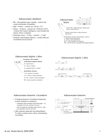 Adresowanie obiektów • Bit - stan pojedynczego sygnału - wejście lub wyjście dyskretne, bit pamięci • Bajt - 8 bitów - wartość od -128 do +127 • Słowo - 16 bitów - wartość od -32768 do 32767 -wejście lub wyjście analogowe, stan licznika lub timera, słowo w pamięci • Podwójne słowo - 32 bity - wartość +- 2 mld • Wartości zmiennoprzecinkowe - wyniki obliczeń na liczbach rzeczywistych 1 Adresowanie bajtów i słów I3.4 Numer bitu w bajcie (liczony od prawej do lewej) - cyfra od 0 do 7 Kolejny numer bajtu w danym obszarze adresowym Identyfikator obszaru. NajwaŜniejsze z nich to: I - obszar wejść dyskretnych Q - obszar wyjść dyskretnych M, V - obszar pamięci wewnętrznej 2 SM - obszar rejestrów specjalnych (konfiguracyjnych) Adresowanie bajtów i słów Początkowy adres obiektu V B 100 Adresowanie bitów Identyfikator długości obiektu: B - bajt (8 bitów) W - słowo ( 2 bajty) D - podwójne słowo ( 4 bajty) Identyfikator obszaru: V, M - pamięć wewnętrzna I, Q - wejścia i wyjścia dyskretne AI, AQ - wejścia i wyjścia analogowe SM - obszar rejestrów specjalnych 3 Adresowanie timerów i liczników 4 Adresowanie timerów • Z kaŜdym timerem i licznikiem skojarzone są dwie zmienne wewnętrzne: – wskaźnik stanu (zmienna typu bitowego) - czy nastąpiło zliczenie zadanej wartości – stan wewnętrzny (zmienna typu słowo) - jaka jest aktualna wartość zliczona • Obie zmienne mają taki sam identyfikator. To, która zostanie uŜyta zaleŜy od kontekstu wywołania 5 dr inŜ. Stefan Brock 2008/2009 6 1 Cykl pracy sterownika Adresowanie liczników Odczyt wejść Zapis wyjść Autodiagnostyka 7 Cykl pracy sterownika 0.5 - 50 ms Wykonanie programu Zadania komunikacyjne 8 Zjawisko hazardu w układach cyfrowych Wejścia fizyczne Hazard - na skutek nieidealności urządzeń technicznych. Przykład - Ŝarówka nie powinna zgasnąć, na wyjściu bramki powinno być zawsze 1 Obraz wejść Program uŜytkownika Obraz wyjść Wyjścia fizyczne 9 Synchroniczny cykl pracy eliminuje hazard Szybkość powtarzania cyklu • Praca cykliczna - kolejne szybkie tak szybko, jak to moŜliwe • Praca izochroniczna - w równych, określonych przez programistę odstępach 11 dr inŜ. Stefan Brock 2008/2009 10 12 2 Instrukcje sterujące działaniem programu Odczyt wejść i zapis wyjść • Odczyt wejść binarnych - do mapy pamięci • Zapis wyjść binarnych - z mapy pamięci • Wyjątki: – wejścia/wyjścia analogowe – wejścia/wyjścia natychmiastowe (ryzyko hazardu) • Instrukcje sterujące pracą sterownika • Instrukcja skoku - omijanie fragmentów programu • Instrukcja procedury - wielokrotne uŜycie fragmentów programu • Instrukcja pętli FOR • Instrukcje przerwań - bezzwłoczna reakcja na zdarzenia 13 Instrukcje sterujące praca sterownika - watchdog • Watchdog - licznik sprzętowy zabezpieczający poprawną pracę sterownika • Gdy cykl pracy nie zakończy się w zadanym czasie (300 ms dla S7-200) - następuje restart systemu • Programista ma moŜliwość przedłuŜenia okresu wyznaczonego przez watchdog 14 Instrukcje sterujące praca sterownika - End • Cewka (End) kończy analizę bieŜącego cyklu sterownika • Powinna być zapisana na końcu programu postać bezwarunkowa • MoŜna uŜywać w programie wcześniej, dla zaniechania dalszych obliczeń - postać warunkowa Gdy jest załączone wejście I0.0 Programowy reset watchdoga to zakończ bieŜący cykl 15 Instrukcje sterujące praca sterownika - Stop • Zakończenie wykonywania pogramu i przejście w tryb Stop • Wyjścia przechodzą w stan domyślny • Wymagana interwencja operatora ponowne uruchomienie programu dr inŜ. Stefan Brock 2008/2009 Instrukcja skoku • UmoŜliwia ominięcie fragmentu programu • MoŜliwy tylko skok „do przodu” - nie tworzy pętli Gdy wskaźnik awarii modułu wejścia/wyjścia To przerwij pracę sterownika 16 Identyfikator 0..255 Instrukcja: skok do miejsca oznaczonego etykietą nr n Etykieta nr n 17 18 3 Instrukcja procedury Instrukcja skoku - przykład Gdy nastąpiło utracenie danych zapisanych w pamięci w trakcie wyłączenia zasilania (sygnalizowane specjalnym bitem SM0.2) Skok do etykiet nr 4 • Gdy pewien fragment programu wykonywany jest wielokrotnie -moŜna go zapisać w postaci odpowiednio wywoływanej procedury - krótszy program • Gdy pewien fragment programu wykonywany jest incydentalnie - moŜna go zapisać w postaci jednorazowo wywoływanej procedury program bardziej przejrzysty Etykieta nr 4 19 Instrukcje pętli iteracyjnej FOR Instrukcja procedury - przykład Program główny 20 Gdy jest to pierwszy cykl pracy po restarcie systemu (co jest sygnalizowane bitem SM0.1) blok organizacji pętli Wywołanie procedury nr 10 Początek treści programu procedury gdy ustawiony bit M14.3 to powrót do programu głównego 21 22 Źródła zdarzeń przerwań w S7-214 Instrukcje przerwań • Przerwanie - sposób obsługi zdarzeń zewnętrznych, w dowolnym momencie cyklu pracy sterownika • Procedura obsługi przerwania powinna być krótka, aby nie zakłócać normalnejpracy sterownika • Po obsłuŜeniu przerwania następuje powrót do normalnej pracy 23 dr inŜ. Stefan Brock 2008/2009 wskaźnik końca pętli • Zmiana stanu wybranych wejść dyskretnych - I0.0 ... I0.3 • Łącze szeregowe - odebranie nowego znaku lub zakończenie wysyłania • Wewnętrzne sygnały upływu czasu programowane od 5 do 255 ms • Zliczenie zadanej liczby przez szybkie liczniki 24 4 Instrukcje obsługi przerwań Obsługa przerwań Powrót z przerwania Zgoda na wykonanie • Obsługa wszystkich przerwań moŜe być globalnie blokowana (stan domyślny) lub wznawiana • KaŜde ze zdarzeń moŜe być indywidualnie blokowane • KaŜde ze zdarzeń moŜe być dynamicznie przypisywane do odpowiednich procedur obsługi Skojarz zdarzenie z procedurą obsługi przerwania Zerwij skojarzenie: moŜna do tej samego zdarzenia dołaczyć inną procedurę, a do zw