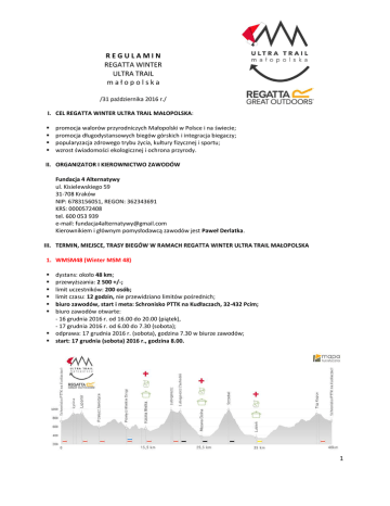 REGULAMIN REGATTA WINTER ULTRA TRAIL małopolska /31 października 2016 r./ I. CEL REGATTA WINTER ULTRA TRAIL MAŁOPOLSKA: promocja walorów przyrodniczych Małopolski w Polsce i na świecie; promocja długodystansowych biegów górskich i integracja biegaczy; popularyzacja zdrowego trybu życia, kultury fizycznej i sportu; wzrost świadomości ekologicznej i ochrona przyrody. II. ORGANIZATOR I KIEROWNICTWO ZAWODÓW Fundacja 4 Alternatywy ul. Kisielewskiego 59 31-708 Kraków NIP: 6783156051, REGON: 362343691 KRS: 0000572408 tel. 600 053 939 e-mail: [email protected] Kierownikiem i głównym pomysłodawcą zawodów jest Paweł Derlatka. III. TERMIN, MIEJSCE, TRASY BIEGÓW W RAMACH REGATTA WINTER ULTRA TRAIL MAŁOPOLSKA 1. WMSM48 (Winter MSM 48) dystans: około 48 km; przewyższania: 2 500 +/-; limit uczestników: 200 osób; limit czasu: 12 godzin, nie przewidziano limitów pośrednich; biuro zawodów, start i meta: Schronisko PTTK na Kudłaczach, 32-432 Pcim; biuro zawodów otwarte: - 16 grudnia 2016 r. od 16.00 do 20.00 (piątek), - 17 grudnia 2016 r. od 6.00 do 7.30 (sobota); odprawa: 17 grudnia 2016 r. (sobota), godzina 7.30 w biurze zawodów; start: 17 grudnia (sobota) 2016 r., godzina 8.00. 1 Przewidziano 3 punkty kontrolne (pomiar czasu) i odżywcze/nawadniania: 1) Kasina Wielka – punkt medyczny i odżywczy; 2) Mszana Dolna – punkt medyczny i odżywczy; 3) Lubień – punkt medyczny i odżywczy; 2. WM10 (Winter M10) dystans: około 10 km; przewyższania: 450 +/-; limit uczestników: 100 osób; limit czasu: 2 godziny 30 minut; biuro zawodów, start i meta: Schronisko PTTK na Kudłaczach, 32-432 Pcim; biuro zawodów otwarte: - 16 grudnia 2016 r. od 16.00 do 20.00 (piątek); - 17 grudnia 2016 r. od 8.00 do 9.30 (sobota); start: 17 grudnia 2016 r.(sobota), godzina 10.00. Przewidziano 1 punkt nawadniania. IV. ZGŁOSZENIA 1. Zgłoszenia będą przyjmowane do 9 grudnia 2016 r. lub zakończenia zapisów – wyczerpania limitu startujących (decyduje data wpływu opłaty startowej). 2. Za zgłoszenie uważane jest prawidłowe wypełnienie formularza zgłoszeniowego na stronie internetowej www.pucharbeskiduwyspowego.pl i wpłacenie opłaty startowej na kontro Organizatora. Termin płatności to 7 dni od dnia przesłania formularza zgłoszeniowego. Dane do przelewu: Fundacja 4 Alternatywy ul. Kisielewskiego 59 31-708 Kraków Nr konta: 13 1750 0012 0000 0000 3055 3608 Tytuł wpłaty: nazwa wybranego biegu, imię i nazwisko, data urodzenia np. WMSM48, Jan Kowalski, 1.01.1980 r. 2 3. Kwota opłaty startowej jest uzależniona od terminu zgłoszenia i wpłaty wpisowego: WMSM 48 – około 48 km: do 21 września 2016 r.: 115 zł 22 września – 21 października 2016 r.: 135 zł 22 października – 9 grudnia 2016 r.: 155 zł WM 10 – około 10 km: do 21 września 2016 r.: 45 zł 22 września – 21 października 2016 r.: 55 zł 22 października – 9 grudnia 2016 r.: 65 zł 5 zł z każdej opłaty startowej zostanie przekazane przez Organizatora na cel charytatywny. 4. W przypadku rezygnacji z uczestnictwa w biegu, do dnia 28 października 2016 r., możliwy jest zwrot 80 % wniesionej opłaty startowej na konto uczestnika. W takiej sytuacji uczestnik zwraca się mailowo do Organizatora. 5. W ramach opłaty startowej Organizator zapewnia zawodnikom m.in. udział w biegu, pomiar czasu, pamiątkowy numer startowy, zabezpieczenie medyczne, wyraźne oznakowanie trasy, napoje i wyżywienie przed, w trakcie i po biegu, depozyt (w biurze zawodów), punkty odpoczynku/nawodnienia na trasie. 6. Organizator nie zwraca opłaty startowej osobom, które nie ukończyły zawodów, zostały zdyskwalifikowane albo nie wzięły udziału w zawodach. 7. Organizator ma prawo nie przyjąć zgłoszenia do udziału w Regatta Winter Ultra Trail Małopolska. V. WYPOSAŻENIE OBOWIĄZKOWE I DODATKOWE W czasie trwania REGATTA WINTER ULTRA TRAIL MAŁOPOLSKA, każdy z zawodników biegów WMSM48 i WM10 musi posiadać przy sobie wyposażenie obowiązkowe. Wyposażenie wszystkich uczestników będzie kontrolowane przy rejestracji w biurze zawodów oraz wybiórczo w punktach kontrolnych i na trasach. Brak wyposażenia obowiązkowego oznacza dyskwalifikację zawodnika. Wyposażanie obowiązkowe stanowi niezbędne minimum a każdy uczestnik musi uzupełnić je zgodnie z własnymi potrzebami. Wyposażanie obowiązkowe – WMSM48: 1) 2) 3) 4) 5) 6) 7) 8) 9) 10) 11) 12) 13) folia NRC, co najmniej 140 x 200 cm; latarka czołówka; kubek osobisty lub odkręcany bidon; rękawiczki; minimum litrowy bukłak lub bidony; bandaż elastyczny, opatrunek jałowy; naładowany telefon; kurtka; numer startowy; worek na śmieci dostarczony przez Organizatora; plecak biegowy lub kamizelka; czapka; ubezpieczenie NNW. Wyposażenie zalecane – WMSM48: 1) 2) 3) 4) kije trekkingowe (teleskopowe lub jednoczęściowe); pieniądze (w celu pokrycia niespodziewanych wydatków); GPS; zapas jedzenia; 3 5) nakładki antypoślizgowe na buty, raki. Wyposażenie obowiązkowe – WM10 1) 2) 3) 4) 5) 6) 7) 8) 9) 10) folia NRC, co najmniej 140 x 200 cm; rękawiczki; kubek osobisty lub odkręcany bidon; bandaż elastyczny, opatrunek jałowy; naładowany telefon; kurtka; numer startowy; worek na śmieci dostarczony przez Organizatora; czapka; ubezpieczenie NNW. Wyposażenie zalecane – WM10 1) kije trekkingowe (teleskopowe lub jednoczęściowe); 2) zapas jedzenia; 3) nakładki antypoślizgowe na buty, raki. Od uczestników wymaga się samodzielnej oceny sytuacji panującej w górach i odpowiedniego reagowania w razie pogorszenia pogody. Zawody odbędą się bez względu na warunki atmosferyczne, jednakże w sytuacji zaistnienia klęsk żywiołowych lub innych ekstremalnych sytuacji pogodowych zagrażających bezpieczeństwu zawodników Organizator zastrzega sobie prawo do skrócenia trasy, zmiany godziny startu, przerwania lub odwołania biegów. W takiej sytuacji Organizator zastrzega brak zwrotu opłaty startowej. VI. WARUNKI UCZESTNICTWA 1. Każdy uczestnik biegu mus