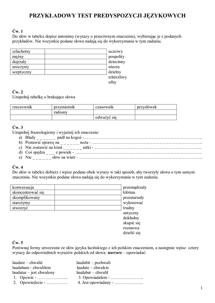 PRZYKŁADOWY TEST PREDYSPOZYCJI JĘZYKOWYCH Ćw. 1 Do słów w tabelce dopisz antonimy (wyrazy o przeciwnym znaczeniu), wybierając je z podanych przykładów. Nie wszystkie podane słowa nadają się do wykorzystania w tym zadaniu. szlachetny mężny dojrzały uroczysty sceptyczny uczciwy pospolity dziecinny niecny dzielny tchórzliwy ufny Ćw. 2 Uzupełnij tabelkę o brakujące słowa rzeczownik przymiotnik radosny czasownik przysłówek odważyć się Ćw. 3 Uzupełnij frazeologizmy i wyjaśnij ich znaczenie: a) Blady _ _ _ _ _ _ padł na kogoś -………………………………………………………………………. b) Postawić sprawę na _ _ _ _ _ _ noża - ………………………………………………………………….. c) Nie zostawić na kimś _ _ _ _ _ _ nitki - ………………………………………………………………... d) Coś spędza _ _ _ z powiek - ……………………………………………………………………………. e) Nie _ _ _ _ _ _ słów na wiatr - ………………………………………………………………………….. Ćw. 4 Do słów w tabelce dobierz i wpisz podane obok wyrazy w taki sposób, aby tworzyły słowa o tym samym znaczeniu. Nie wszystkie podane słowa nadają się do wykorzystania w tym zadaniu. konwersacja skoncentrować się skomplikowany starożytny stworzyć przemądrzały kłótnia przestarzały wykreować trudny antyczny dokładny skupić się rozmowa dzielić się Ćw. 5 Porównaj formy utworzone ze słów języka łacińskiego z ich polskim znaczeniem, a następnie wpisz cztery wyrazy do odpowiednich wyrazów polskich od słowa: narrare – opowiadać: laudare – chwalić laudabam - chwaliłem laudatur – jest chwalony 1. Opowie - ……………….... 2. Opowiedzcie - …………… laudabit – pochwali laudate – chwalcie laudabat – chwalił 3. Opowiadałem - ………………….. 4. Jest opowiadany - ……………….. 1 Ćw. 6 Porównaj formy utworzone ze słów języka łacińskiego z ich polskim znaczeniem, a następnie dobierz właściwe formy słów łacińskich, które są tłumaczeniem słów polskich: amare - kochać amatur – jest kochany amabat – kochał słowo polskie lekarzom jest obdarowywany słów bóg tańczył tańczyć hortus – ogród hortorum - ogrodów hortis – ogrodom odpowiednik po łacinie verbum saltare donatur donavisse verborum saltabat deus medici Ćw. 7 Wyjaśnij, jak rozumiesz podane wyrazy: tolerancja / tolerancyjny - ……………………………………………………………………… …………………………………………………………………………………………………... tryumf / tryumfować - ………………………………………………………………………….. …………………………………………………………………………………………………... kreować / kreatywny - ………………………………………………………………………….. …………………………………………………………………………………………………... ideał / idealny - …………………………………………………………………………………. …………………………………………………………………………………………………... Ćw. 8 W każdej linijce zakreśl wyraz, który nie pasuje pod względem gramatycznym do pozostałych: 1. las wczoraj kanapka drzewo 2. blado szybko czworo nieznacznie 3. lepszy dziwniejszy wesoło bardziej dociekliwy 4. powiedzą nauczy opowie zaśpiewa 5. znalazł widział mówił zobaczy Ćw. 9 Zwracając uwagę na charakterystyczny wygląd wyrazów we wskazanych przykładach, dopasuj fragmenty, które są kontynuacją podanych zdań. Wpisz odpowiednią literę w miejsce kropek. 1. Controlle constantemente as frituras para evitar ….................................... (portugalski) 2. A sült ételeket állandóan ellenőrizze ….......................................................(węgierski) 3. Kontroller hele tiden friturestegt mad for at undgå, …............................. (duński) a) at der går ild i den opvarmede olie b) que o óleo excessivamente aquecido se inflame c) nehogy a túl forró zsiradék lángot kapjon d) při smaženi jídel budte stále opatmí 2 Ćw. 10 Przeanalizuj dokładnie poniższy słowniczek i zdania oraz ich polskie tłumaczenia. Zastanów się, jakie reguły występują w tym języku: lana – dziewczynka vesso – pokój brivan – malować ter – duży kres – obrazek Lana briva kresok em vesso. - Dziewczynka maluje obrazek w pokoju. Lanas brivas kresosk em vessos. - Dziewczynki malują obrazki w pokojach. Lana brivada kresok ter. - Dziewczynka namalowała duży obrazek. Lana brivadra vessok. - Dziewczynka namaluje pokój. Teraz zapoznaj się z kolejną grupą słów z tego języka i dobierz do podanych polskich zdań ich odpowiedniki w tym języku. pok – chłopiec melivan – sadzić desso – drzewo sana – ogród ker – mały Chłopiec posadził małe drzewo. - ……………………………………………… Chłopiec sadzi drzewo w ogrodzie. - …………………………………………… A. Pok melivada ker dessok. B. Pok meliva dessok em sana. C. Desso melivabat em sana. D. Pok melivada dessok ker. 3