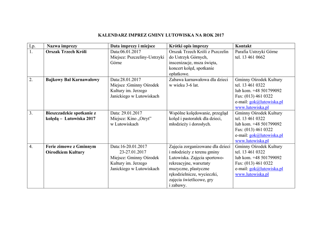 Kalendarz imprez Gminy Lutowiska na rok 2017