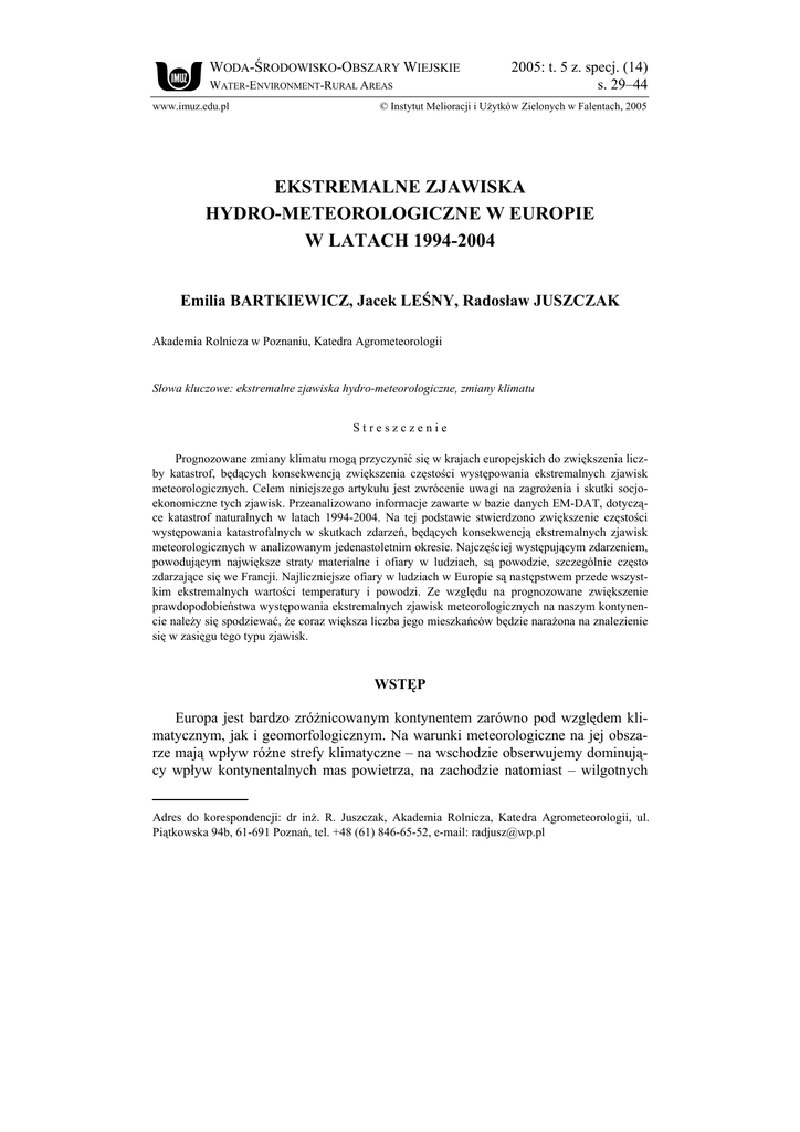 WODA-ŚRODOWISKO-OBSZARY WIEJSKIE WATER-ENVIRONMENT-RURAL AREAS www.imuz.edu.pl 2005: t. 5 z. specj. (14) s. 29–44 © Instytut Melioracji i Użytków Zielonych w Falentach, 2005 EKSTREMALNE ZJAWISKA HYDRO-METEOROLOGICZNE W EUROPIE W LATACH 1994-2004 Emilia BARTKIEWICZ, Jacek LEŚNY, Radosław JUSZCZAK Akademia Rolnicza w Poznaniu, Katedra Agrometeorologii Słowa kluczowe: ekstremalne zjawiska hydro-meteorologiczne, zmiany klimatu Streszczenie Prognozowane zmiany klimatu mogą przyczynić się w krajach europejskich do zwiększenia liczby katastrof, będących konsekwencją zwiększenia częstości występowania ekstremalnych zjawisk meteorologicznych. Celem niniejszego artykułu jest zwrócenie uwagi na zagrożenia i skutki socjoekonomiczne tych zjawisk. Przeanalizowano informacje zawarte w bazie danych EM-DAT, dotyczące katastrof naturalnych w latach 1994-2004. Na tej podstawie stwierdzono zwiększenie częstości występowania katastrofalnych w skutkach zdarzeń, będących konsekwencją ekstremalnych zjawisk meteorologicznych w analizowanym jedenastoletnim okresie. Najczęściej występującym zdarzeniem, powodującym największe straty materialne i ofiary w ludziach, są powodzie, szczególnie często zdarzające się we Francji. Najliczniejsze ofiary w ludziach w Europie są następstwem przede wszystkim ekstremalnych wartości temperatury i powodzi. Ze względu na prognozowane zwiększenie prawdopodobieństwa występowania ekstremalnych zjawisk meteorologicznych na naszym kontynencie należy się spodziewać, że coraz większa liczba jego mieszkańców będzie narażona na znalezienie się w zasięgu tego typu zjawisk. WSTĘP Europa jest bardzo zróżnicowanym kontynentem zarówno pod względem klimatycznym, jak i geomorfologicznym. Na warunki meteorologiczne na jej obszarze mają wpływ różne strefy klimatyczne – na wschodzie obserwujemy dominujący wpływ kontynentalnych mas powietrza, na zachodzie natomiast – wilgotnych Adres do korespondencji: dr inż. R. Juszczak, Akademia Rolnicza, Katedra Agrometeorologii, ul. Piątkowska 94b, 61-691 Poznań, tel. +48 (61) 846-65-52, e-mail: [email protected] 30 Woda-Środowisko-Obszary Wiejskie t. 5 z. specj. (14) i ciepłych mas powietrza atlantyckiego. W konsekwencji tak znacznego przestrzennego zróżnicowania warunków klimatycznych na naszym kontynencie występują z dużą częstością różne ekstremalne zjawiska hydro-meteorologiczne, których charakter i przebieg zależy przede wszystkim od specyfiki lokalnych warunków geomorfologicznych i hydro-meteorologicznych. Rozbudowana sieć hydrologiczna zachodniej i środkowej Europy sprawia, że obszar ten jest szczególnie narażony na katastrofalne w skutkach powodzie. W południowej i wschodniej części naszego kontynentu często występują uciążliwe susze i pożary lasów (szczególnie w regionie śródziemnomorskim). Z kolei zachodnia część Europy wraz z Wyspami Brytyjskimi jest szczególnie narażona na burze i wichury. Na górzystych obszarach kontynentu (Alpy, Pireneje i Karpaty) stosunkowo często zdarzają się natomiast lawiny. Trudno, co prawda, uznać je za zjawiska typowo meteorologiczne, jednak powstają w wyniku zaistnienia sprzyjającego ciągu zdarzeń meteorologicznych. Obszary środkowej i wschodniej części basenu Morza Śródziemnego znajdują się w strefie aktywnej sejsmicznie, w związku z czym występują tam trzęsienia ziemi oraz wybuchy wulkanów [Mapping …, 2003]. Prognozowane zwiększenie się liczby i częstości wymienionych wyżej katastrofalnych w skutkach zdarzeń, będących konsekwencją ekstremalnych zjawisk meteorologicznych, oraz zwiększająca się ruchliwość mieszkańców Europy (turystyczna i zarobkowa) powodują, że obecnie dla każdego Europejczyka istotnie zwiększa się prawdopodobieństwo znalezienia się na obszarze objętym katastrofą i odniesienia szkód w jej wyniku [LECKEBUSCH, ULBRICH, 2004]. Z uwagi na wzrost zagrożenia związany z ekstremalnymi zjawiskami meteorologicznymi rozważania naukowe i dyskusje w mediach, poświęcone powyższym zagadnieniom, powinny zmierzać do poszerzenia wiedzy o zagrożeniach powodowanych katastrofami naturalnymi, prawdopodobieństwie ich wystąpienia i skutkach. W konsekwencji będzie to sprzyjać wypracowaniu metod skutecznego minimalizowania ofiar w ludziach i strat gospodarczych wywołanych tymi zdarzeniami. Zamiarem autorów artykułu jest zwrócenie uwagi na zwiększającą się w ostatnich latach częstość występowania katastrof, wywołanych ekstremalnymi zjawiskami meteorologicznymi, oraz na ich skutki socjoekonomiczne. EKSTREMALNE ZJAWISKA METEOROLOGICZNE A ZMIANY KLIMATU Wiedza i świadomość opinii publicznej, dotycząca ekstremalnych zjawisk meteorologicznych, mechanizmów ich powstawania oraz ich skutków, w ostatnich latach jest coraz większa, przede wszystkim dzięki skierowaniu większej uwagi mediów na te zagadnienia [BENISTON, STEPHENSON, 2004]. Następstwem katastrof wywołanych ekstremalnymi zjawiskami pogodowymi są nie tylko straty gospodarcze, szacowane w milionach euro, ale również, co gorsza, ofiary w ludziach. E. Bartkiewicz, J. Leśny, R. Juszczak: Ekstremalne zjawiska hydro-meteorologiczne ... 31 Z raportów największych międzynarodowych firm ubezpieczeniowych wynika, że liczba katastrof naturalnych spowodowanych ekstremalnymi zjawiskami meteorologicznymi oraz liczba ofiar, które poniosły śmierć w ich wyniku, w ciągu ostatnich 25 lat systematycznie rosła (rys. 1) 80 450 1 400 2 Liczba zdarzeń Number of events 70 60 350 3 300 50 250 40 200 30 150 20 100 10 50 0 0 1950-1959 1960-1969 1970-1979 1980-1989 Straty materialne i ubezpieczenia, mld USD Value of damage costs and insurences in bilions of USD 90 1990-1999 Rys. 1. Liczba katastrof wywołanych ekstremalnymi zjawiskami hydro-meteorologicznymi (wliczając fale upałów i chłodu, burze i wichury, ekstremalne opady i susze) oraz związane z nimi straty i wartość wypłaconych ube