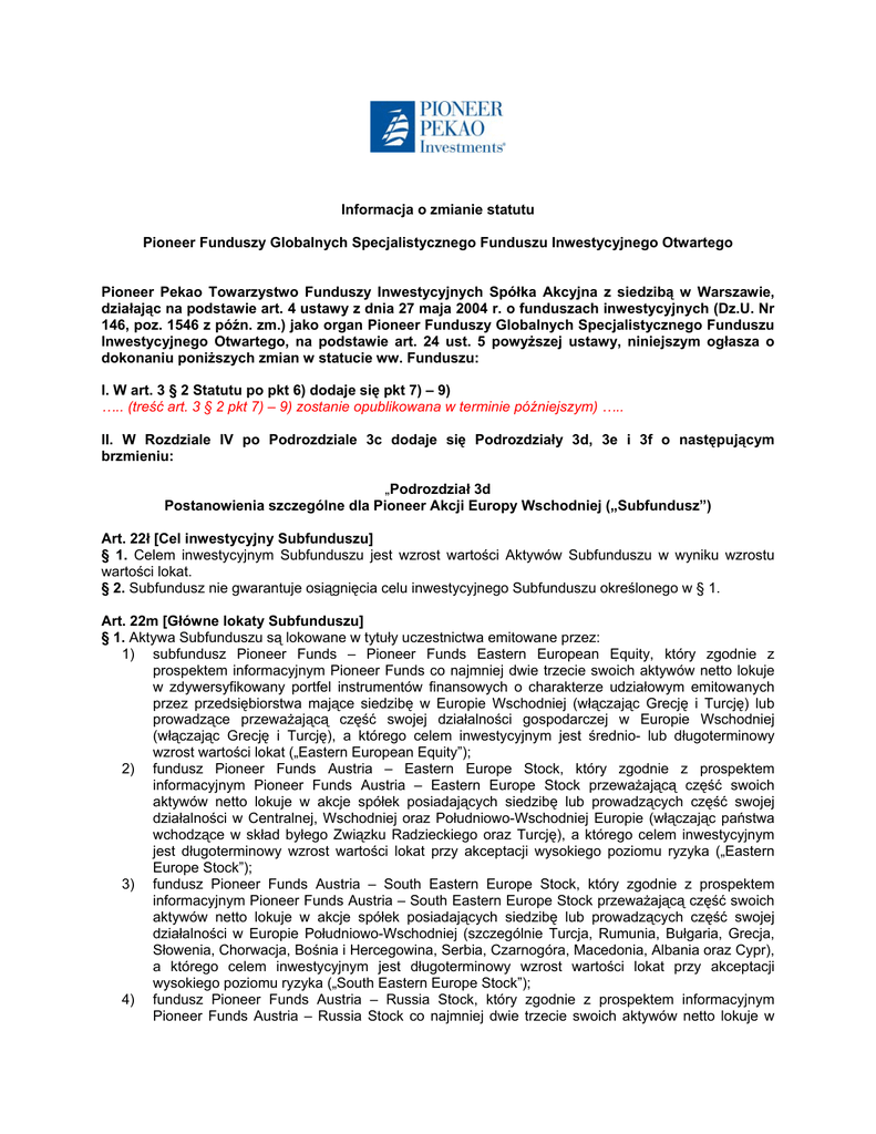 Informacja o zmianie statutu Pioneer Funduszy Globalnych Specjalistycznego Funduszu Inwestycyjnego Otwartego Pioneer Pekao Towarzystwo Funduszy Inwestycyjnych Spółka Akcyjna z siedzibą w Warszawie, działając na podstawie art. 4 ustawy z dnia 27 maja 2004 r. o funduszach inwestycyjnych (Dz.U. Nr 146, poz. 1546 z późn. zm.) jako organ Pioneer Funduszy Globalnych Specjalistycznego Funduszu Inwestycyjnego Otwartego, na podstawie art. 24 ust. 5 powyższej ustawy, niniejszym ogłasza o dokonaniu poniższych zmian w statucie ww. Funduszu: I. W art. 3 § 2 Statutu po pkt 6) dodaje się pkt 7) – 9) ….. (treść art. 3 § 2 pkt 7) – 9) zostanie opublikowana w terminie późniejszym) ….. II. W Rozdziale IV po Podrozdziale 3c dodaje się Podrozdziały 3d, 3e i 3f o następującym brzmieniu: „Podrozdział 3d Postanowienia szczególne dla Pioneer Akcji Europy Wschodniej („Subfundusz”) Art. 22ł [Cel inwestycyjny Subfunduszu] § 1. Celem inwestycyjnym Subfunduszu jest wzrost wartości Aktywów Subfunduszu w wyniku wzrostu wartości lokat. § 2. Subfundusz nie gwarantuje osiągnięcia celu inwestycyjnego Subfunduszu określonego w § 1. Art. 22m [Główne lokaty Subfunduszu] § 1. Aktywa Subfunduszu są lokowane w tytuły uczestnictwa emitowane przez: 1) subfundusz Pioneer Funds – Pioneer Funds Eastern European Equity, który zgodnie z prospektem informacyjnym Pioneer Funds co najmniej dwie trzecie swoich aktywów netto lokuje w zdywersyfikowany portfel instrumentów finansowych o charakterze udziałowym emitowanych przez przedsiębiorstwa mające siedzibę w Europie Wschodniej (włączając Grecję i Turcję) lub prowadzące przeważającą część swojej działalności gospodarczej w Europie Wschodniej (włączając Grecję i Turcję), a którego celem inwestycyjnym jest średnio- lub długoterminowy wzrost wartości lokat („Eastern European Equity”); 2) fundusz Pioneer Funds Austria – Eastern Europe Stock, który zgodnie z prospektem informacyjnym Pioneer Funds Austria – Eastern Europe Stock przeważającą część swoich aktywów netto lokuje w akcje spółek posiadających siedzibę lub prowadzących część swojej działalności w Centralnej, Wschodniej oraz Południowo-Wschodniej Europie (włączając państwa wchodzące w skład byłego Związku Radzieckiego oraz Turcję), a którego celem inwestycyjnym jest długoterminowy wzrost wartości lokat przy akceptacji wysokiego poziomu ryzyka („Eastern Europe Stock”); 3) fundusz Pioneer Funds Austria – South Eastern Europe Stock, który zgodnie z prospektem informacyjnym Pioneer Funds Austria – South Eastern Europe Stock przeważającą część swoich aktywów netto lokuje w akcje spółek posiadających siedzibę lub prowadzących część swojej działalności w Europie Południowo-Wschodniej (szczególnie Turcja, Rumunia, Bułgaria, Grecja, Słowenia, Chorwacja, Bośnia i Hercegowina, Serbia, Czarnogóra, Macedonia, Albania oraz Cypr), a którego celem inwestycyjnym jest długoterminowy wzrost wartości lokat przy akceptacji wysokiego poziomu ryzyka („South Eastern Europe Stock”); 4) fundusz Pioneer Funds Austria – Russia Stock, który zgodnie z prospektem informacyjnym Pioneer Funds Austria – Russia Stock co najmniej dwie trzecie swoich aktywów netto lokuje w akcje spółek posiadających siedzibę w Rosji lub w krajach należących do Wspólnoty Niepodległych Państw lub prowadzących działalność operacyjną głównie w tych państwach, a którego celem inwestycyjnym jest długoterminowy wzrost wartości lokat przy akceptacji wysokiego poziomu ryzyka („Russia Stock”); 5) inne, niż określone w pkt 1 - 4 powyżej, subfundusze Pioneer Funds oraz fundusze Pioneer Funds Austria. § 2. W celu zapewnienia odpowiedniej płynności Aktywów Subfunduszu i bieżącego dochodu część Aktywów Subfunduszu może być także lokowana w następujące instrumenty finansowe o charakterze dłużnym: obligacje emitowane przez Skarb Państwa Rzeczpospolitej Polskiej oraz przez inne Państwa Członkowskie, w dopuszczone do obrotu zorganizowanego lub będące w ofercie publicznej na terytorium Rzeczpospolitej Polskiej lub innego Państwa Członkowskiego obligacje emitowane przez innych emitentów posiadających rating Standard & Poor’s na poziomie nie niższym niż BBB- lub odpowiadający mu rating innych uznanych agencji ratingowych lub, w przypadku braku ratingu przyznanego przez uznaną agencję ratingową, posiadających pozytywną ocenę inwestycyjną dokonaną przez zarządzającego Subfunduszem, oraz instrumenty rynku pieniężnego posiadające rating krótkoterminowy wydany przez Standard & Poor’s nie niższy niż A3 lub odpowiadający mu rating innych uznanych agencji ratingowych lub, w przypadku braku ratingu przyznanego przez uznaną agencję ratingową, posiadające pozytywną ocenę inwestycyjną, dokonaną przez zarządzającego Subfunduszem, a także w depozyty bankowe. § 3. Zarządzający Subfunduszem może podejmować działania celem ograniczenia ryzyka inwestycyjnego związanego ze zmianą kursów walut obcych w relacji do waluty polskiej w związku z lokatami Subfunduszu dokonywanymi w tytuły uczestnictwa emitowane przez fundusze zagraniczne lub w inne instrumenty finansowe denominowane w walucie innej niż waluta polska zawierając umowy mające za przedmiot instrumenty pochodne. Art. 22n [Zasady dywersyfikacji lokat Subfunduszu] § 1. Fundusz może lokować do 50% Aktywów Subfunduszu w tytuły uczestnictwa Eastern European Equity, do 50% Aktywów Subfunduszu w tytuły uczestnictwa Eastern Europe Stock, do 50% Aktywów Subfunduszu w tytuły uczestnictwa South Eastern Europe Stock oraz do 50% Aktywów Subfunduszu w tytuły uczestnictwa Russia Stock. Udział lokat w tytuły uczestnictwa innych subfunduszy Pioneer Funds oraz funduszy Pioneer Funds Austria, o których mowa w art. 22m § 1 pkt 5, nie może przekroczyć łącznie 30% Aktywów Subfunduszu. § 2. Udział lokat, o który