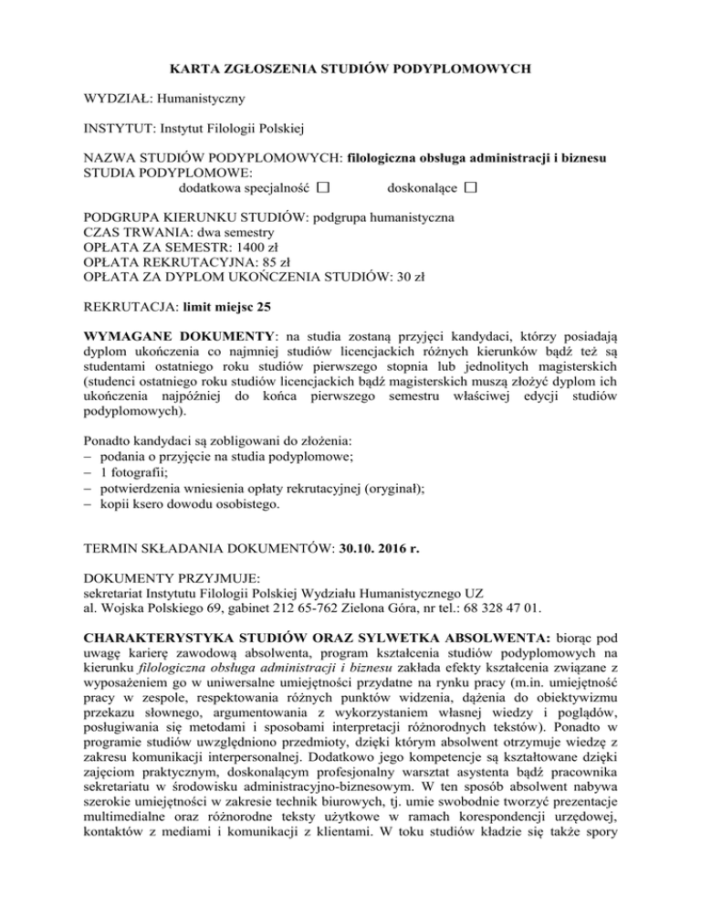 KARTA ZGŁOSZENIA STUDIÓW PODYPLOMOWYCH WYDZIAŁ: Humanistyczny INSTYTUT: Instytut Filologii Polskiej NAZWA STUDIÓW PODYPLOMOWYCH: filologiczna obsługa administracji i biznesu STUDIA PODYPLOMOWE: dodatkowa specjalność doskonalące PODGRUPA KIERUNKU STUDIÓW: podgrupa humanistyczna CZAS TRWANIA: dwa semestry OPŁATA ZA SEMESTR: 1400 zł OPŁATA REKRUTACYJNA: 85 zł OPŁATA ZA DYPLOM UKOŃCZENIA STUDIÓW: 30 zł REKRUTACJA: limit miejsc 25 WYMAGANE DOKUMENTY: na studia zostaną przyjęci kandydaci, którzy posiadają dyplom ukończenia co najmniej studiów licencjackich różnych kierunków bądź też są studentami ostatniego roku studiów pierwszego stopnia lub jednolitych magisterskich (studenci ostatniego roku studiów licencjackich bądź magisterskich muszą złożyć dyplom ich ukończenia najpóźniej do końca pierwszego semestru właściwej edycji studiów podyplomowych). Ponadto kandydaci są zobligowani do złożenia: − podania o przyjęcie na studia podyplomowe; − 1 fotografii; − potwierdzenia wniesienia opłaty rekrutacyjnej (oryginał); − kopii ksero dowodu osobistego. TERMIN SKŁADANIA DOKUMENTÓW: 30.10. 2016 r. DOKUMENTY PRZYJMUJE: sekretariat Instytutu Filologii Polskiej Wydziału Humanistycznego UZ al. Wojska Polskiego 69, gabinet 212 65-762 Zielona Góra, nr tel.: 68 328 47 01. CHARAKTERYSTYKA STUDIÓW ORAZ SYLWETKA ABSOLWENTA: biorąc pod uwagę karierę zawodową absolwenta, program kształcenia studiów podyplomowych na kierunku filologiczna obsługa administracji i biznesu zakłada efekty kształcenia związane z wyposażeniem go w uniwersalne umiejętności przydatne na rynku pracy (m.in. umiejętność pracy w zespole, respektowania różnych punktów widzenia, dążenia do obiektywizmu przekazu słownego, argumentowania z wykorzystaniem własnej wiedzy i poglądów, posługiwania się metodami i sposobami interpretacji różnorodnych tekstów). Ponadto w programie studiów uwzględniono przedmioty, dzięki którym absolwent otrzymuje wiedzę z zakresu komunikacji interpersonalnej. Dodatkowo jego kompetencje są kształtowane dzięki zajęciom praktycznym, doskonalącym profesjonalny warsztat asystenta bądź pracownika sekretariatu w środowisku administracyjno-biznesowym. W ten sposób absolwent nabywa szerokie umiejętności w zakresie technik biurowych, tj. umie swobodnie tworzyć prezentacje multimedialne oraz różnorodne teksty użytkowe w ramach korespondencji urzędowej, kontaktów z mediami i komunikacji z klientami. W toku studiów kładzie się także spory nacisk na umiejętność pracy ze słowem, w tym poznanie reguł poprawnościowych w polszczyźnie, które gwarantują tekstom zarówno przejrzystość informacyjną, jak i efektywność perswazyjną. Absolwent filologicznej obsługi administracji i biznesu bez trudu będzie stosował normy savoir vivre’u w codziennej praktyce zawodowej, będzie też wrażliwy na komunikacyjne uwarunkowania związane z kulturową, wyznaniową i obyczajową różnorodnością odbiorców. - do kogo adresowane: studia adresowane są do absolwentów studiów I i/lub II stopnia, którzy pracują w obsłudze administracji i biznesu bądź zamierzający taką pracę podjąć. - kwalifikacje po ukończeniu studiów: absolwent studiów podyplomowych w zakresie filologicznej obsługi administracji i biznesu otrzymuje świadectwo ich ukończenia, potwierdzające nabyte kwalifikacje do pracy jako asystent/asystentka w środowisku administracyjno-biznesowym lub w instytucjach działających w sferze komunikacji publicznej, kultury, nauki i innych. Jest wyposażony w uniwersalne umiejętności związane z organizacją spotkań biznesowych, kontaktów interpersonalnych i instytucjonalnych. Zna technik biurowe, umie swobodnie tworzyć prezentacje multimedialne oraz różnorodne teksty użytkowe w ramach korespondencji urzędowej, kontaktów z mediami i komunikacji z klientami. Zna i potrafi stosować reguły poprawnościowe polszczyzny, które gwarantują tekstom zarówno przejrzystość informacyjną, jak i efektywność perswazyjną. Bez trudu stosuje normy savoir vivre’u w codziennej praktyce zawodowej, a także jest wrażliwy na komunikacyjne uwarunkowania związane z kulturową, wyznaniową i obyczajową różnorodnością odbiorców. INFORMACJE DODATKOWE: zajęcia odbywać się będą tylko w soboty i niedziele (w godz. 9.00–18.30). W każdym semestrze zaplanowanych będzie 8 zjazdów (zazwyczaj po dwa w miesiącu). Szczegółowe informacje na temat studiów i ich organizacji (podanie o przyjęcie na studia, program studiów wraz z sylabusami przedmiotów, harmonogram zjazdów i plany zajęć, numer konta bankowego studiów itp.) są dostępne na stronie: www.ifp.uz.zgora.pl (zakładka: studia i studenci / studia podyplomowe). KIEROWNIK STUDIÓW: dr Tomasz Ratajczak, nr tel. 667 258 558, e-mail: [email protected]