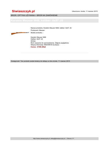 Siwiaszczyk.pl Utworzono: środa, 11 marzec 2015 BROŃ I OPTYKA UŻYWANA > BROŃ NA ZAMÓWIENIE Karabin Mauser M48, kaliber: 8x57 JS Nazwa produktu: Karabin Mauser M48, kaliber: 8x57 JS Producent: Mauser Model produktu: Karabin Mauser M48 Kaliber: 8x57 JS Broń używana do sprowadzenia. Zdjęcie poglądowe. Więcej informacji: 692439518 (Łukasz) Cena: 3100.00zł Dostępność: Ten produkt został dodany do sklepu w dniu środa, 11 marzec 2015 http://www.siwiaszczyk.pl | [email protected] | | Strona 1/1
