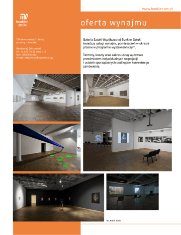 www.bunkier.art.pl ofe r t a wyna jm u Zainteresowanych ofertą prosimy o kontakt: Bartłomiej Zakrzewski tel. 12 422 10 52 wew. 116 kom. 668 806 412 e-mail: [email protected] Galeria Sztuki Współczesnej Bunkier Sztuki świadczy usługi wynajmu pomieszczeń w okresie przerw w programie wystawienniczym. Terminy, koszty oraz zakres usług są zawsze przedmiotem indywidualnych negocjacji i ustaleń sporządzanych pod kątem konkretnego zamówienia. fot. Rafał Sosin www.bunkier.art.pl oferta wynajmu oferta wynajmu Przestrzeń wystawiennicza – poziom 0 (wystawa Ukryta dekada, 2009) fot. Rafał Sosin Przestrzeń wystawiennicza – poziom 0 (wystawa Witkacy. Psychoholizm, 2009) www.bunkier.art.pl oferta wynajmu oferta wynajmu Przestrzeń wystawiennicza – poziom 0 (wystawa Witkacy. Psychoholizm, 2009) Przestrzeń wystawiennicza – poziom 0 (wystawa Shinjiego Ogawy Realizm perwersyjny, 2008) fot. Rafał Sosin Przestrzeń wystawiennicza – poziom 0 (wystawa Witkacy. Psychoholizm, 2009) Korytarz łączący poziom 0 i poziom +1 (wystawa Roberta Kuśmirowskiego Masyw kolekcjonerski, 2009) www.bunkier.art.pl oferta wynajmu oferta wynajmu Przestrzeń wystawiennicza – poziom +1 (wystawa zbiorowa Przekleństwa wyobraźni, 2010) Przestrzeń wystawiennicza – poziom +1 (wystawa zbiorowa Przekleństwa wyobraźni, 2010) Przestrzeń wystawiennicza – poziom +1 (wystawa zbiorowa Przekleństwa wyobraźni, 2010) Przestrzeń wystawiennicza – poziom +1 (wystawa Karola Radziszewskiego Backstage, 2011) www.bunkier.art.pl oferta wynajmu oferta wynajmu Powierzchnia wystawiennicza poziom +1 Galeria dysponuje łączną powierzchnią około 1300 m2 o następującym rozkładzie: poziom 0 Przestrzeń wystawiennicza – poziom -1 (Galeria Dolna) przestrzeń ekspozycyjna (poziom +1) – 570 m2 pomieszczenie audiowizualne przeznaczone dla około 20 osób (poziom +1) – 33 m2 przestrzeń ekspozycyjna (poziom 0) – 420 m2 poziom -1 pomieszczenie audiowizualne przeznaczone dla około 100 osób (poziom -1) – 130 m2 przestrzeń ekspozycyjna (poziom -1) – 145 m2 Sala audiowizualna – poziom -1 fot. Rafał Sosin www.bunkier.art.pl oferta wynajmu projektory multimedialne dostęp do Internetu monitory Infrastruktura techniczna Galerii oświetlenie ekspozycyjne rzutnik slajdów odtwarzacze DVD system nagłośnieniowy Galeria Sztuki Współczesnej Bunkier Sztuki pl. Szczepański 3a, 31-011 Kraków tel.: (+48) 12 422 40 21, 12 422 10 52 fax: (+48) 12 422 83 03, [email protected] Dyrektor: Piotr Cypryański