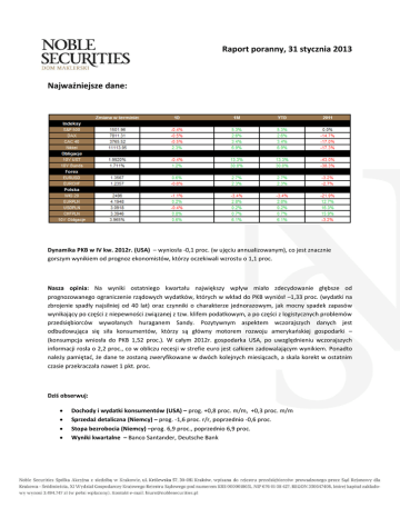 Raport poranny, 31 stycznia 2013 Najważniejsze dane: Dynamika PKB w IV kw. 2012r. (USA) – wyniosła -0,1 proc. (w ujęciu annualizowanym), co jest znacznie gorszym wynikiem od prognoz ekonomistów, którzy oczekiwali wzrostu o 1,1 proc. Nasza opinia: Na wyniki ostatniego kwartału największy wpływ miało zdecydowanie głębsze od prognozowanego ograniczenie rządowych wydatków, których w wkład do PKB wyniósł –1,33 proc. (wydatki na zbrojenie spadły najsilniej od 40 lat) oraz czynniki o charakterze jednorazowym, jak mocny spadek zapasów wynikający po części z niepewności związanej z tzw. klifem podatkowym, a po części z logistycznych problemów przedsiębiorców wywołanych huraganem Sandy. Pozytywnym aspektem wczorajszych danych jest odbudowująca się siła konsumentów, którzy są główny motorem rozwoju amerykańskiej gospodarki – (konsumpcja wniosła do PKB 1,52 proc.). W całym 2012r. gospodarka USA, po uwzględnieniu wczorajszych informacji rosła o 2,2 proc., co w obliczu recesji w strefie euro jest całkiem zadowalającym wynikiem. Ponadto należy pamiętać, że dane te zostaną zweryfikowane w dwóch kolejnych miesiącach, a skala korekt w ostatnim czasie przekraczała nawet 1 pkt. proc. Dziś obserwuj: Dochody i wydatki konsumentów (USA) – prog. +0,8 proc. m/m, +0,3 proc. m/m Sprzedaż detaliczna (Niemcy) – prog. -1,6 proc. r/r, poprzednio -0,6 proc. Stopa bezrobocia (Niemcy) –prog. 6,9 proc., poprzednio 6,9 proc. Wyniki kwartalne – Banco Santander, Deutsche Bank Analiza techniczna: GPW WIG20 Broniony dzień wcześniej świecową formacją młota poziom 2 510 pkt (38.2-procentowe zniesienie listopadowo-grudniowej fali wzrostowej) został przełamany. W związku z tym kolejnym celem trwającej od początku stycznia korekty staje się zniesienie 61.8-procentowe (2 430 pkt). Głównym wyznacznikiem niedźwiedziej przewagi jest miesięczna spadkowa linia trendu przebiegająca obecnie na pułapie 2 560 pkt. Kęty Korekta trwająca od połowy grudnia przyjęła formę trójkąta. Wybicie ponad jego górne ramię sygnalizuje możliwość powrotu do tendencji wzrostowej. Minimalny cel wybicia szacowany na podstawie szerokości opuszczonej formacji wynosi 152, czyli lekko przekracza pułap ostatnich grudniowych maksimów. Puławy Trwająca od połowy grudnia spadkowa korekta doprowadziła do przełamania rocznej linii trendu wzrostowego. Bezpośrednio po tym negatywnym rozstrzygnięciu utworzona została pochylona formacja odwróconej głowy z ramionami, która nie tylko może kończyć korektę, ale także niesie za sobą potencjał wzrostowy (ok. 138) pozwalający powrócić ponad przełamaną linię trendu. urs przełamał linię szyi 8-tygodniowej formacji głowy z ramionami (66.0). Zasiąg wybicia szacowany na podstawie wysokości opuszczonej formacji wynosi 59.1. Zbiega się on z 61.8-procentowym zniesieniem fali wzrostowej z okresu połowa października – koniec grudnia. Analiza techniczna: Waluty GBP/USD D1: Kurs funta do dolara od początku roku stoi pod dużą presją sprzedających i po dynamicznych spadkach dotarł do długoterminowej linii trendu wzrostowego, przy której wyrysowała się formacja świecowa przenikania, dająca szansę na odreagowanie ostatnich spadków. Kurs po przebiciu poprzedniego dołka na poziomie 1,5825, próbuje przetestować ponownie to miejsce od drugiej strony, stanowiące obecnie istotny opór. Gdyby udało się go pokonać korekta miałaby szansę sięgnąć poziomów: 1,5943 (38,2% ostatniego impulsu spadkowego) oraz 1,5990 (poprzedni dołek z 9 stycznia). Miedź (Copper Fut.) D1 Kurs kontraktów na miedź w dniu wczorajszym naruszył po raz pierwszy górne ograniczenie dużej formacji zawężającego się trójkąta, w której przebywał od ponad roku. Dodatkowo ostatnia korekta kursu przybrała postać odwróconej głowy z ramionami, której cel zlokalizowany jest przy poziomie 381,30. W tym miejscu wypada także górne ograniczenie formacji zawężającego się klina, które potencjalnie mogłoby zatrzymać kupujących. Nieco wyżej w okolicach poziomu 383,70 wypadają także poprzednie szczyty z początku maja i połowy września 2012, stanowiące krótkoterminowy cel analizy. Biorąc pod uwagę jednak tak długą konsolidację kursu przestrzeń na wzrosty może być nawet większa i sięgać poziomów poprzednich szczytów z pierwszego kwartału 2012 roku w okolicach poziomów: 395 – 398. Do tego jednak w pierwszej kolejności kurs musiałby wybić górne ograniczenie klina i wcześniej wspomniany opór na poziomie 383,70. Wsparcie stanowi obecnie wybita linia górnego ograniczenia trójkąta. W1: Na wykresie tygodniowym kurs po dotarciu do dolnego ograniczenia trójkąta broni na chwilę obecną tego wsparcia, a obecna świeca która się wyrysowuje przybrała postać młota. Jeśli w takiej postaci zakończy tydzień może to oddalić szansę na większą przecenę funta, a kurs będzie miał szansę ponownie zaatakować górną linię trójkąta w okolicach poziomu 1,63. Przebicie dołem byłoby niewątpliwie niepokojącym sygnałem, ponieważ wybicie dołem z 3 letniej konsolidacji, która poprzedzał ruch spadkowy, otwierałoby drogę do dużej przeceny tej pary walutowej, a najbliższym celem mógłby w tym przypadku okazać się poziom 1,5260. Departament Analiz Rynkowych Noble Securities S.A. Najważniejsze wydarzenia, dziś obserwuj: Łukasz Wróbel, Główny Analityk [email protected] Tel: +48 600 942 105 Analiza techniczna – GPW: Krzysztof Ojczyk, Starszy Analityk [email protected] Tel: +48 12 422 31 00 wew.113 Analiza techniczna – waluty: Dominik Łebek, Departament Rynków Zagranicznych [email protected] Tel: +48 22 212 54 35 Niniejsze opracowanie jest jedynie materiałem informacyjnym do użytku odbiorcy. Materiał został przygotowany z należytą starannością i rzetelnością, na podstawie ogólnodostępnych informacji, ale ani autor, ani Noble Securities S.A. nie gwarantują je