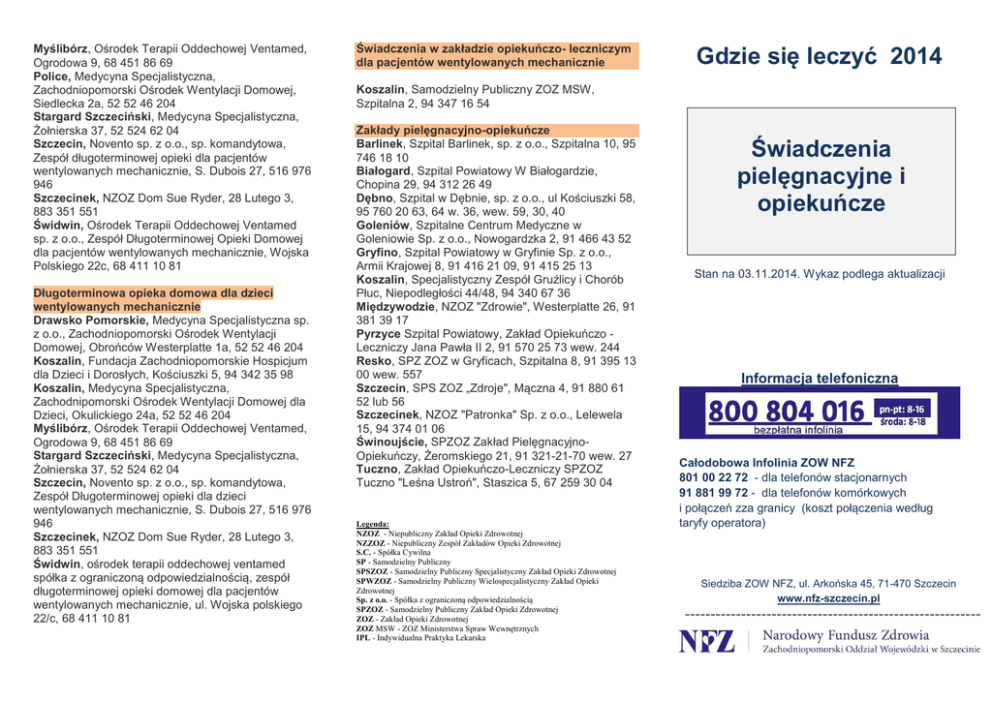 Myślibórz, Ośrodek Terapii Oddechowej Ventamed, Ogrodowa 9, 68 451 86 69 Police, Medycyna Specjalistyczna, Zachodniopomorski Ośrodek Wentylacji Domowej, Siedlecka 2a, 52 52 46 204 Stargard Szczeciński, Medycyna Specjalistyczna, Żołnierska 37, 52 524 62 04 Szczecin, Novento sp. z o.o., sp. komandytowa, Zespół długoterminowej opieki dla pacjentów wentylowanych mechanicznie, S. Dubois 27, 516 976 946 Szczecinek, NZOZ Dom Sue Ryder, 28 Lutego 3, 883 351 551 Świdwin, Ośrodek Terapii Oddechowej Ventamed sp. z o.o., Zespół Długoterminowej Opieki Domowej dla pacjentów wentylowanych mechanicznie, Wojska Polskiego 22c, 68 411 10 81 Długoterminowa opieka domowa dla dzieci wentylowanych mechanicznie Drawsko Pomorskie, Medycyna Specjalistyczna sp. z o.o., Zachodniopomorski Ośrodek Wentylacji Domowej, Obrońców Westerplatte 1a, 52 52 46 204 Koszalin, Fundacja Zachodniopomorskie Hospicjum dla Dzieci i Dorosłych, Kościuszki 5, 94 342 35 98 Koszalin, Medycyna Specjalistyczna, Zachodnipomorski Ośrodek Wentylacji Domowej dla Dzieci, Okulickiego 24a, 52 52 46 204 Myślibórz, Ośrodek Terapii Oddechowej Ventamed, Ogrodowa 9, 68 451 86 69 Stargard Szczeciński, Medycyna Specjalistyczna, Żołnierska 37, 52 524 62 04 Szczecin, Novento sp. z o.o., sp. komandytowa, Zespół Długoterminowej opieki dla dzieci wentylowanych mechanicznie, S. Dubois 27, 516 976 946 Szczecinek, NZOZ Dom Sue Ryder, 28 Lutego 3, 883 351 551 Świdwin, ośrodek terapii oddechowej ventamed spółka z ograniczoną odpowiedzialnością, zespół długoterminowej opieki domowej dla pacjentów wentylowanych mechanicznie, ul. Wojska polskiego 22/c, 68 411 10 81 Świadczenia w zakładzie opiekuńczo- leczniczym dla pacjentów wentylowanych mechanicznie Gdzie się leczyć 2014 Koszalin, Samodzielny Publiczny ZOZ MSW, Szpitalna 2, 94 347 16 54 Zakłady pielęgnacyjno-opiekuńcze Barlinek, Szpital Barlinek, sp. z o.o., Szpitalna 10, 95 746 18 10 Białogard, Szpital Powiatowy W Białogardzie, Chopina 29, 94 312 26 49 Dębno, Szpital w Dębnie, sp. z o.o., ul Kościuszki 58, 95 760 20 63, 64 w. 36, wew. 59, 30, 40 Goleniów, Szpitalne Centrum Medyczne w Goleniowie Sp. z o.o., Nowogardzka 2, 91 466 43 52 Gryfino, Szpital Powiatowy w Gryfinie Sp. z o.o., Armii Krajowej 8, 91 416 21 09, 91 415 25 13 Koszalin, Specjalistyczny Zespół Gruźlicy i Chorób Płuc, Niepodległości 44/48, 94 340 67 36 Międzywodzie, NZOZ "Zdrowie", Westerplatte 26, 91 381 39 17 Pyrzyce Szpital Powiatowy, Zakład Opiekuńczo Leczniczy Jana Pawła II 2, 91 570 25 73 wew. 244 Resko, SPZ ZOZ w Gryficach, Szpitalna 8, 91 395 13 00 wew. 557 Szczecin, SPS ZOZ „Zdroje", Mączna 4, 91 880 61 52 lub 56 Szczecinek, NZOZ "Patronka" Sp. z o.o., Lelewela 15, 94 374 01 06 Świnoujście, SPZOZ Zakład PielęgnacyjnoOpiekuńczy, Żeromskiego 21, 91 321-21-70 wew. 27 Tuczno, Zakład Opiekuńczo-Leczniczy SPZOZ Tuczno "Leśna Ustroń", Staszica 5, 67 259 30 04 Legenda: NZOZ - Niepubliczny Zakład Opieki Zdrowotnej NZZOZ - Niepubliczny Zespół Zakładów Opieki Zdrowotnej S.C. - Spółka Cywilna SP - Samodzielny Publiczny SPSZOZ - Samodzielny Publiczny Specjalistyczny Zakład Opieki Zdrowotnej SPWZOZ - Samodzielny Publiczny Wielospecjalistyczny Zakład Opieki Zdrowotnej Sp. z o.o. - Spółka z ograniczoną odpowiedzialnością SPZOZ - Samodzielny Publiczny Zakład Opieki Zdrowotnej ZOZ - Zakład Opieki Zdrowotnej ZOZ MSW - ZOZ Ministerstwa Spraw Wewnętrznych IPL - Indywidualna Praktyka Lekarska Świadczenia pielęgnacyjne i opiekuńcze Stan na 03.11.2014. Wykaz podlega aktualizacji Informacja telefoniczna Całodobowa Infolinia ZOW NFZ 801 00 22 72 - dla telefonów stacjonarnych 91 881 99 72 - dla telefonów komórkowych i połączeń zza granicy (koszt połączenia według taryfy operatora) Siedziba ZOW NFZ, ul. Arkońska 45, 71-470 Szczecin www.nfz-szczecin.pl ---------------------------------------------------------- Pielęgniarska opieka długoterminowa (domowa) Barlinek, Pielęgniarska Opieka Domowa Mariola Bogdanowicz, Gorzowska 5, 514 033 008 Barwice, NZOZ "Lukmed", Kościuszki 3, 94 63 353 49 Barwice, Jolanta Zagowałko, Zakład usług pielęgniarsko-opiekuńczych, Kościuszki 3, 94 365 35 49 Białogard, Centrum Pielęgnacyjno-Opiekuńcze "Nadzieja", Kisielice Duże 30, 666 829 479 Białogard, Usługi Pielęgniarskie Łońska Irena, Batalionów Chłopskich 27/2, 661 775 653 Biesiekierz, Profesjonalne Usługi PielęgniarskoOpiekuńcze Dorota Skalska, Biesiekierz 114a, 606 797 415 Choszczno, Pielęgniarska Opieka Długoterminowa „Edmed”, Edyta Kopczyńska, Niedziałkowskiego 17, 601 651 792 Choszczno, Anna Nowak – „Help –Med.” , Tuwima 10, 91 577 06 72 Drawsko Pomorskie, Zakład Usług Medycznych Puls-Med, Obrońców Westerplatte 1a, 602 876 877 Drawsko Pomorskie, Zakład Domowej Opieki Długoterminowej, Chrobrego 4, 91 39 26 531, 509 142 650 Goleniów, Pielęgniarki i Położne Rodzinne – Małgorzata Holek, Pocztowa 43, 91 418 96 05 Goleniów, Zakład Domowej Opieki Długoterminowej, Słowackiego 1A, 509 142 650, 91 40 71 445 Gościno, Jolanta Zagowałko, Pielęgniarska Opieka Długoterminowa, Lipowa 18/2, 94 365 35 49 Gryfice, ZOZ "Mil-Med", Adam Majewski, Księdza Ruta 8/1, 91 384 68 50 Gryfino, Euromedica Centrum Medyczne, Dębce 11, 605 558 022 Kamień Pomorski, Zakład Domowej Opieki Długoterminowej, Kopernika 26, 91 39 26 531, 509 142 650 Kołobrzeg, Usługi Medyczne Izabela Maćkiewicz, Waszyngtona 1/11b, 501 376 993 Kołobrzeg, Centrum Medyczne Viomed Wioletta Krociak, Kupiecka 5a-5b, 502 781 721 Koszalin, „Bogumiła" Bogumiła Aziewicz - Gabis Usługi Pielęgniarskie, Niepodległości 44-48, 508 185 558 Koszalin, „Lusi-Med" Lucyna Szpilak Usługi Pielęgniarsko-Opiekuńcze, Niepodległości 44-48, 504 620 332 Lipiany, NZOZ Certus, Grzegorz Skwierz, Myśliborska 3, 91 423 80 39 Łobez, Zakład Domowej Opieki Długoterminowej, Niepodległości 66b, 91 39 26 531, 509 142 650 Mierzyn, Jacek Matusiak, Pielęgniarska Opieka Długoterminow