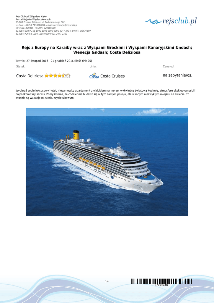 RejsClub.pl Zbigniew Kąkol Portal Rejsów Wycieczkowych 83-000 Pruszcz Gdański, ul. Podkomorzego 58/1 tel./fax: +48 58 7138200/01, email: [email protected] NIP: 6511430265, REGON: 220868580 BZ WBK EUR PL 58 1090 1098 0000 0001 2047 2434, SWIFT: WBKPPLPP BZ WBK PLN 82 1090 1098 0000 0001 2047 2390 Rejs z Europy na Karaiby wraz z Wyspami Greckimi i Wyspami Kanaryjskimi – Wenecja – Costa Deliziosa Termin: 27 listopad 2016 - 21 grudzień 2016 (ilość dni: 25) Statek: Costa Deliziosa Linia: Cena od: Costa Cruises na zapytanie/os. Wyobraź sobie luksusowy hotel, niesamowity apartament z widokiem na morze, wykwintną światową kuchnię, atmosferę ekskluzywności i najznakomitszy serwis. Pomyśl teraz, że codziennie budzisz się w tym samym pokoju, ale w innym niezwykłym miejscu na świecie. To właśnie są wakacje na statku wycieczkowym. 1/4 EV:42418 RejsClub.pl Zbigniew Kąkol Portal Rejsów Wycieczkowych 83-000 Pruszcz Gdański, ul. Podkomorzego 58/1 tel./fax: +48 58 7138200/01, email: [email protected] NIP: 6511430265, REGON: 220868580 BZ WBK EUR PL 58 1090 1098 0000 0001 2047 2434, SWIFT: WBKPPLPP BZ WBK PLN 82 1090 1098 0000 0001 2047 2390 TRASA REJSU dzień 1 dzień 2 dzień 3 Data Port Wpłynięcie Wypłynięcie niedziela 27.11.2016 Wenecja --:-- 17:00 14:00 20:00 09:00 14:00 08:00 13:00 08:00 18:00 08:00 17:00 09:00 18:00 08:00 14:00 Włochy Bari poniedziałek 28.11.2016 Włochy wtorek 29.11.2016 Grecja Korfu środa 30.11.2016 Mesyna, Sycylia czwartek 01.12.2016 Civitavecchia, Rzym piątek 02.12.2016 Savona sobota 03.12.2016 Marsylia niedziela 04.12.2016 Barcelona dzień 9 poniedziałek 05.12.2016 Dzień na morzu --:-- --:-- dzień 10 wtorek 06.12.2016 Casablanca 08:00 23:00 dzień 11 środa 07.12.2016 Dzień na morzu --:-- --:-- dzień 12 czwartek 08.12.2016 Arrecife, Lanzarote / Wyspy Kanaryjskie 08:00 18:00 08:00 17:00 dzień 4 dzień 5 dzień 6 dzień 7 dzień 8 Włochy Włochy Włochy Francja Hiszpania Maroko Hiszpania dzień 13 piątek 09.12.2016 Santa Cruz de Tenerife, Teneryfa / Wyspy Kanaryjskie Hiszpania 2/4 EV:42418 Legenda RejsClub.pl Zbigniew Kąkol Portal Rejsów Wycieczkowych 83-000 Pruszcz Gdański, ul. Podkomorzego 58/1 tel./fax: +48 58 7138200/01, email: [email protected] NIP: 6511430265, REGON: 220868580 BZ WBK EUR PL 58 1090 1098 0000 0001 2047 2434, SWIFT: WBKPPLPP BZ WBK PLN 82 1090 1098 0000 0001 2047 2390 Data Port Wpłynięcie Wypłynięcie dzień 14 sobota 10.12.2016 Dzień na morzu --:-- --:-- dzień 15 niedziela 11.12.2016 Dzień na morzu --:-- --:-- dzień 16 poniedziałek 12.12.2016 Dzień na morzu --:-- --:-- dzień 17 wtorek 13.12.2016 Dzień na morzu --:-- --:-- dzień 18 środa 14.12.2016 Dzień na morzu --:-- --:-- dzień 19 czwartek 15.12.2016 Dzień na morzu --:-- --:-- dzień 20 piątek 16.12.2016 Saint John's, Antigua 08:00 17:00 dzień 21 sobota 17.12.2016 Dzień na morzu --:-- --:-- dzień 22 niedziela 18.12.2016 Catalina Island 07:00 17:00 08:00 15:00 Dzień na morzu --:-- --:-- Port Everglades 06:00 --:-- dzień 23 poniedziałek 19.12.2016 dzień 24 wtorek 20.12.2016 dzień 25 środa 21.12.2016 Legenda Antigua i Barbuda Republika Dominikańska Amber Cove Republika Dominikańska Stany Zjednoczone CENNIK Cena katalogowa kabina gwarantowana €1 549.00 Suite with Ocean View Balcony €2 599.00 Cena promocyjna 3/4 EV:42418 RejsClub.pl Zbigniew Kąkol Portal Rejsów Wycieczkowych 83-000 Pruszcz Gdański, ul. Podkomorzego 58/1 tel./fax: +48 58 7138200/01, email: [email protected] NIP: 6511430265, REGON: 220868580 BZ WBK EUR PL 58 1090 1098 0000 0001 2047 2434, SWIFT: WBKPPLPP BZ WBK PLN 82 1090 1098 0000 0001 2047 2390 Panorama Suite with Ocean View Balcony €2 899.00 Samsara with Ocean View Balcony €2 299.00 Mini Suite with Ocean View Balcony €2 349.00 Classic €1 699.00 Samsara Suite with Ocean View Balcony €2 899.00 Grand Suite with Ocean View Balcony €3 299.00 Balcony Premium €1 999.00 Opłaty portowe €200.00 Uwaga! Ceny za osobę w kabinie dwuosobowej. Cena zawiera: zakwaterowanie w kabinie wybranej kategorii; wyżywienie - 3 główne posiłki, przekąski między posiłkami; napoje serwowane do śniadania i w bufetach samoobsługowych; serwis bagażowy podczas wejścia i zejścia ze statku; serwis kabinowy; korzystanie ze wszystkich urządzeń sportowo - rekreacyjnych znajdujących się na pokładzie statku (basen, jacuzzi, sala fitness, itp.); udział we wszystkich imprezach organizowanych na statku (przedstawienia w teatrze, koncerty, programy animacyjne itp.). Cena nie zawiera: kosztów dojazdu do portu; opłat portowych; ewentualnych noclegów w hotelu przed/po rejsie i transferów; wycieczek fakultatywnych w trakcie rejsu; korzystania z barów, mini baru w kabinie oraz napojów zamawianych w restauracji; korzystania z punktów usługowych (fryzjer, pralnia, fotograf, salon piękności i odnowy biologicznej, internet) i wydatków osobistych; napiwków dla obsługi na statku (kwota uzależniona od długości rejsu); ubezpieczenia KL, NNW i bagaż, kosztów wiz (tam gdzie wymagane). Uwagi: Od 01.12.2015 na wszystkich rejsach Costa Cruises (z min. 5 noclegów) można zarezerwować następujące pakiety all inclusive: dla dzieci 4-17 lat Giovani od 15.99€/os./dzień, dla dorosłych: Brindiamo od 24.99€/os./dzień, Piu Gusto od 27.99€/os./dzień, Intenditore od 45.99€/os./dzień (pakiet musi być wykupiony przez każdą osobę zakwaterowaną w kabinie - można zakupić w biurze przed rejsem). Na Państwa życzenie zarezerwujemy przelot, transfery do/z portu, parking, dodatkowe noclegi oraz zadbamy o odpowiednie ubezpieczenie podróżne. 4/4 EV:42418