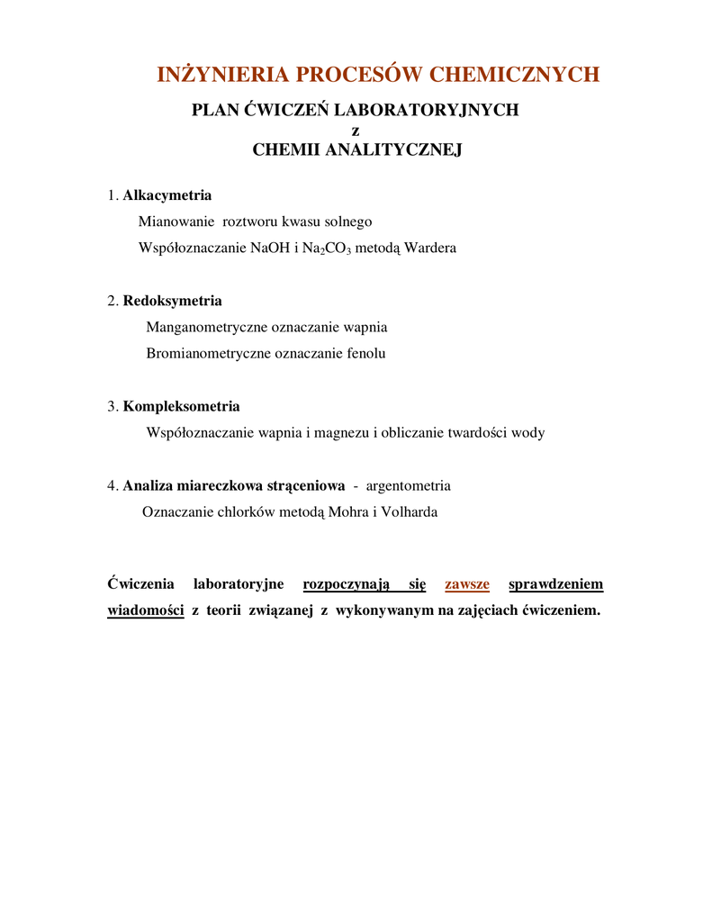 INŻYNIERIA PROCESÓW CHEMICZNYCH PLAN ĆWICZEŃ LABORATORYJNYCH z CHEMII ANALITYCZNEJ 1. Alkacymetria Mianowanie roztworu kwasu solnego Współoznaczanie NaOH i Na2CO 3 metodą Wardera 2. Redoksymetria Manganometryczne oznaczanie wapnia Bromianometryczne oznaczanie fenolu 3. Kompleksometria Współoznaczanie wapnia i magnezu i obliczanie twardości wody 4. Analiza miareczkowa strąceniowa - argentometria Oznaczanie chlorków metodą Mohra i Volharda Ćwiczenia laboratoryjne rozpoczynają się zawsze sprawdzeniem wiadomości z teorii związanej z wykonywanym na zajęciach ćwiczeniem. Zagadnienia teoretyczne 1. Alkacymetria - reakcje kwas-zasada Prawo zachowania masy i prawo działania mas. Stała równowagi reakcji. Stała dysocjacji, stopień dysocjacji, ich wzajemne powiązanie, zależności. Teoria Bronsteda, sprzężona para kwas-zasada. Kwasy (zasady) – cząsteczki obojętne, jony, amfotery kwasowo-zasadowe. W jaki sposób określa się moc kwasów i zasad ? Efekt wyrównujący wody. Wskaźniki alkacymetryczne. Roztwory buforowe (pH buforu, pojemność buforowa). Zasada współoznaczania NaOH i Na2CO3 - reakcje biegnące w czasie tych oznaczeń. 2. Redoksymetria - reakcje utleniania-redukcji Kiedy mamy do czynienia z reakcją red-oks? Sprzężona para utleniacz-reduktor. Co jest utleniaczem bądź reduktorem? Przykłady. Amfotery red-oks. Wzór Nernsta. Elektroda wodorowa. Szereg elektrochemiczny metali. Bilans elektronowy reakcji red-oks. Wpływ pH na potencjał reakcji red-oks. Znajomość reakcji przebiegających w roztworze podczas redoksymetrycznego oznaczania Ca2+ i fenolu. 3. Kompleksometria - reakcje kompleksowania Teoria kompleksów Wernera. Stała trwałości i nietrwałości kompleksów. Rodzaje kompleksów. Kompleksony EDTA. Wskaźniki w kompleksometrii. Twardość wody, rodzaje twardości wody, sposoby wyrażania twardości wody, usuwanie twardości wody, oznaczanie twardości wody. Oznaczanie wapnia i magnezu za pomocą miareczkowania kompleksometrycznego. 4. Argentometria - reakcje strącania osadów Iloczyn rozpuszczalności. Efekt wspólnego jonu. Efekt solny. Oznaczanie chlorków metodą Mohra i Volharda (kiedy stosuje się każdą z tych metod). .......................................................................................... Literatura: J. Minczewski, Z. Marczenko - CHEMIA ANALITYCZNA, tom I i II A. Cygański - CHEMICZNE METODY ANALIZY ILOŚCIOWEJ Ćwiczenie 1. Przygotowanie mianowanego roztworu kwasu solnego a) przygotowanie ok. 0,1 M HCl Ile ml 38% (wag.) r-ru HCl o gęst. 1,18 g/ml potrzeba do przygotowania 1,0 litra 0,1 M roztworu kwasu ? ( proszę obliczenia wpisać do zeszytu ) Obliczoną objętość stężonego HCl odmierzamy menzurką i przenosimy do kolby miarowej na 1000 ml, uzupełniamy objętość kolby wodą destylowaną do kreski. Zawartość kolby wymieszać. b) mianowanie przygotowanego roztworu HCl Napełnić biuretę przygotowanym roztworem kwasu. Rozpuścić ( kolbka stożkowa ) w wodzie destylowanej naważkę (odważonego w naczyńku wagowym z dokładnością 0,1 mg na wadze analitycznej) bezwodnego węglanu sodu, dodać 2-3 krople oranżu metylowego ( r-r jest żółty ) i miareczkować roztworem kwasu do pojawienia się barwy „cebulkowej”( pomarańczowej ). Podczas miareczkowania zachodzi reakcja: Na2CO3 + 2 HCl = 2 NaCl + CO2 + H20 Oblicz stężenie molowe kwasu. Załóżmy, że na zmiareczkowanie naważki 0,1521 g węglanu sodu zużyto (średnio) 27,2 ml kwasu solnego. Oblicz cm kwasu. 106 gramów Na2CO3 ------- 1 mol 0,1521 g ---------------------- x moli ⇒ x = 0,001435 mola Na2CO3 1 mol Na2CO3 -------------- 2 mole HCl 0,001435 mola ------------ x moli HCl ⇒ x = 0,00287 mola HCl 27,2 ml r –ru HCl --------- 0,00287 mola 1000 ml -------------------- x moli ⇒ 0,1055 moli ⇒ cm = 0,1055 mol/l Ćwiczenie 2. Współoznaczanie NaOH i Na2CO3 metodą Wardera W metodzie oznaczania obok siebie wodorotlenku i węglanu sodowego wykorzystuje się dwa wskaźniki pH, których zakres zmian barwy występuje przy różnych wartościach pH. Najpierw badany roztwór miareczkuje się kwasem solnym wobec fenoloftaleiny, aż do całkowitego odbarwienia. Podczas tego etapu zachodzą następujące reakcje chemiczne: NaOH + HCl → NaCl + H2O Na2CO3 + HCl → NaHCO3 + NaCl Następnie dodaje się oranżu metylowego i miareczkuje się kwasem do pierwszej zmiany barwy wskaźnika. Podczas drugiego etapu zachodzi reakcja: NaHCO3 + HCl → NaCl + CO2↑ + H2O Jeżeli na pierwsze miareczkowanie (wobec fenoloftaleiny) zużywa się a ml kwasu, a na drugie miareczkowanie (wobec oranżu) b ml kwasu, to zawartości Na2CO3 odpowiada 2b ml kwasu, a zawartości NaOH odpowiada (a-b) ml kwasu solnego. Sposób wykonania: Otrzymany w kolbce miarowej roztwór rozcieńczyć wodą destylowaną do kreski. Z tego roztworu pobrać pipetą 10 ml i próbkę rozcieńczyć wodą destylowaną do ok. 50 ml. Dodać 3-4 krople fenoloftaleiny i miareczkować zmianowanym wcześniej roztworem kwasu solnego do odbarwienia się roztworu (a ml). Następnie dodać 1-2 krople oranżu metylowego, uzupełnić biuretę kwasem (do zera) i kontynuować miareczkowanie do pierwszej zmiany zabarwienia wskaźnika (z żółtego na pomarańczowe) (b ml). Zawartość oznaczanych substancji obliczyć ze wzorów: mNaOH = (a-b) × cHCl × 0,0400 × 10 mNa2CO3 = 2b × cHCl × 0,0530 × 10 a, b – objętości zużytego podczas miareczkowania kwasu solnego[ ml ]; c – stężenie kwasu [ mol/dm3 = mmol/ml]; 0,0400 – masa molimola NaOH [g/mmol]; 0,053 – masa ½ milimola Na2CO3 [g/mmol]; Ćwiczenie 3. Oznaczanie wapnia metodą pośrednią manganometryczną W celu pośredniego manganometrycznego oznaczania wapnia strąca się jony wapniowe w postaci szczawianu, odsącza i przemywa osad. Szczawian wapnia rozpuszcza się w kwasie siarkowym i odmiareczkowuje mianowanym roztworem nadmanganianu. Reakcje biegnące w czasie oznaczania.: Ca2+ + C 2O42- → CaC 2O4 ↓ CaC 2O4 + H2SO4 → H2C 2O4 + CaSO4