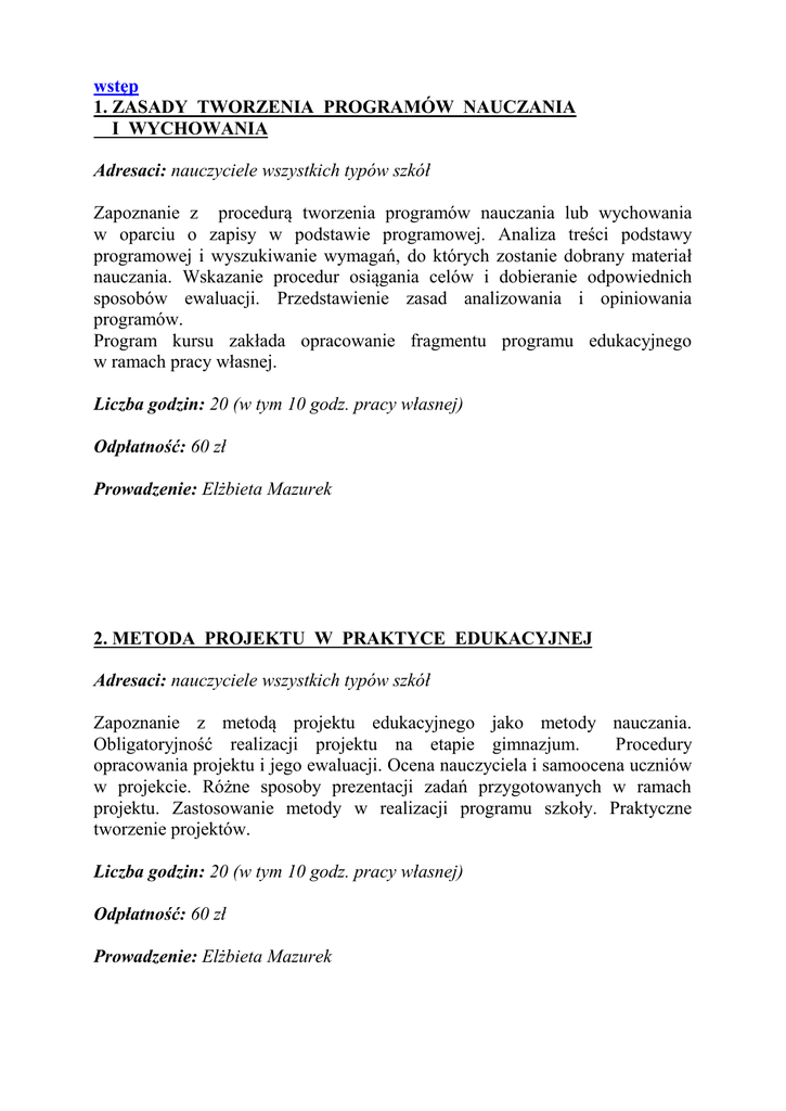 wstęp 1. ZASADY TWORZENIA PROGRAMÓW NAUCZANIA I WYCHOWANIA Adresaci: nauczyciele wszystkich typów szkół Zapoznanie z procedurą tworzenia programów nauczania lub wychowania w oparciu o zapisy w podstawie programowej. Analiza treści podstawy programowej i wyszukiwanie wymagań, do których zostanie dobrany materiał nauczania. Wskazanie procedur osiągania celów i dobieranie odpowiednich sposobów ewaluacji. Przedstawienie zasad analizowania i opiniowania programów. Program kursu zakłada opracowanie fragmentu programu edukacyjnego w ramach pracy własnej. Liczba godzin: 20 (w tym 10 godz. pracy własnej) Odpłatność: 60 zł Prowadzenie: Elżbieta Mazurek 2. METODA PROJEKTU W PRAKTYCE EDUKACYJNEJ Adresaci: nauczyciele wszystkich typów szkół Zapoznanie z metodą projektu edukacyjnego jako metody nauczania. Obligatoryjność realizacji projektu na etapie gimnazjum. Procedury opracowania projektu i jego ewaluacji. Ocena nauczyciela i samoocena uczniów w projekcie. Różne sposoby prezentacji zadań przygotowanych w ramach projektu. Zastosowanie metody w realizacji programu szkoły. Praktyczne tworzenie projektów. Liczba godzin: 20 (w tym 10 godz. pracy własnej) Odpłatność: 60 zł Prowadzenie: Elżbieta Mazurek 3. NAUCZYCIEL A PROCES OCENIANIA Adresaci: zainteresowani nauczyciele Czym jest ocenianie? Podstawowe definicje: sprawdzanie, ocenianie, ewaluacja. Funkcje oceniania w systemie edukacji. Cele i rodzaje oceniania. Porównanie oceniania wewnętrznego i zewnętrznego. Funkcje wewnętrznego systemu oceniania. Szkolne i przedmiotowe systemy oceniania. Ocenianie kształtujące. Problemy oceniania. Czego ocenianie uczy dzieci? Etyczne kwestie i pułapki oceniania. Uczniowskie strategie w ukrytym programie oceniania. Ocenianie w opinii uczniów. Dekalog oceniania. Funkcje informacji zwrotnej. Trudna sztuka komunikowania wyników, czyli o czym powinien pamiętać nauczyciel komunikujący uczniom ocenę ich osiągnięć. Liczba godzin: 12 (w tym 4 pracy własnej) Odpłatność: 45 zł Prowadzenie: Elżbieta Mazurek 4. TWORZENIE NARZĘDZI POMIARU DYDAKTYCZNEGO Adresaci: nauczyciele tworzący narzędzia pomiaru dydaktycznego Podstawa programowa napisana w języku wymagań a sprawdzanie poziomu osiągnięć uczniów. Typologia pisemnych zadań testowych. Zalety i wady zadań testowych – otwartych i zamkniętych. Dylematy w doborze zadań testowych. Etapy tworzenia testu sprawdzającego osiągnięcia ucznia. Zasady tworzenia zadań i najczęściej popełniane błędy podczas konstruowania poszczególnych rodzajów zadań. Przygotowanie planu testu i kartoteki zadań. Liczba godzin: 16 (w tym 8 pracy własnej) Odpłatność: 45 zł Prowadzenie: Elżbieta Mazurek 5. DZIECKO Z ZESPOŁEM NADPOBUDLIWOŚCI PSYCHORUCHOWEJ I DEFICYTEM UWAGI Adresaci: nauczyciele klas I – III, nauczyciele klas „0”, pedagodzy szkół podstawowych Etiologia i częstotliwość zaburzenia. Typy nadpobudliwości psychoruchowej, rozpoznawanie dziecka z ADHD. Sytuacja dziecka nadpobudliwego w szkole, zasady postępowania z dzieckiem hiperkinetycznym. Techniki radzenia sobie z trudnymi zachowaniami. Rola uwagi w procesie poznawczym. Rozwój uwagi dziecka oraz czynniki wpływające na jej jakość. Redagowanie opinii do ośrodków diagnostycznych. Współpraca z rodzicami dziecka z ADHD. Liczba godzin: 16 Odpłatność: 60 zł Prowadzenie: Renata Wolińska 6. MOTYWOWANIE UCZNIÓW DO PRACY WYZWANIEM DLA NAUCZYCIELA Adresaci: nauczyciele szkół podstawowych Główne mechanizmy regulujące proces motywacji. Charakterystyka procesów umysłowych mających wpływ na motywację: emocje, uwaga, osobowość. Czynniki wpływające na jakość motywacji. Rodzaje oraz warunki konieczne do procesu kształtowania się motywacji. Główne motywy skłaniające ucznia do pracy. Humanistyczna teoria Maslowa. Typologia uczniów ze względu na właściwości motywacji. Prawa motywacyjne. Podstawowe zasady podtrzymywania, sterowania i mobilizowania motywacji uczniów. Zasady konstruktywnej krytyki. Liczba godzin: 10 Odpłatność: 40 zł Prowadzenie: Renata Wolińska 7. SPOSOBY RADZENIA SOBIE Z TRUDNYMI EMOCJAMI W PRACY Z UCZNIEM I RODZICAMI Adresaci: nauczyciele wszystkich typów szkół Specyfika reakcji emocjonalnych: mechanizm powstawania emocji, emocje pozytywne i negatywne, stres – źródła i mechanizm reakcji stresowej. Na czym polega „praca emocjonalna”?: formy pracy nad własnymi emocjami, forma płytka i głęboka. Techniki regulacji własnych emocji – charakterystyka i ich konsekwencje: techniki korygujące rozwiniętą już emocję, techniki wyprzedzające rozwój emocji, skuteczność obu technik. Zasady profilaktyki negatywnych skutków stresu: 3 obszary działań wzmacniających odporność na stres, pojęcie bilansu emocjonalnego. Model komunikacji asertywnej. Wpływ asertywnych komunikatów na relację nauczyciel – uczeń oraz nauczyciel – rodzic. Model komunikacji empatycznej. Zasady prowadzenia rozmowy zgodnie z założeniami empatii. Porównanie obu modeli – podobieństwa i różnice. Liczba godzin: 8 Odpłatność: 45 zł Prowadzenie: Małgorzata Moczulska 8. PROFILAKTYKA WYPALENIA ZAWODOWEGO – SEMINARIUM Adresaci: nauczyciele wszystkich typów szkół Wypalenie zawodowe – istota i dynamika zmian w sposobie myślenia i reagowaniu emocjonalnym nauczyciela. Czynniki sprzyjające nasileniu objawów wypalenia zawodowego oraz czynniki odporności. Profilaktyka wypalenia w zakresie: profesjonalnego kontaktu z uczniem i jego rodzicem, radzenia sobie ze stresem, nastawienia do pracy, oddzielania od pracy życia prywatnego, skutecznego odpoczynku i relaksacji (techniki oddechowe i wizualizacyjne). Liczba godzin: 4 Odpłatność: 25 zł Prowadzenie: Małgorzata Moczulska 9. ZASADY PROWADZENIA SKUTECZNYCH SPOTKAŃ Z RODZICAMI – SEMINARIUM Adresaci: nauczyciele wszystkich typów szkół Przywódcza rola nauczyciela – budowanie autorytetu własnego i klimatu współpracy: przygotowanie aspektó
