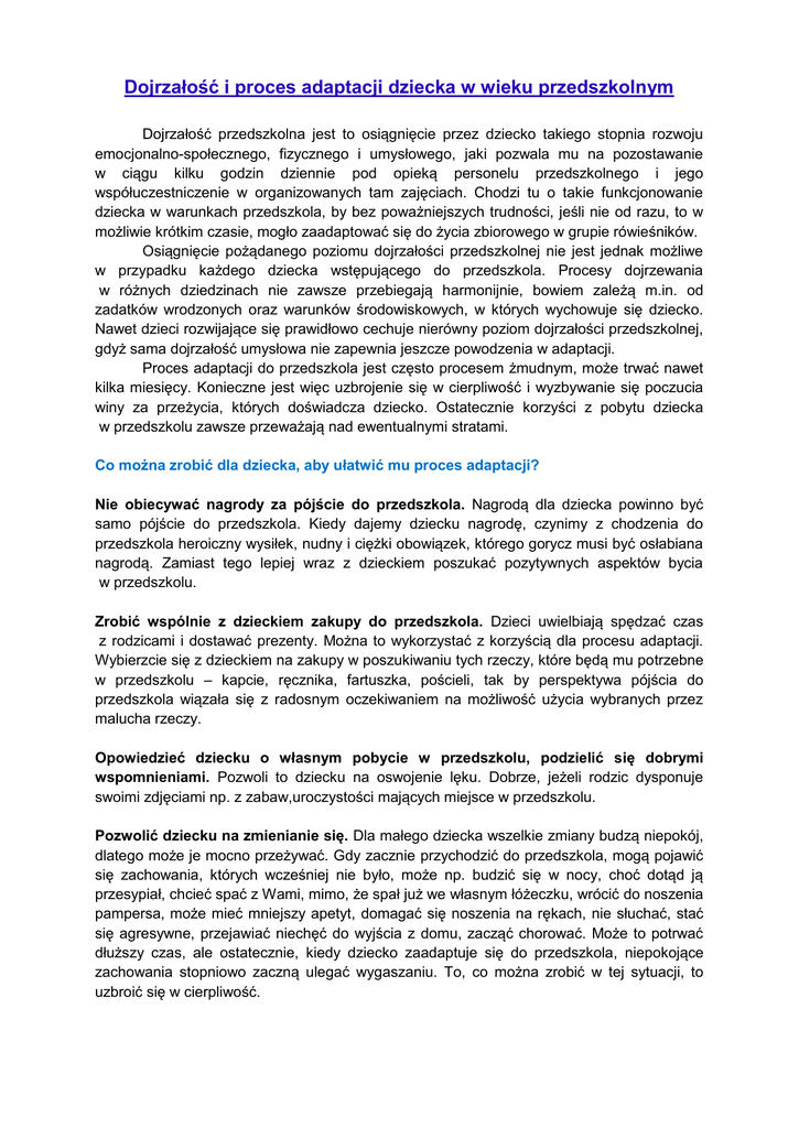 w przypadku każdego dziecka wstępującego do przedszkola. Procesy dojrzewania